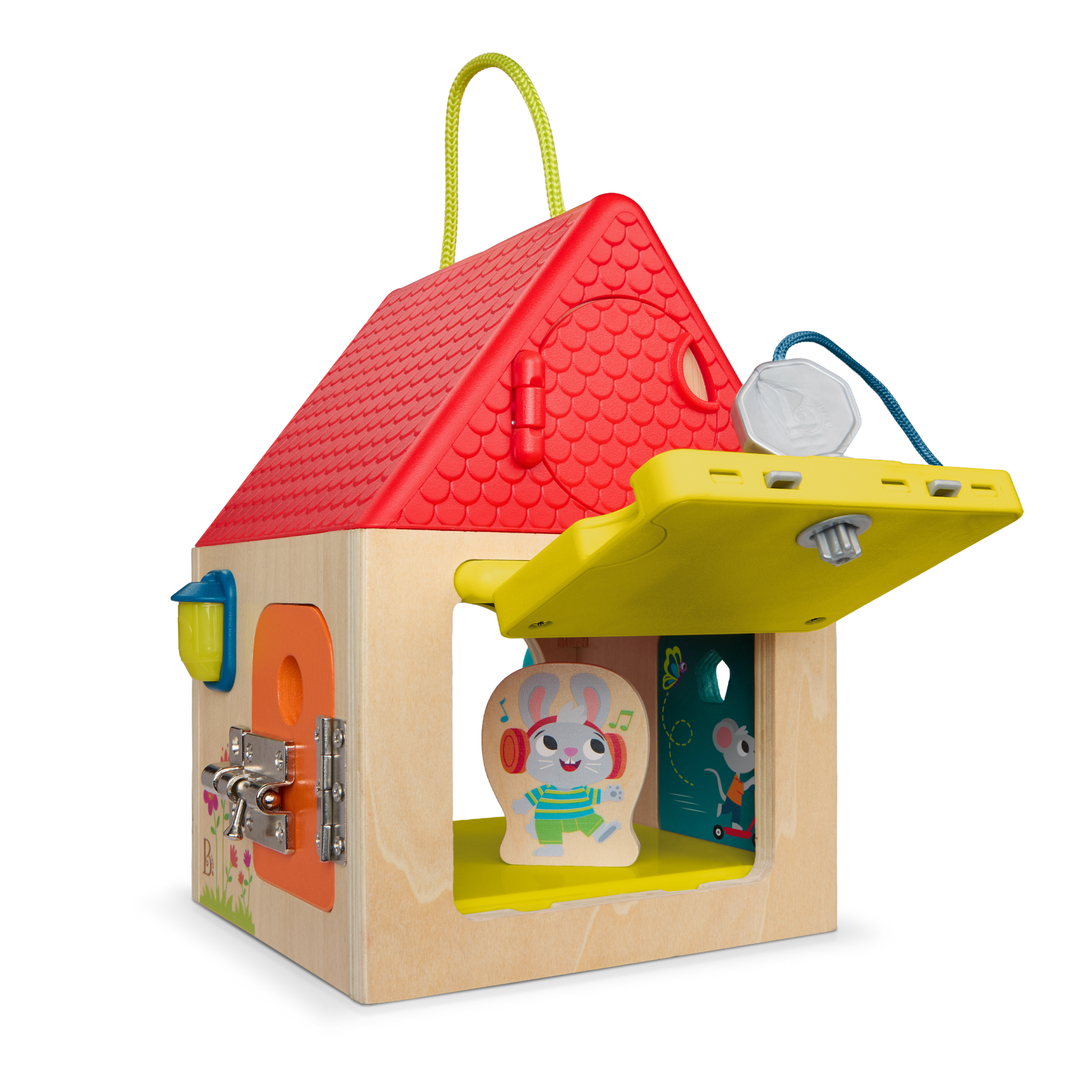 Discover more behind every door with the Unlock & Learn Box from B. toys! This sturdy wooden lock box toy is also a friendly neighborhood house with lots of nooks and crannies to explore. Start with the two hardware latches, one bar and one chain, and peek inside the house to meet a friendly bunny. Don't forget to ring the bell! Kids can also turn on the porch light before moving on. Ok, ok, now it's time for the keys. Unlock the doors with the two keys and turn 'em to get inside – kids will discover a rotating weather carousel on the garage and a fun illustration inside the door! Next up is the windows. Pop 'em open to find a lil' cuckoo bird and other surprises! This dexterity lock box is great for improving kids' problem-solving skills and improving fine motor function. Batteries (2xAAA) are required and included.