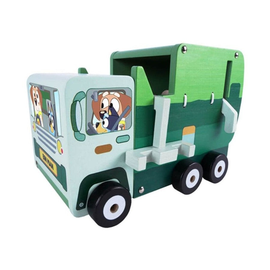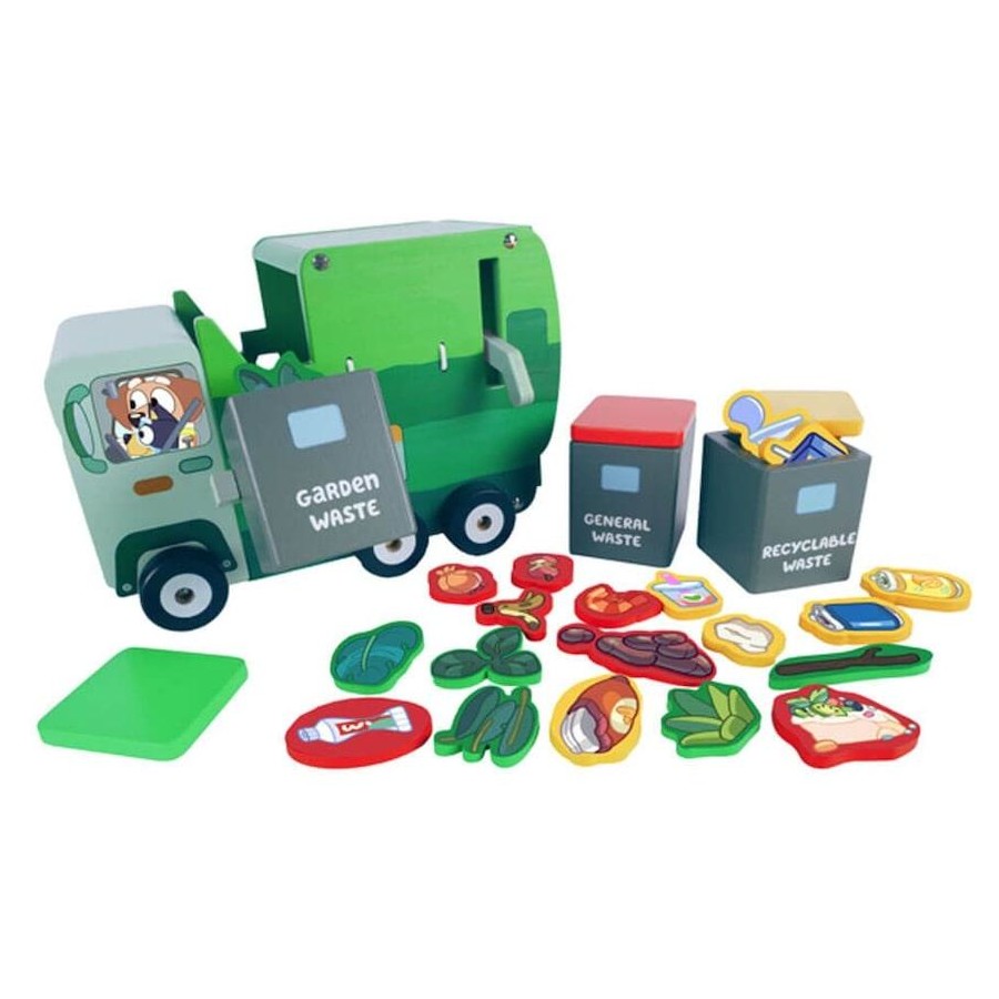 It's Bin Night for Bluey's home! Let's hit the roads with Bluey and the Bin Man to collect waste with his Wooden Garbage Truck Set. Guided by colour, organise your waste into the correct bins; drive the Garbage Truck towards to the bins then use the lifting arm on the side of the tuck to empty your bins into the back! Easy storage as everything fits inside the back of the truck.