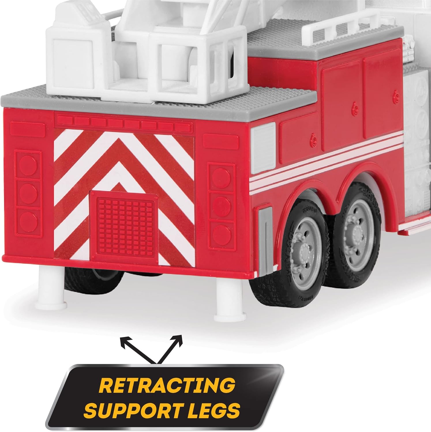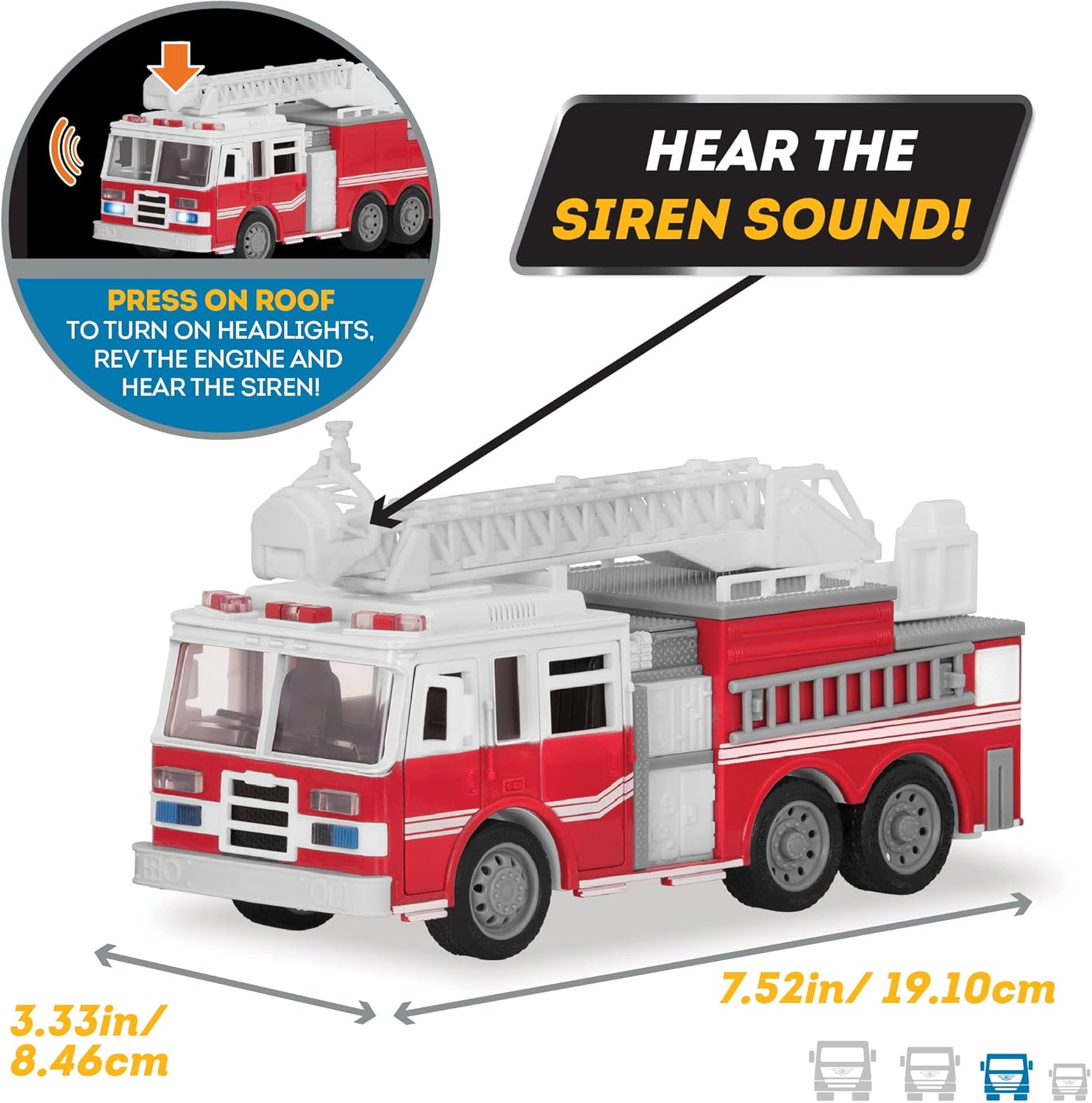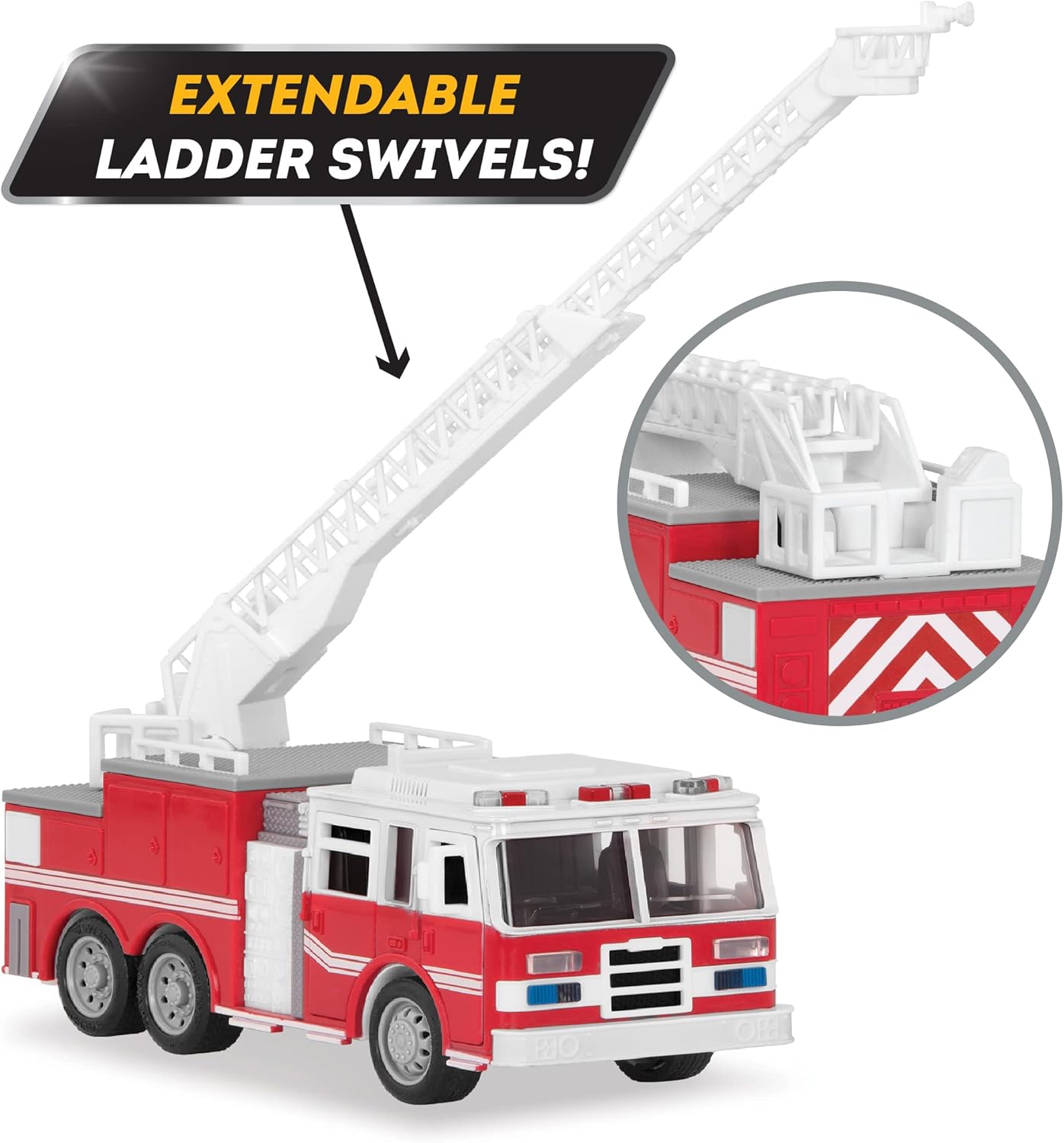 Take out fires at great heights with the extendable ladder, retractable support legs and other moving parts. Press the roof for working headlights, rev the engine and hear the siren. Measures 7.5". Requires three AG13 batteries (included).