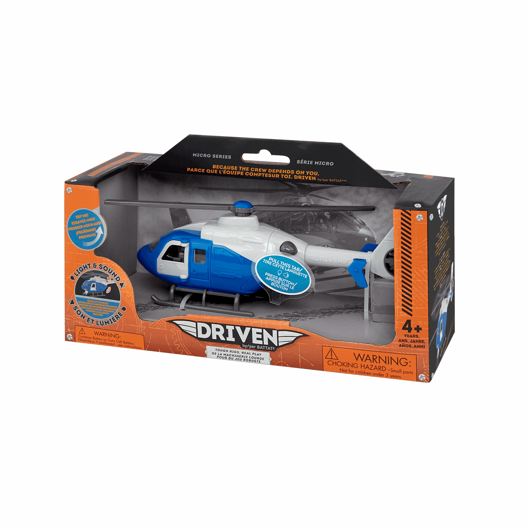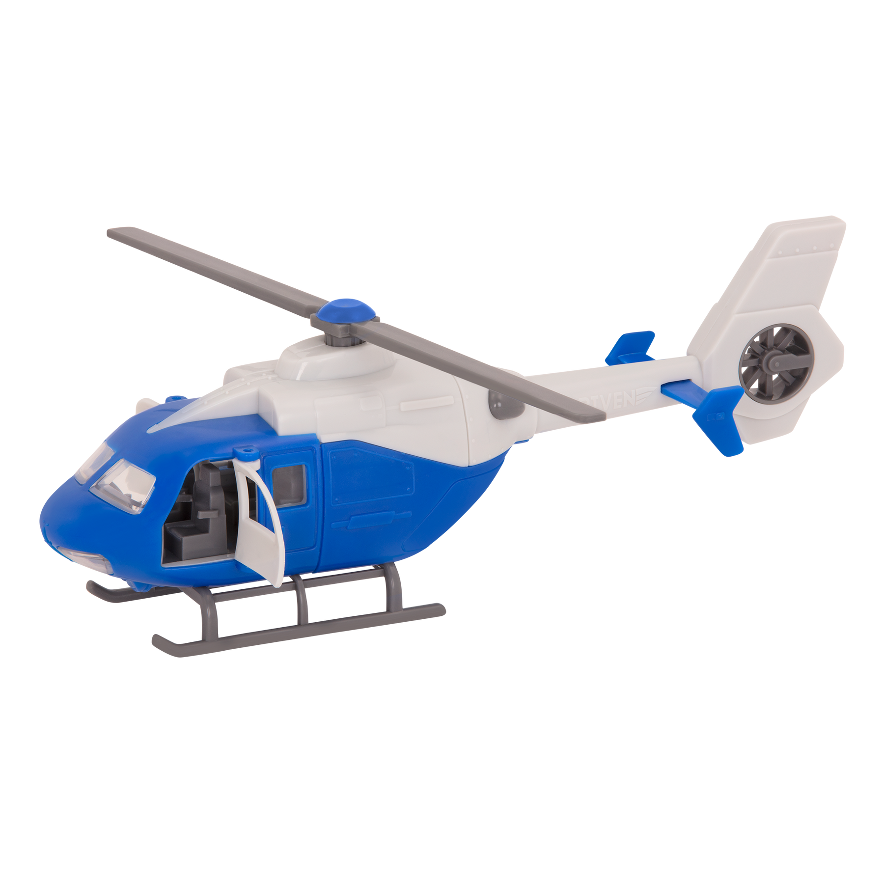 Join the rescue crew with the Micro Helicopter from DRIVEN by Battat! This miniature toy helicopter has lots of cool features to make it look just like the real thing. Press the exhaust button and watch the propeller as it spins in the air! You can open the doors to take a peek inside once you’re back on the ground. The helicopter also has two LED spotlights at the front, so you can fly in the dark. It even makes a realistic sound! Stay DRIVEN, because the crew depends on you!