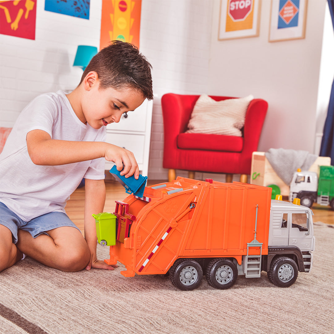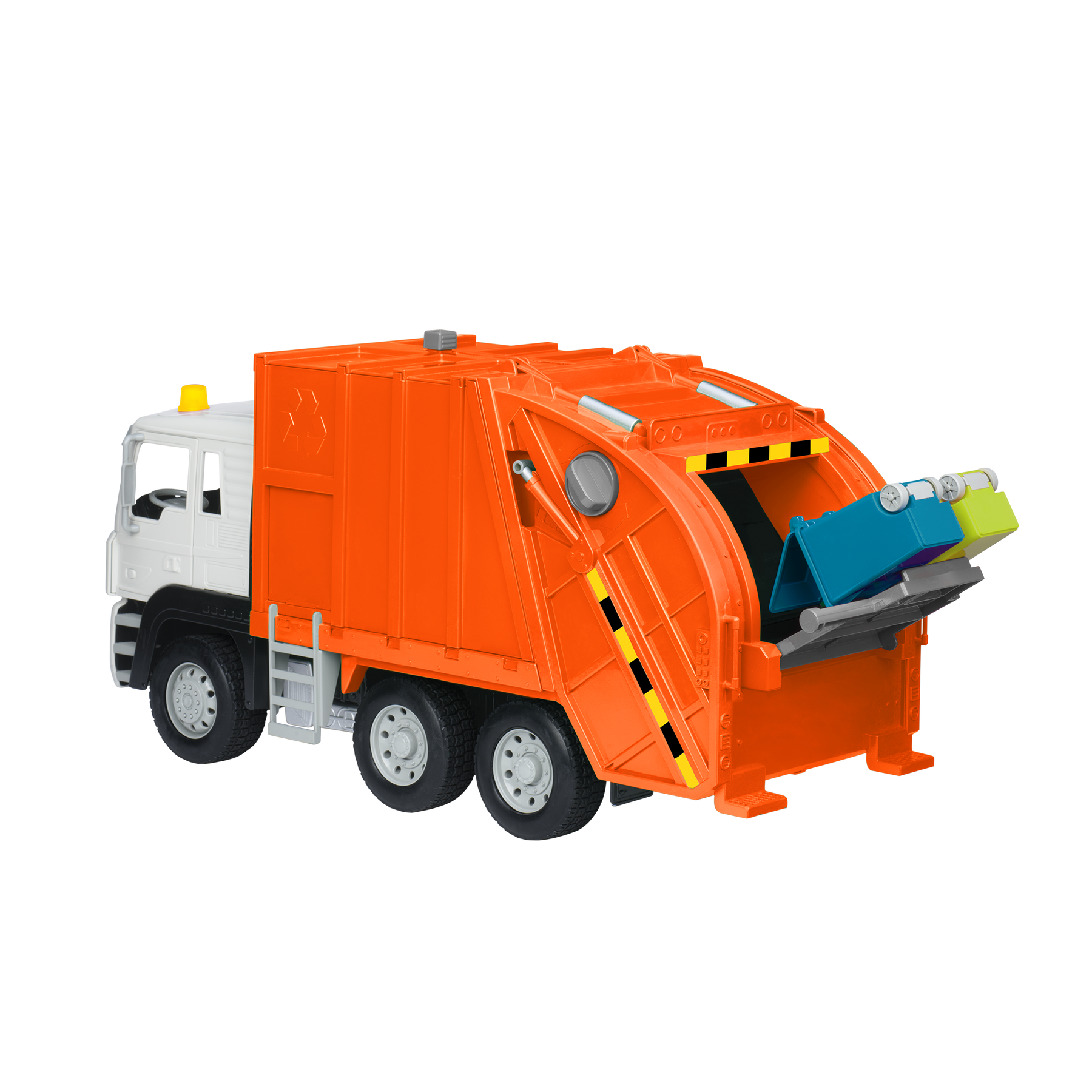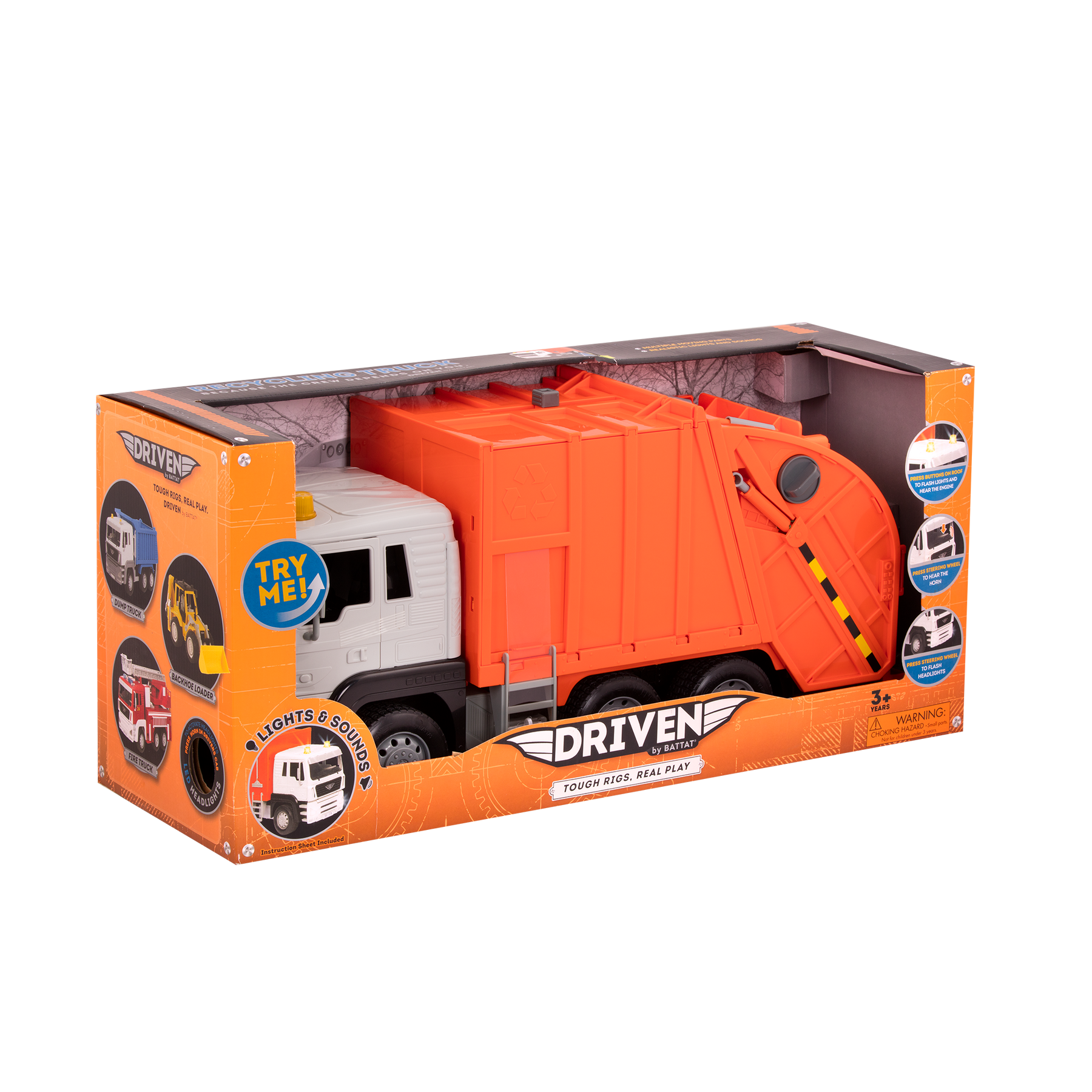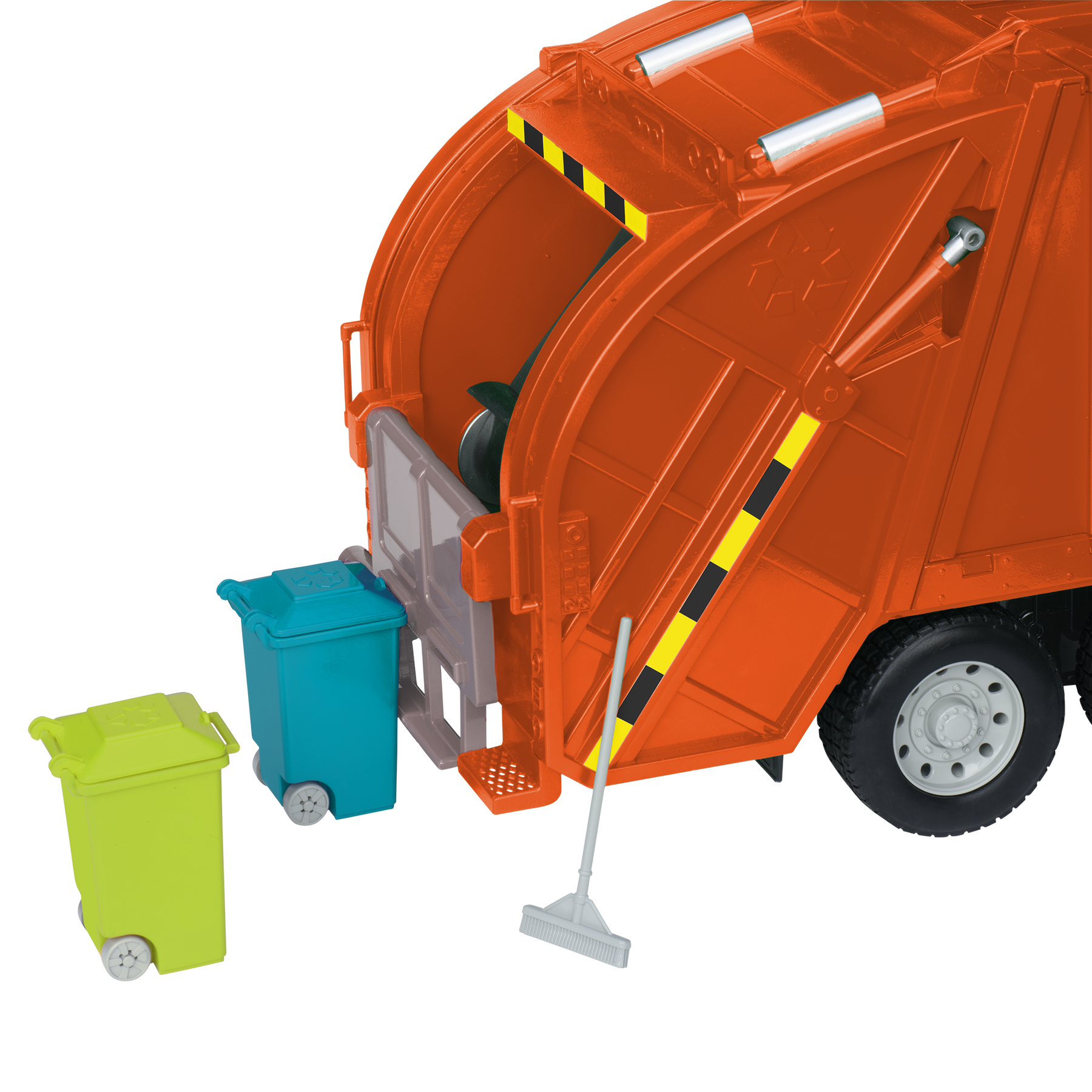Keep your town tidy with the Recycling Truck from DRIVEN by Battat! This orange toy truck is packed with cool features for hours of playtime. The doors open so you can see the detailed interior, and you can tilt the cab to check out the engine. Want to hear it rev? Press on the roof! You can also tap the steering wheel to honk the horn or flash the headlights, so the neighbors will know it’s time to take out the trash! This toy vehicle comes with two bins – attach them to the loading rack, just like a real recycling truck. Don’t forget to pop out the detachable broomstick to keep everything clean!