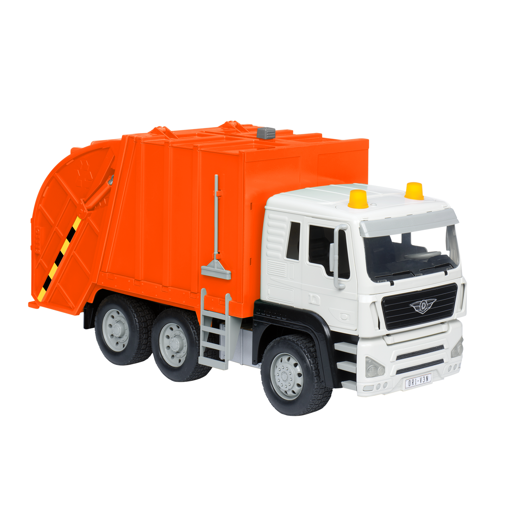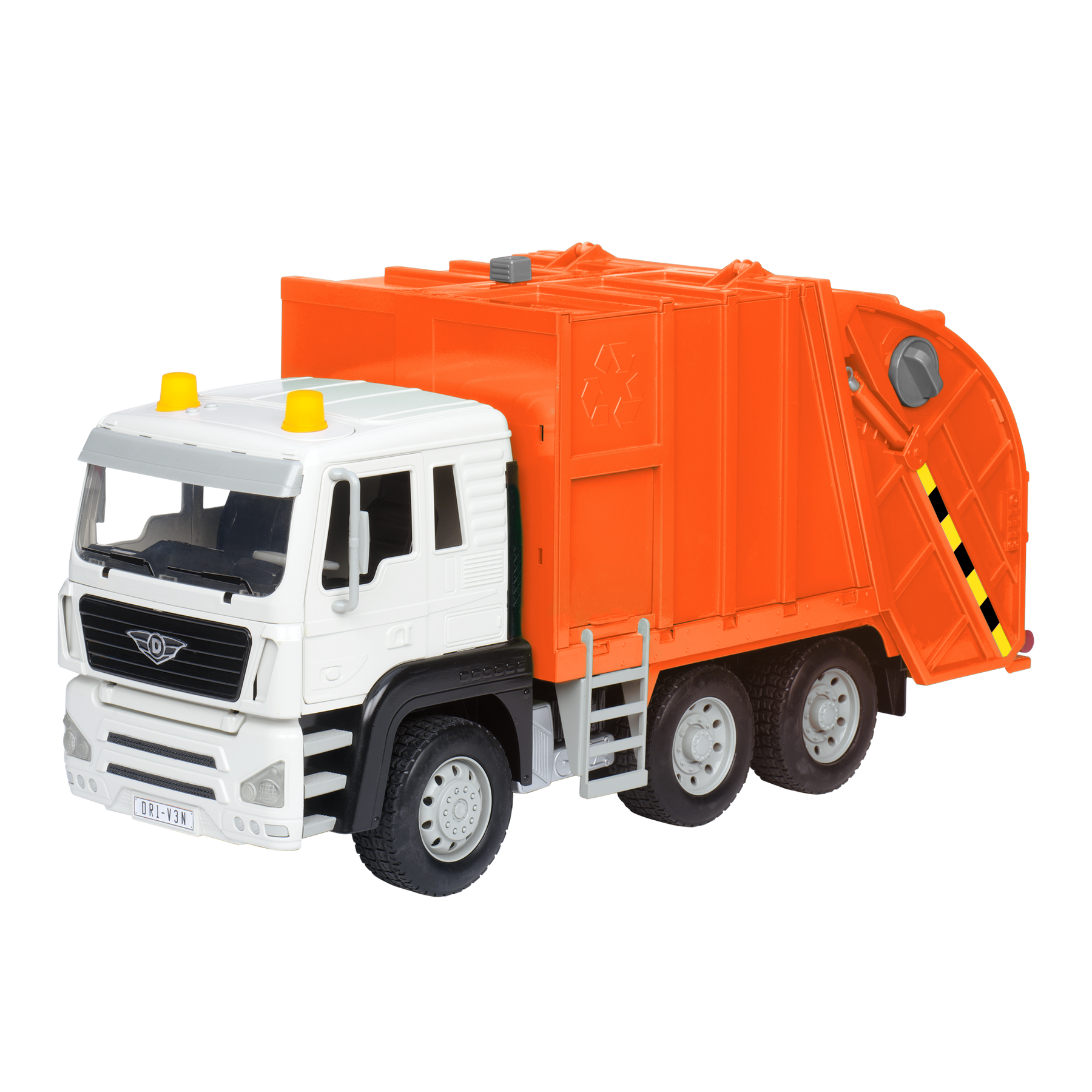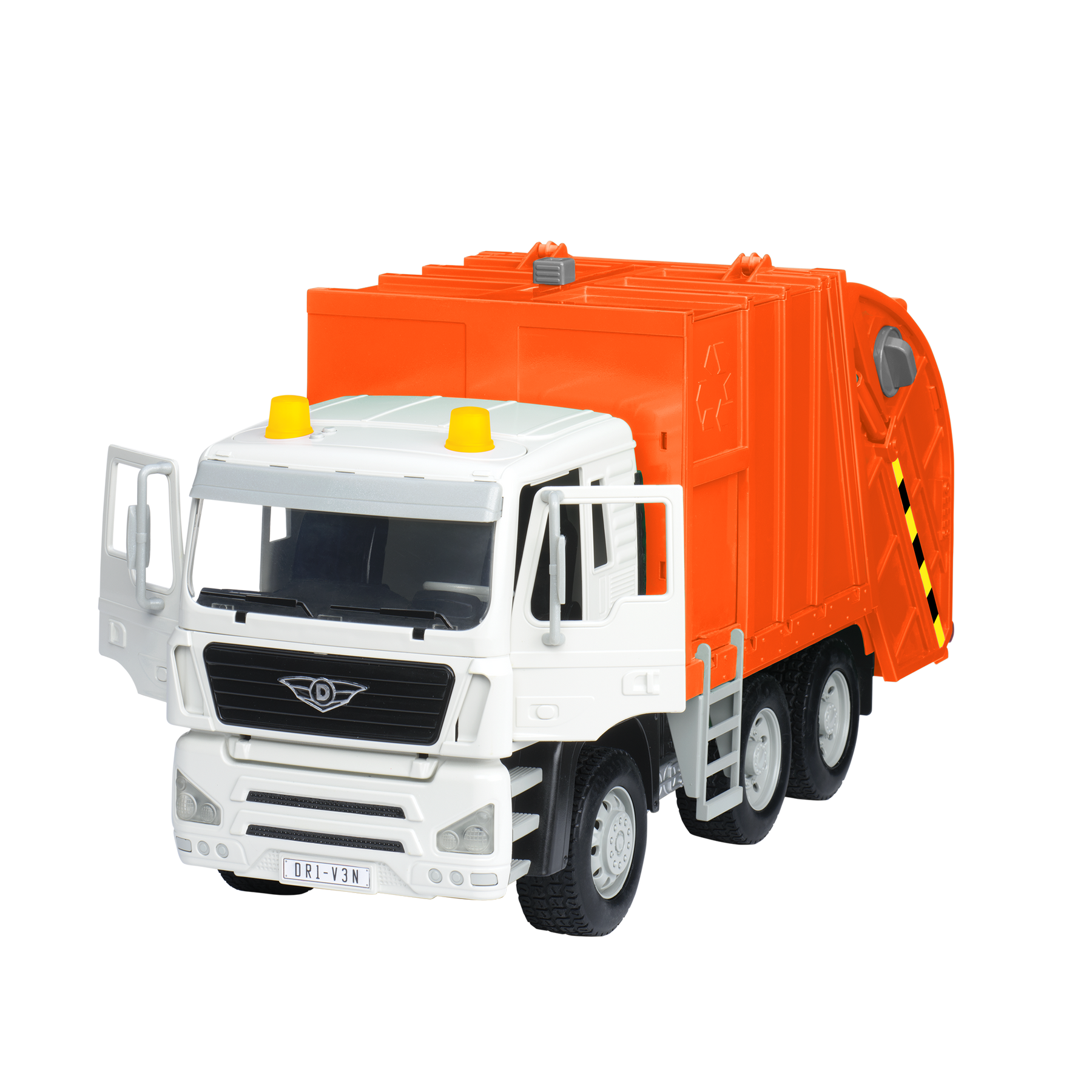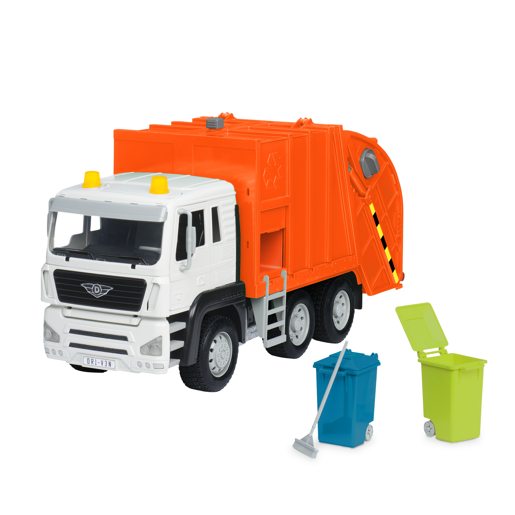 Keep your town tidy with the Recycling Truck from DRIVEN by Battat! This orange toy truck is packed with cool features for hours of playtime. The doors open so you can see the detailed interior, and you can tilt the cab to check out the engine. Want to hear it rev? Press on the roof! You can also tap the steering wheel to honk the horn or flash the headlights, so the neighbors will know it’s time to take out the trash! This toy vehicle comes with two bins – attach them to the loading rack, just like a real recycling truck. Don’t forget to pop out the detachable broomstick to keep everything clean!