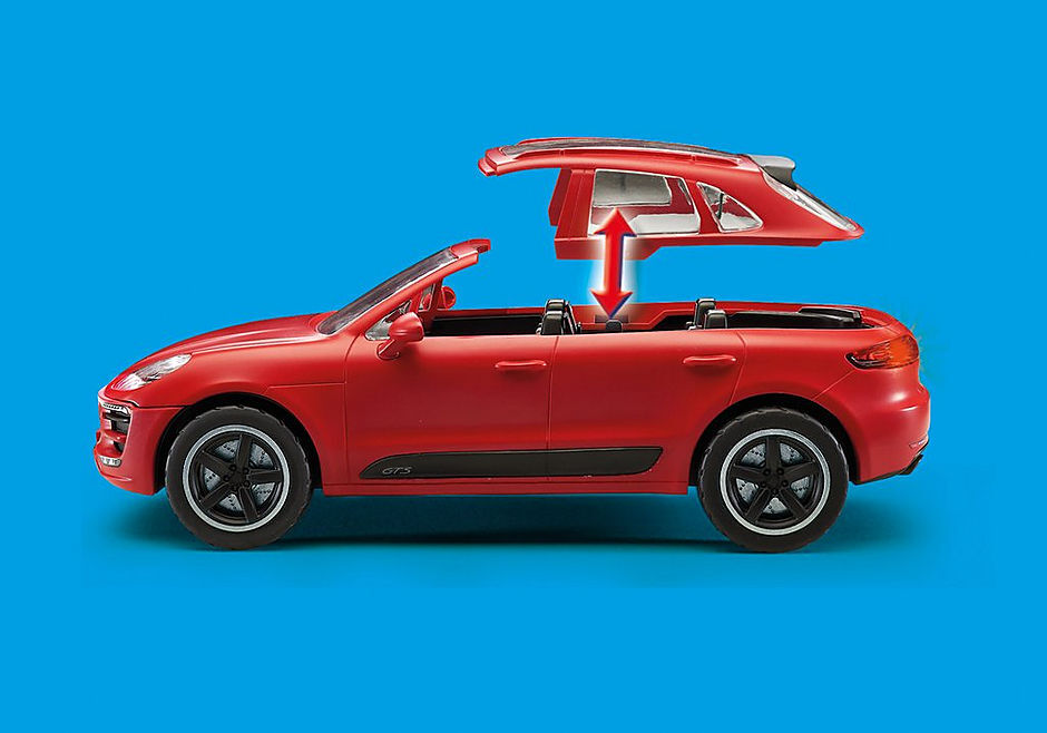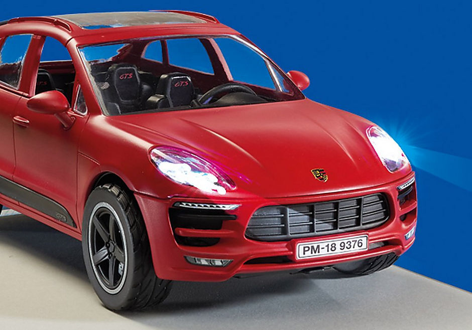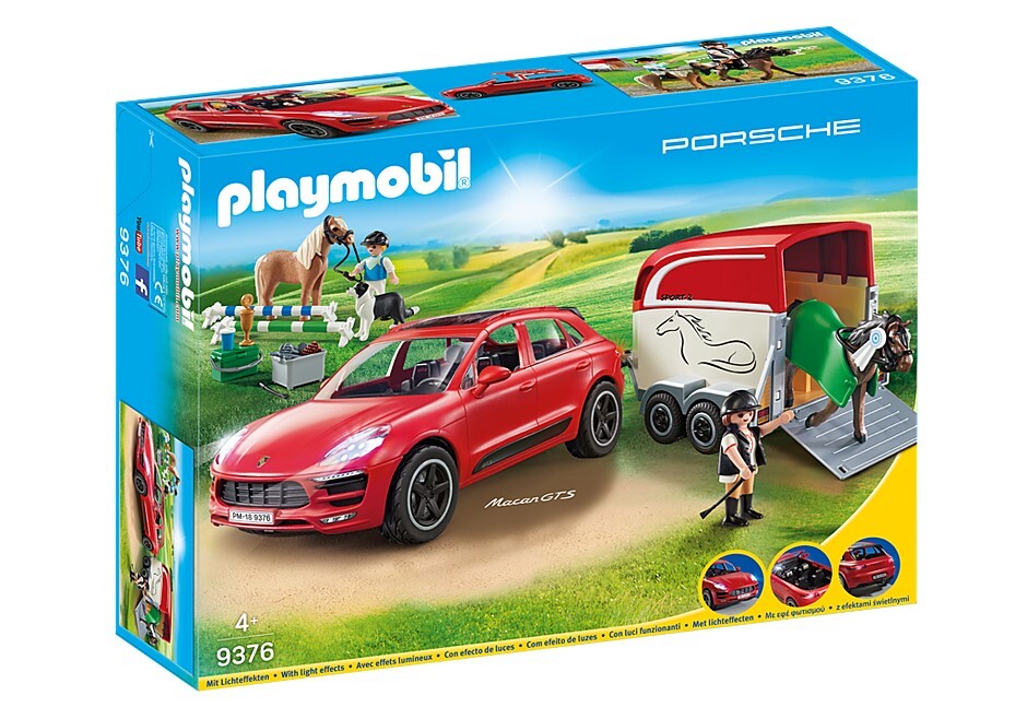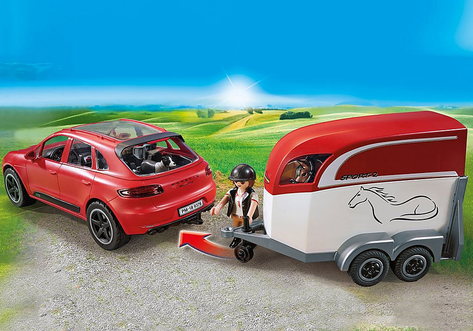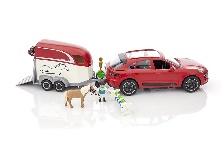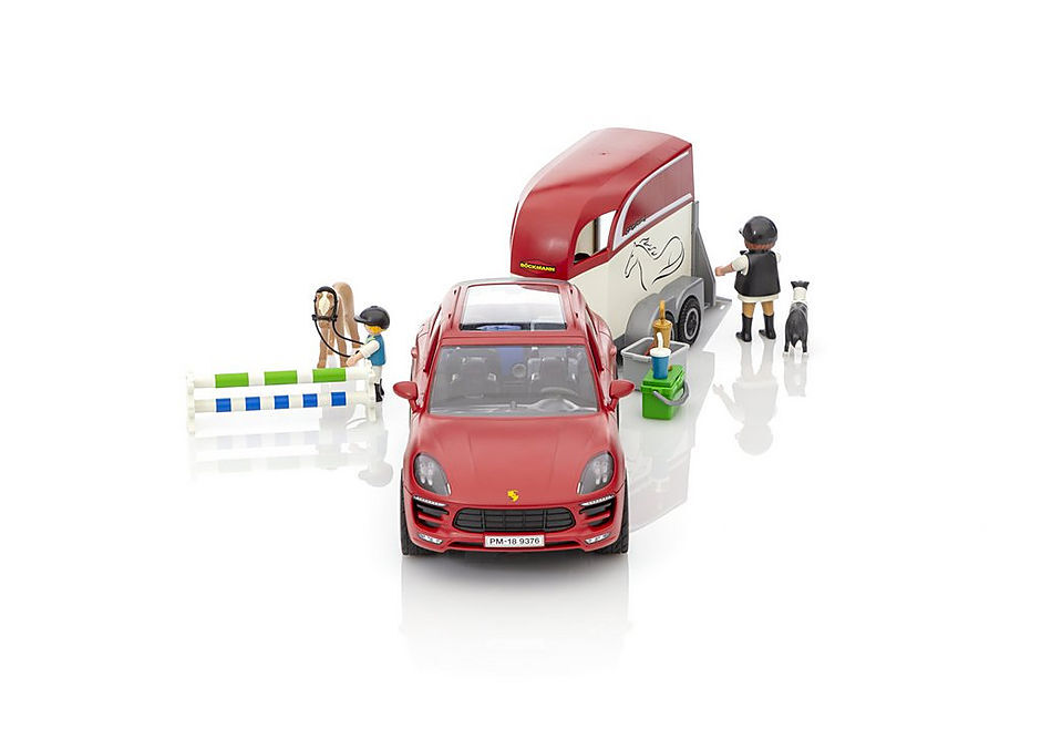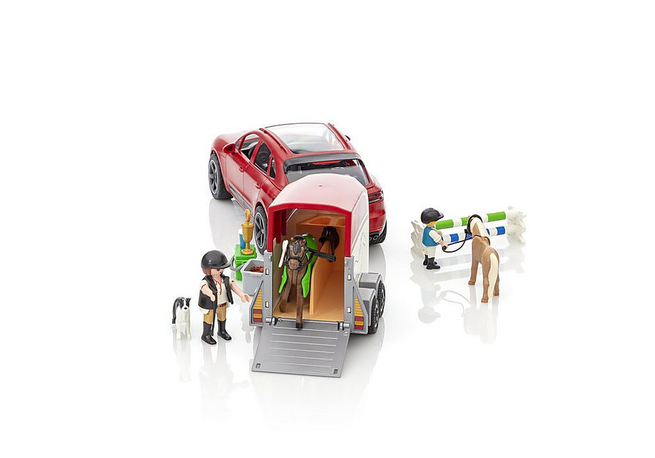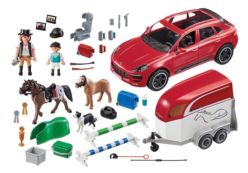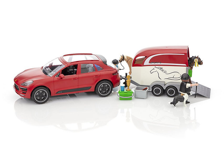 Contents: Porsche, one adult figure, one child figure, horse trailer, dog, car seat, and other accessories.