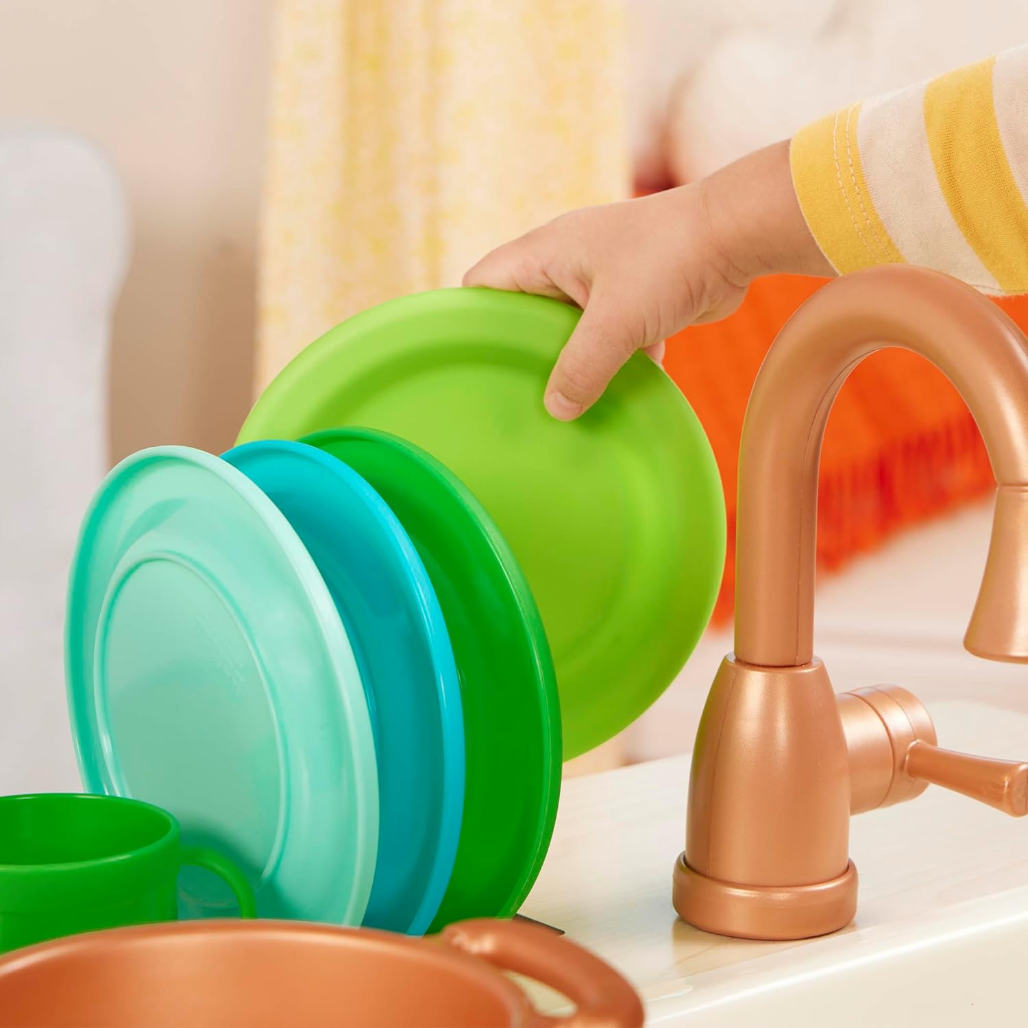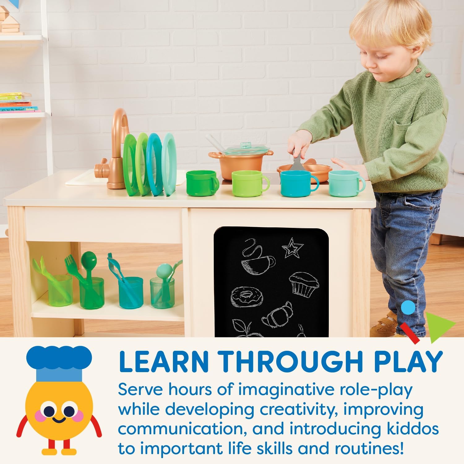 Made of smooth, solid wood and safe for tiny hands, this wooden play kitchen is designed for kids 2 years and up