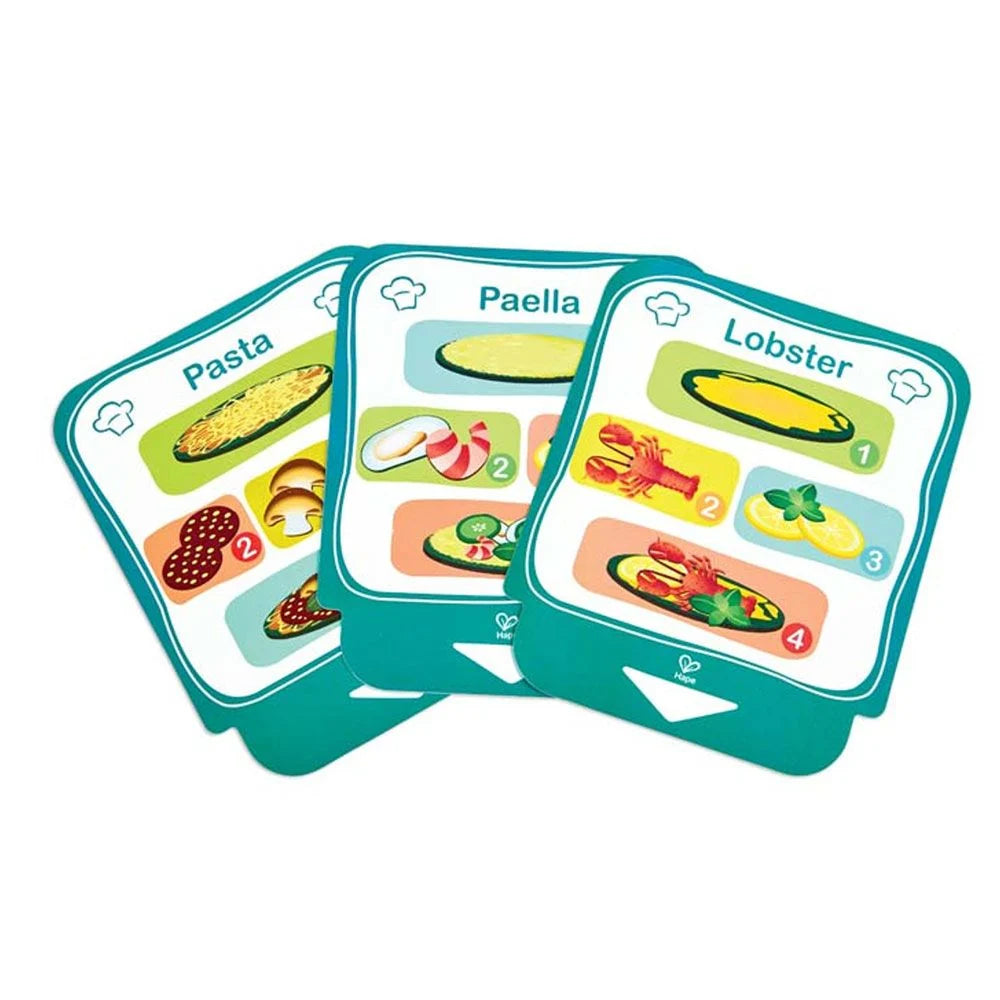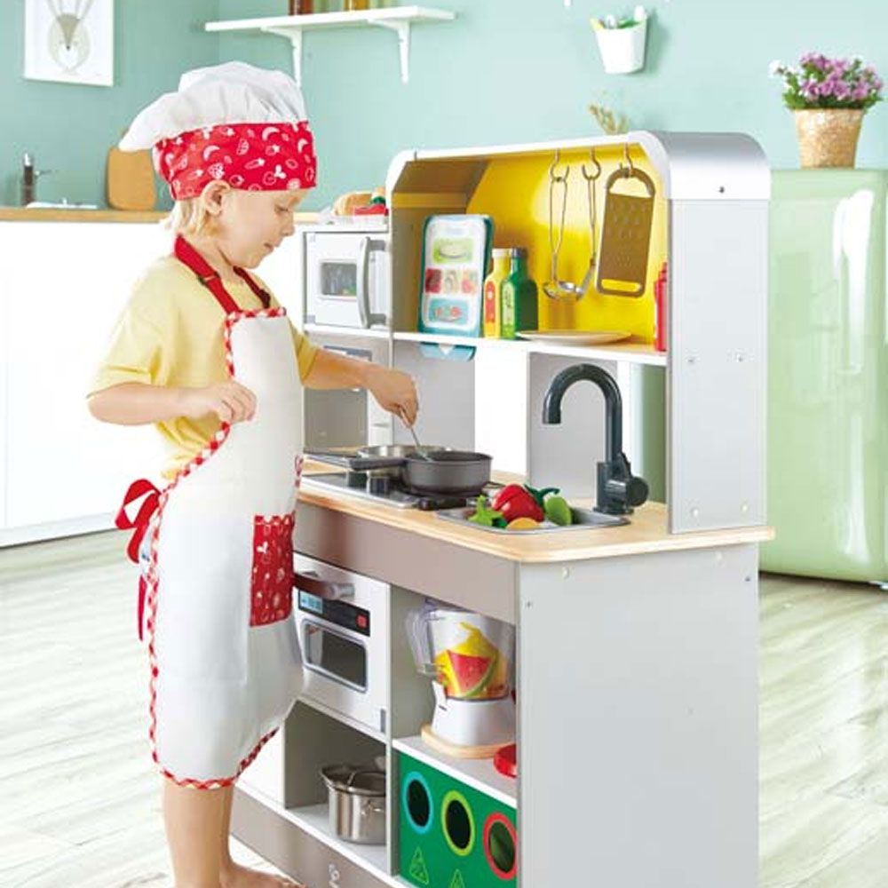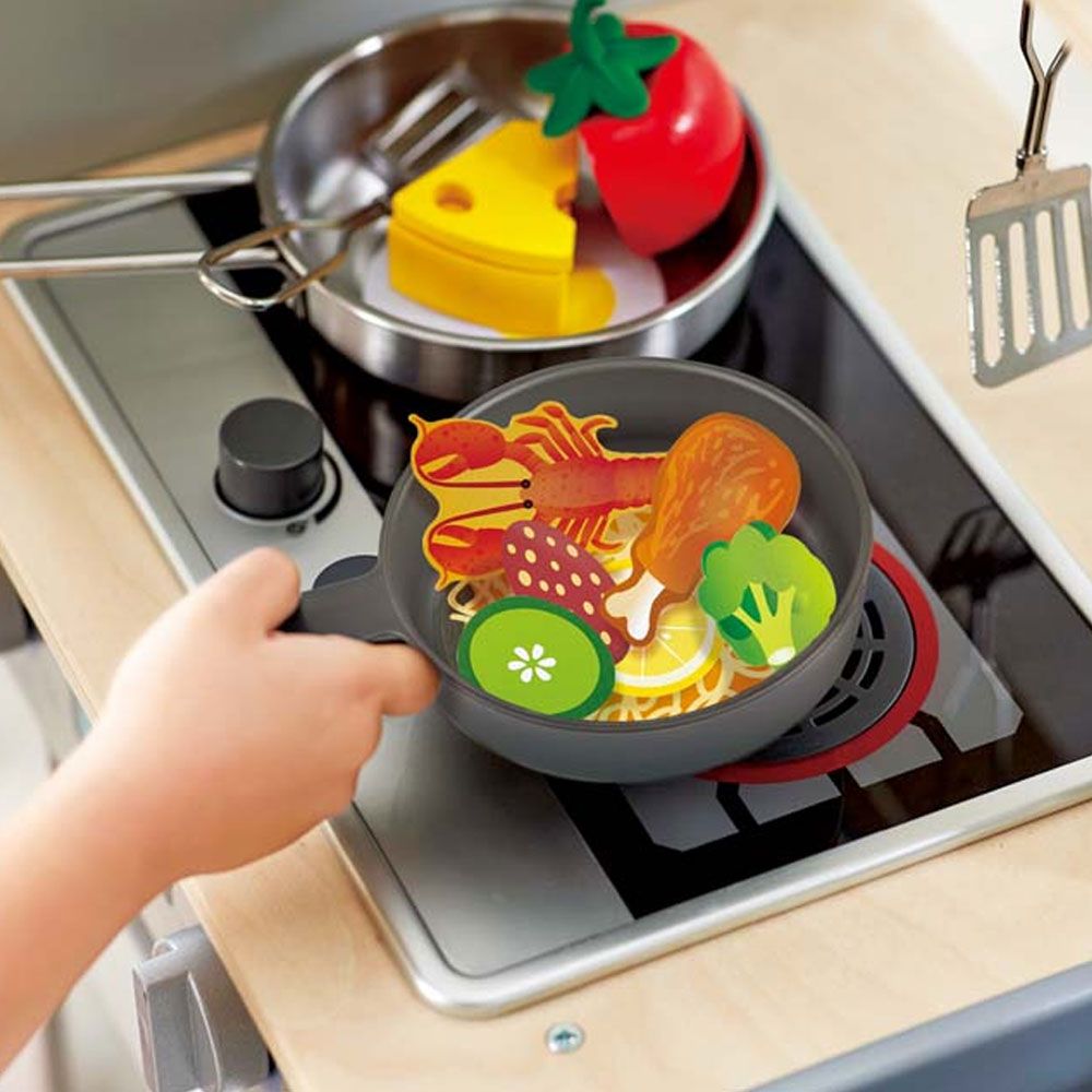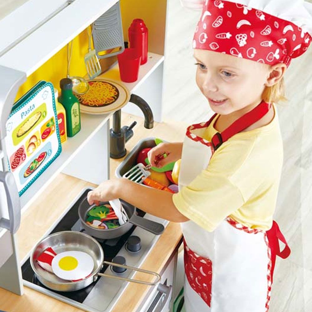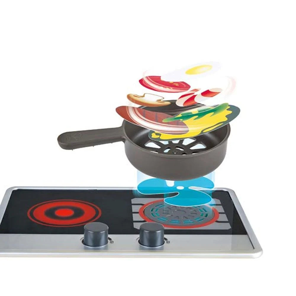 Give your guests a wonderful meal with this great kitchen playset! The kitchen features a spacious play top with an electric stove. The red stove top will light up and make bubbling sounds while the other fryer top will light up blue using the fun fan technology to make the food levitate, turn and shake in your pan! Includes a recycle bin and other accessories, pre-cut food and a recipe book with six dishes to try.