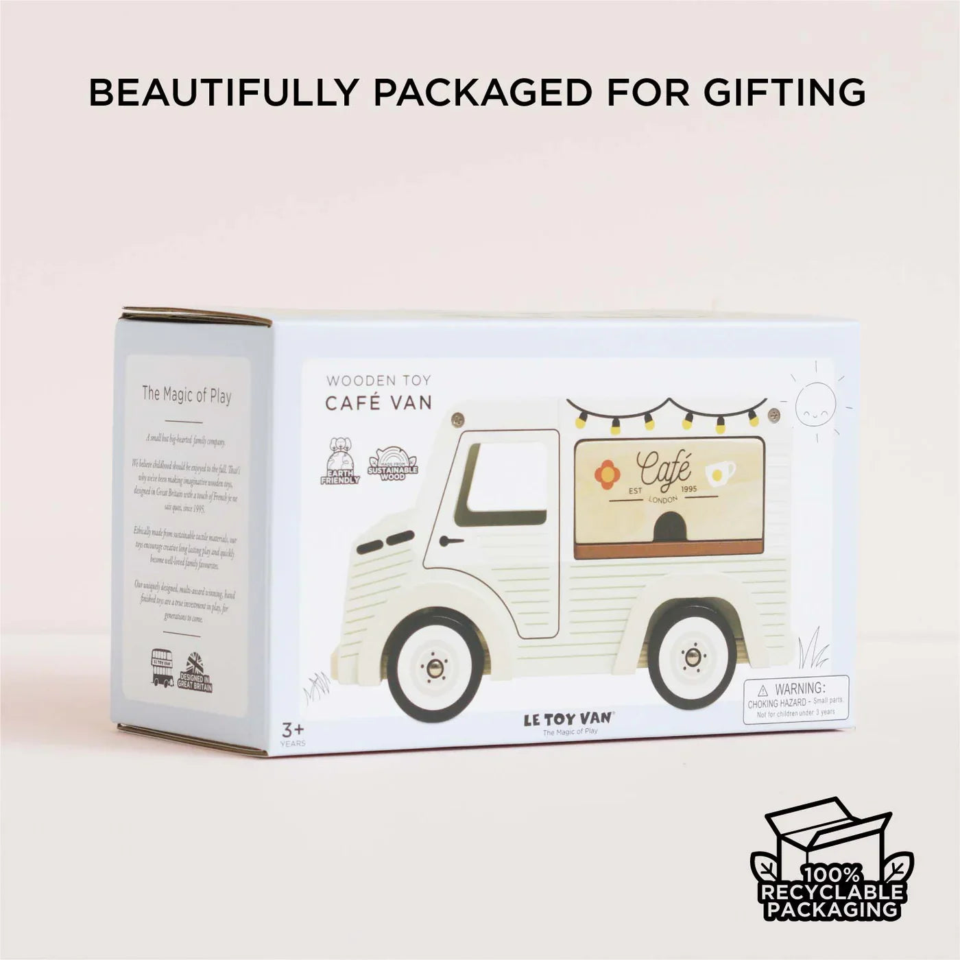 Introduce your little ones to the world of imaginative play with the Wooden Cafe Van, a beautifully crafted toy made from FSC™-certified wood. This vintage-style cafe van is painted in a delightful pistachio green and white, adorned with intricate artwork on all sides, making it a charming addition to any playtime scenario.