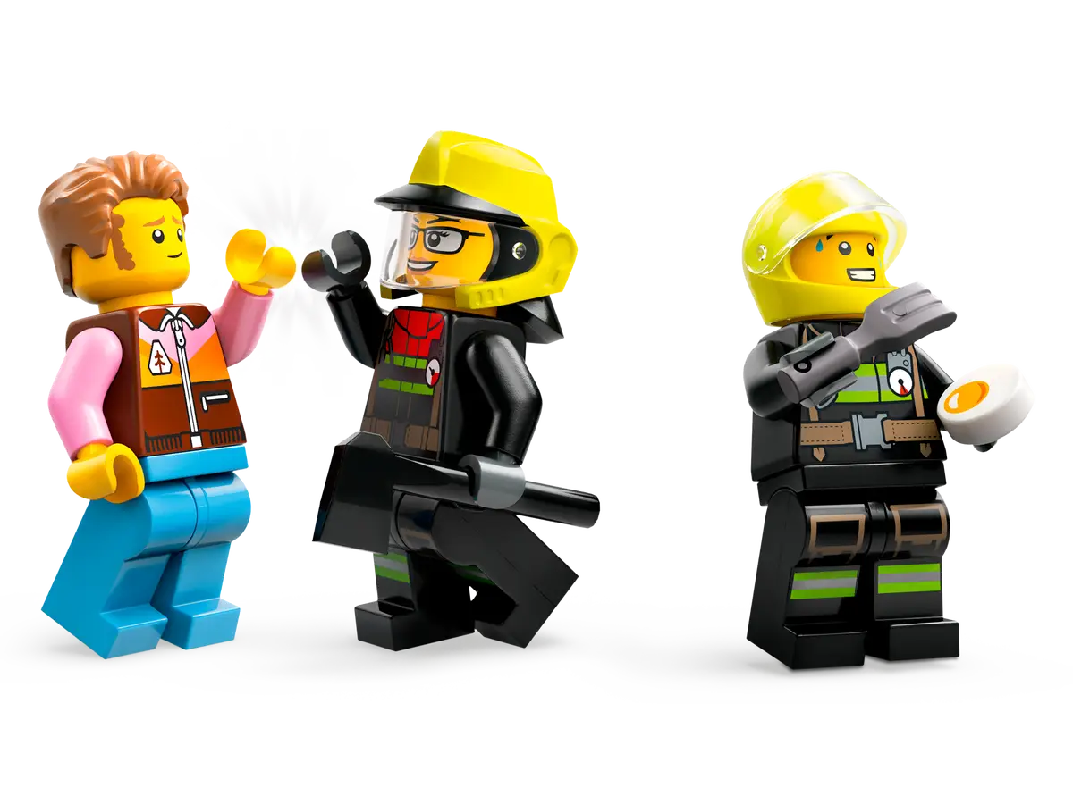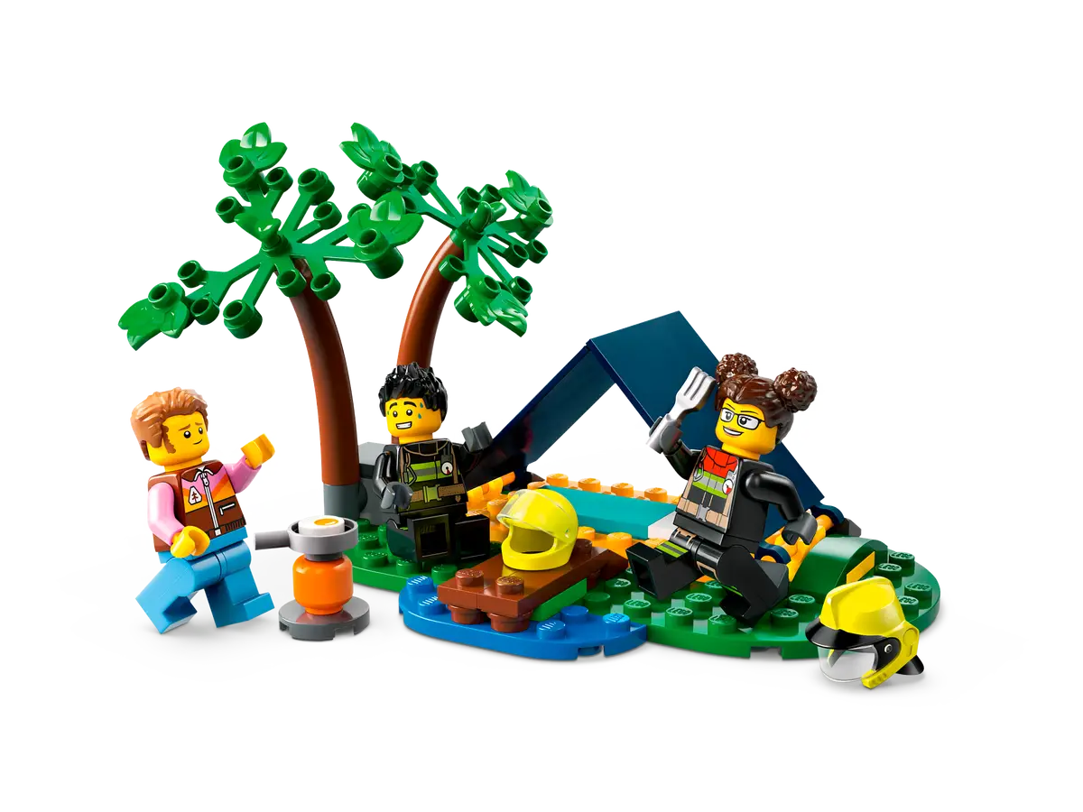 - What’s in this LEGO® building set? – Everything kids need to builda toy 4x4 fire truck, trailer, rescue boat, tent and a camping scene with a campfire, plus a camper and 2 firefighter minifigures