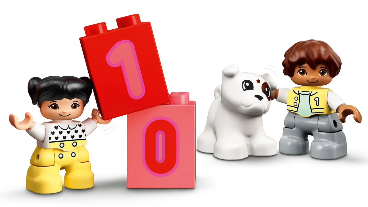 Catch the colorful LEGO® DUPLO® My First Number Train - Learn To Count (10954) toy for preschool kids and introduce toddlers to a world of counting and learning fun! This preschool kids’ counting train comes with 10 number bricks for toddlers to load, unload, stack and sort, plus girl and boy figures and a LEGO DUPLO dog for limitless play-and-learn opportunities.