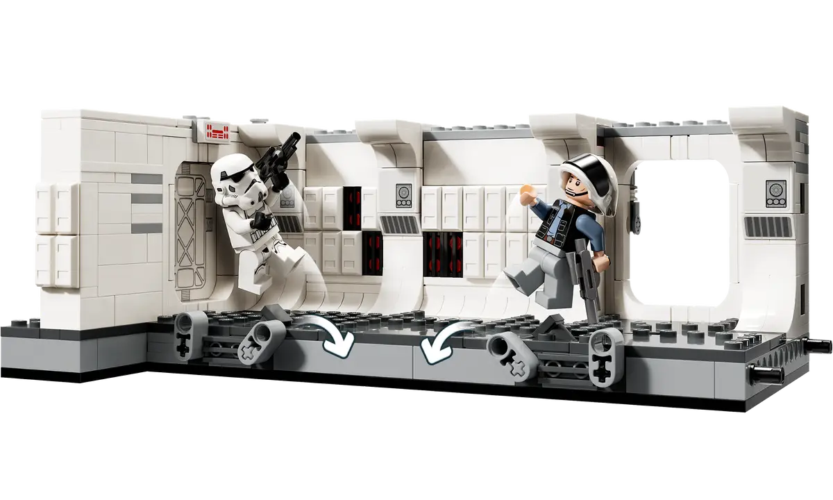 Relive Darth Vader and his Stormtroopers boarding the Tantive IV in Star Wars: A New Hope with this buildable toy playset (75387) for kids aged 8 and over. It features a detailed recreation of the corridor inside Tantive IV where Darth Vader’s Stormtroopers battled Captain Antilles’ Rebel Fleet Troopers, with levers to ‘blast’ open the entrance door and topple characters during battle play. Connectors allow builders to add another 75387 set (sold separately) to extend the corridor.