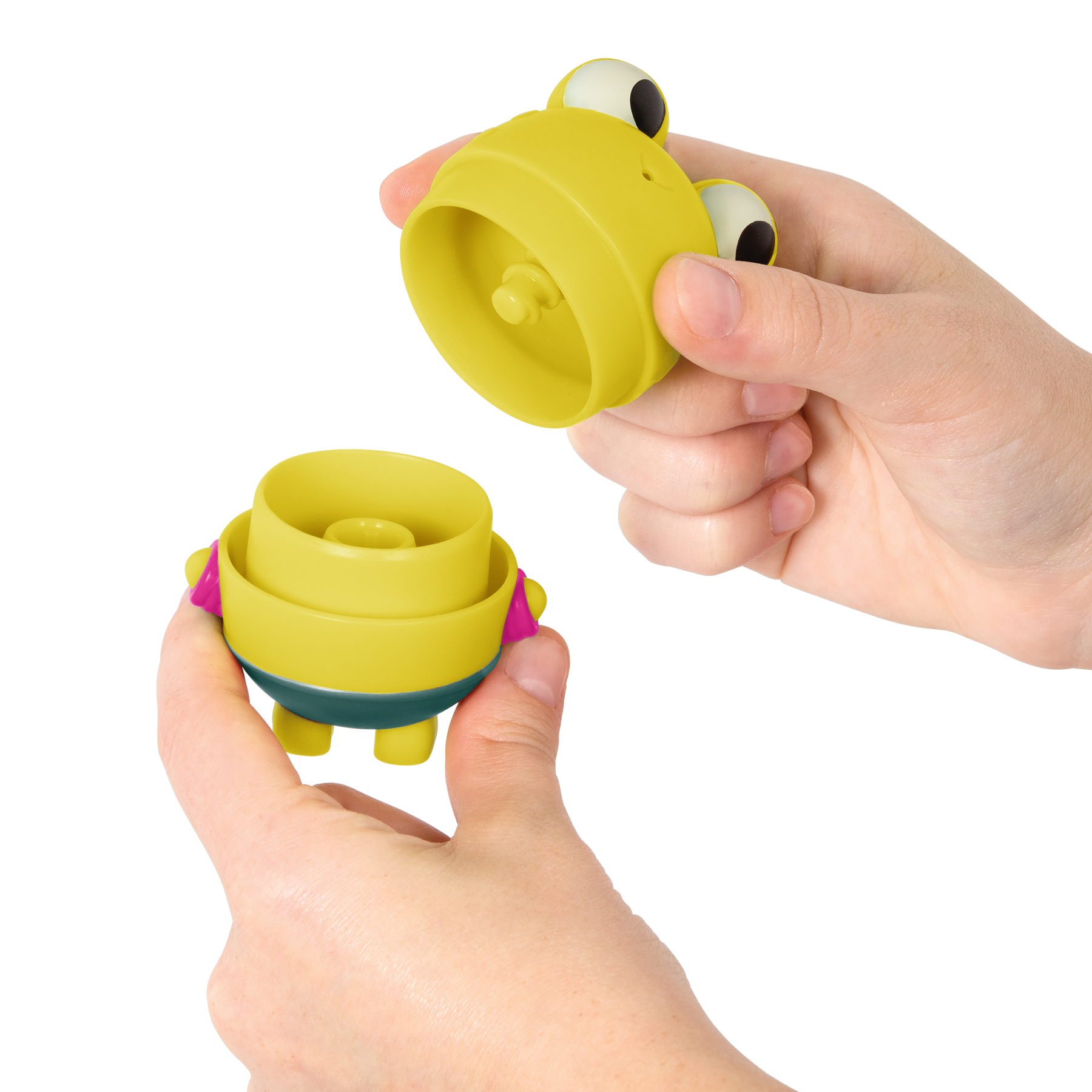 Glow & splash with Jax and a whale for bathtime fun that never fails! Place the wonderful whale into the water and watch as it magically glows and projects stars all over the room. It’s a tub-time disco! And If you want to play with each bath toy separately, you can easily pop Jax out of the whale and fill this little swimmer up with water to ensure the splashiest experience. When the water is warm, this frog’s swimsuit color changes right before your eyes! Playing with the Glow & Splash set develops fine motor skills and improves sensory development. 1 AAA battery is required and included (non-replaceable).