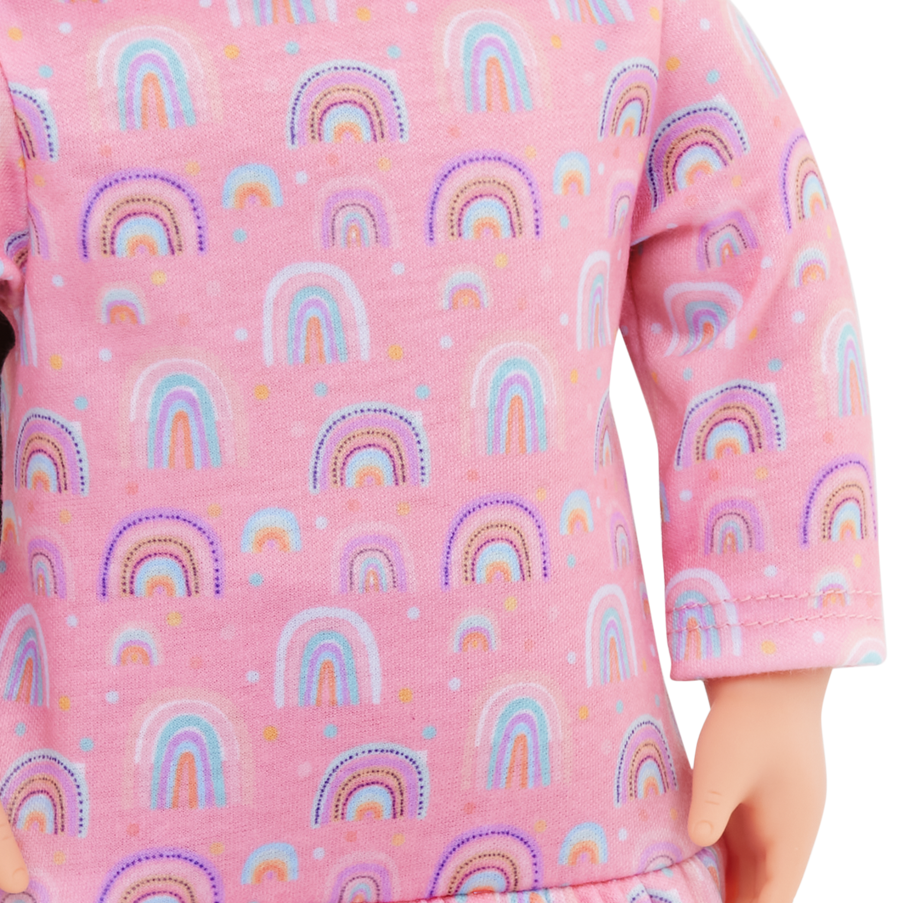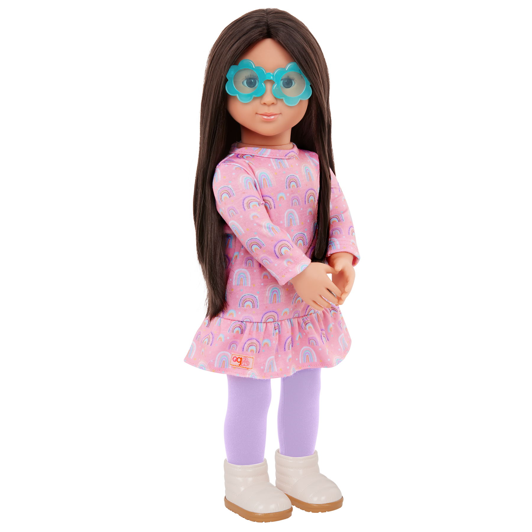 Make your 18-inch doll's wardrobe shine with the Our Generation Bright as a Rainbow outfit! This colorfully cute clothing set lets kids bring rainbow fun to their doll's parties, outdoor adventures, or indoor storytelling. It includes a bright pink dress with an all-over rainbow print, a pair of lilac tights, and booties. It also comes with a purse and sunglasses to add an extra pop of style! When it's time for dress-up, this outfit has easy-open closures to quickly put on and remove. So fashion lovers can mix, match, and create more stylish looks! (Dolls sold separately)