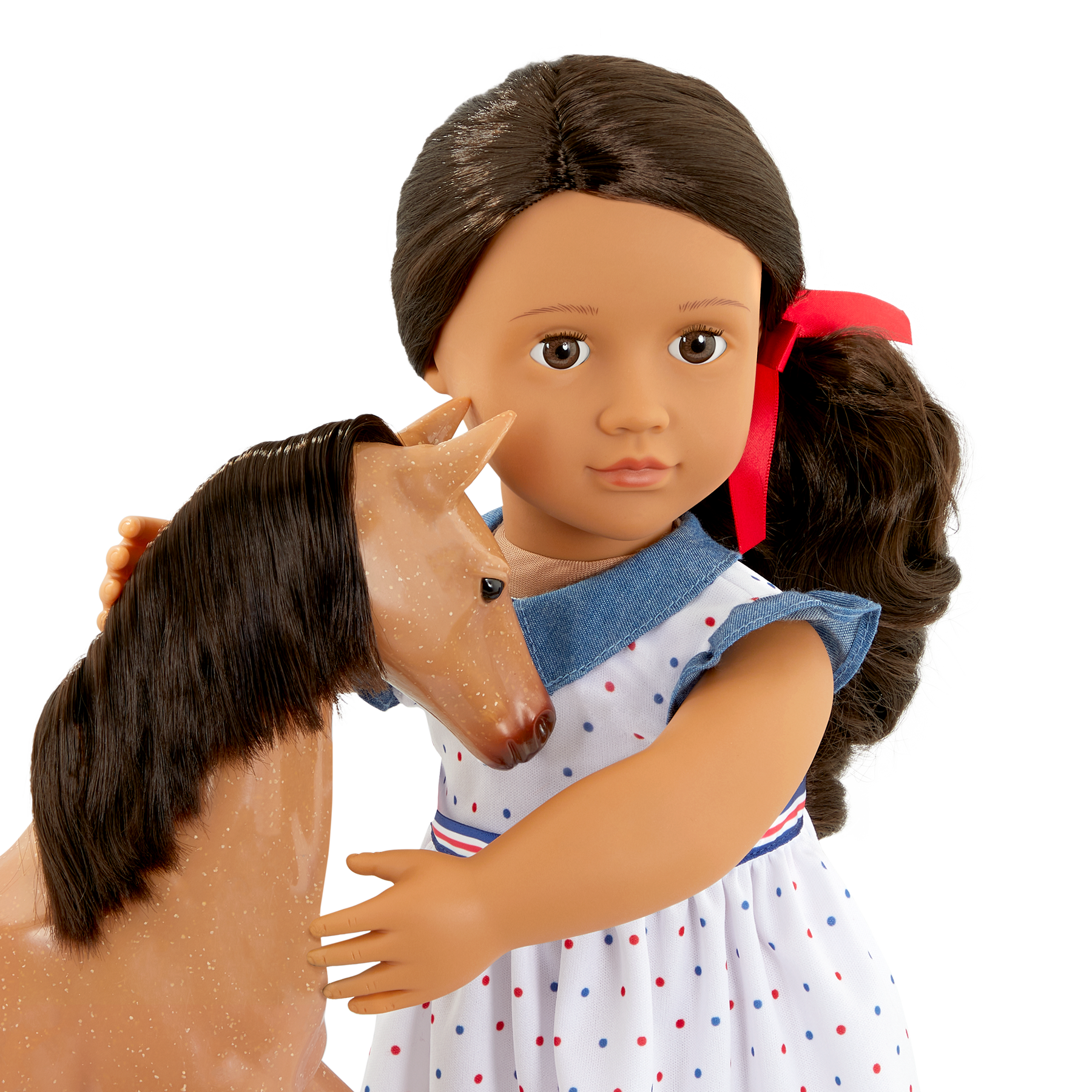 Grow your ranch and learn how to care for a newborn foal with Daria! This Our Generation 18-inch equestrian doll has a passion for horses. Keep her foal healthy with the feeding bottle, carrots, and grooming brush. Then add a taste of fun fashion with the cute bow - her 12-inch baby horse has a sparkly coat with a silky soft mane and tail to style! Daria has beautiful brown eyes that open and close with long, wavy brunette hair that's fun to style. She arrives wearing a cute western-inspired dress with denim accents in a polka dot pattern and a pair of riding boots. She also wears a bright red hair bow to match her foal! Her outfit has easy-open closures to quickly put on and remove, so you can mix, match, and create more fun looks for Daria's galloping adventures!