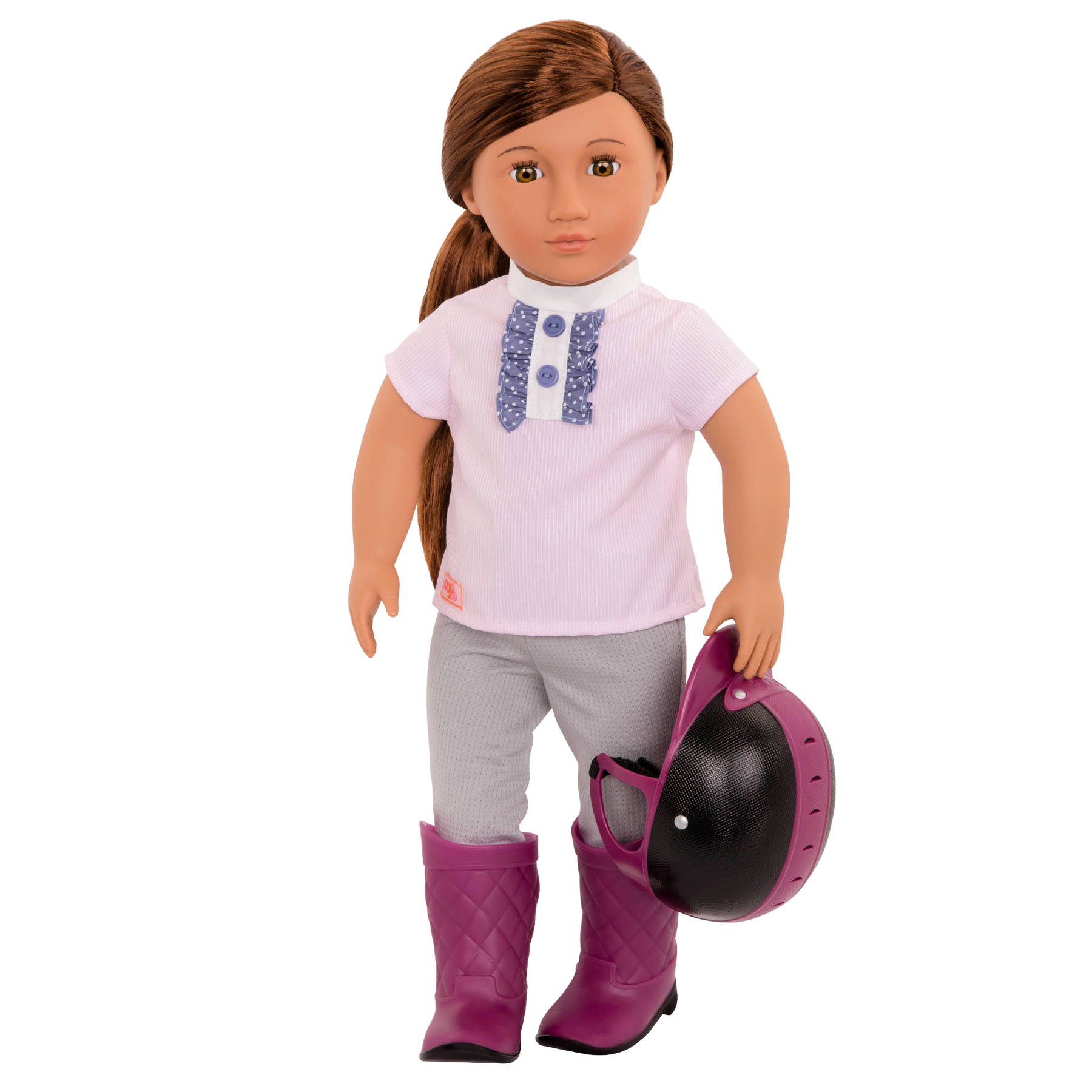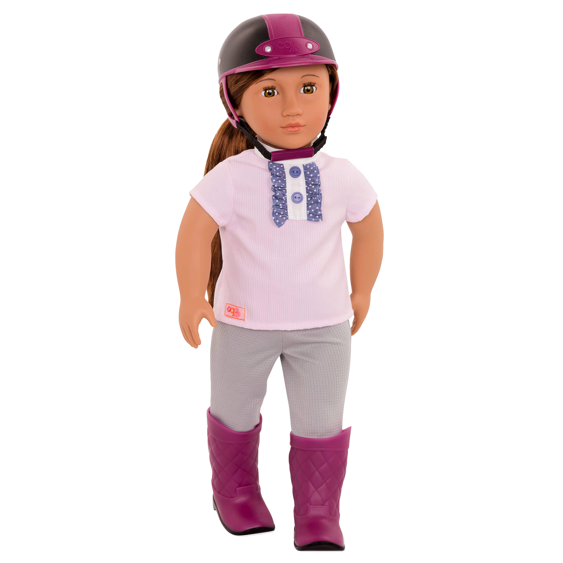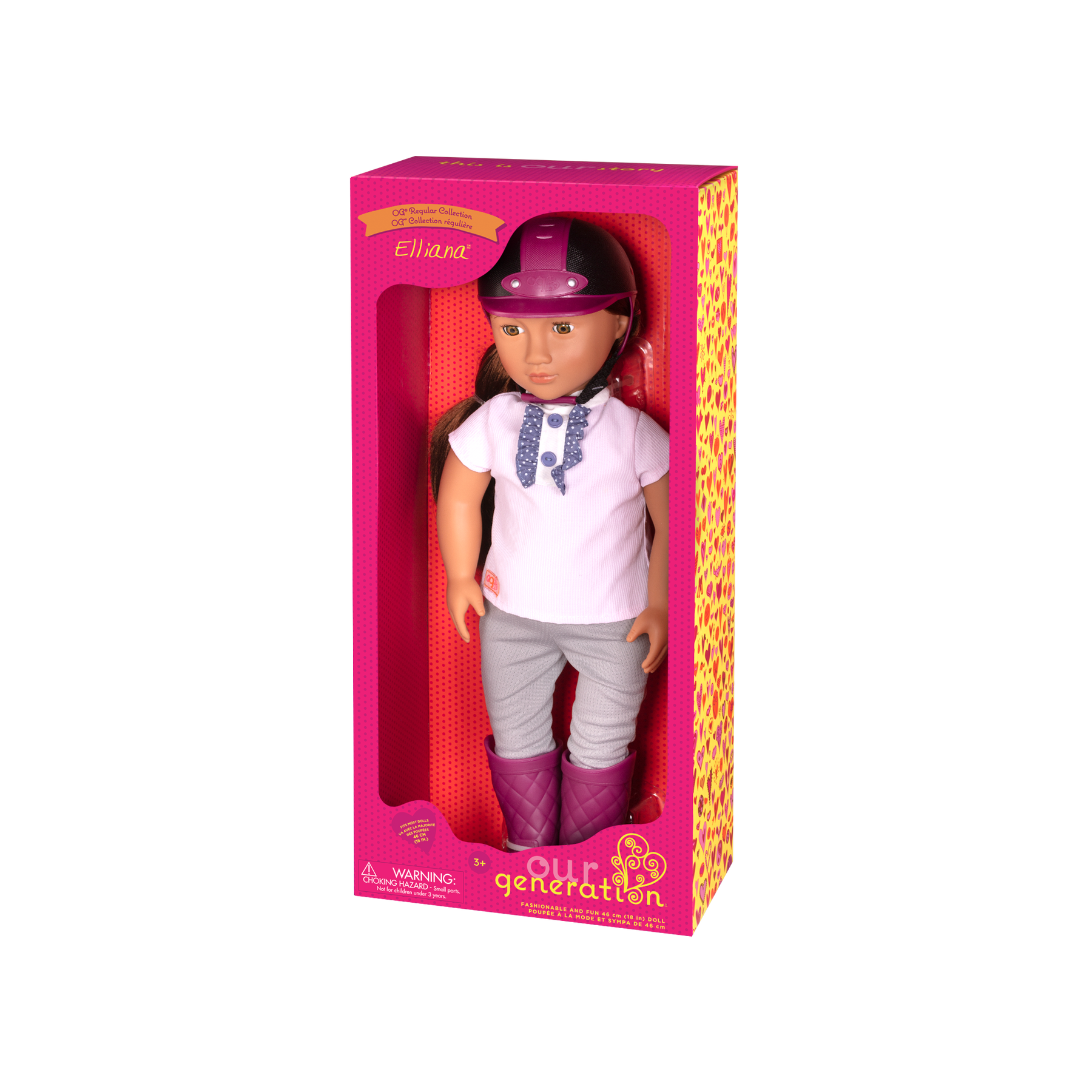 Ride into adventure with Elliana! This lovely Our Generation 18-inch equestrian doll is ready to jump over every obstacle and take home the prize! Elliana has beautiful hazel eyes that open and close with long, reddish-brown hair that can be styled in lots of fun ways! Elliana is ready for a day at the stables and wears a pink T-Shirt with a ruffled front and buttons, gray riding pants, quilted purple riding boots, and a matching purple and black riding helmet. Explore the entire Our Generation Equestrian Collection for all kinds of fun accessories to pair with Elliana, including horses, foals, stables, and more! (Additional accessories sold separately)