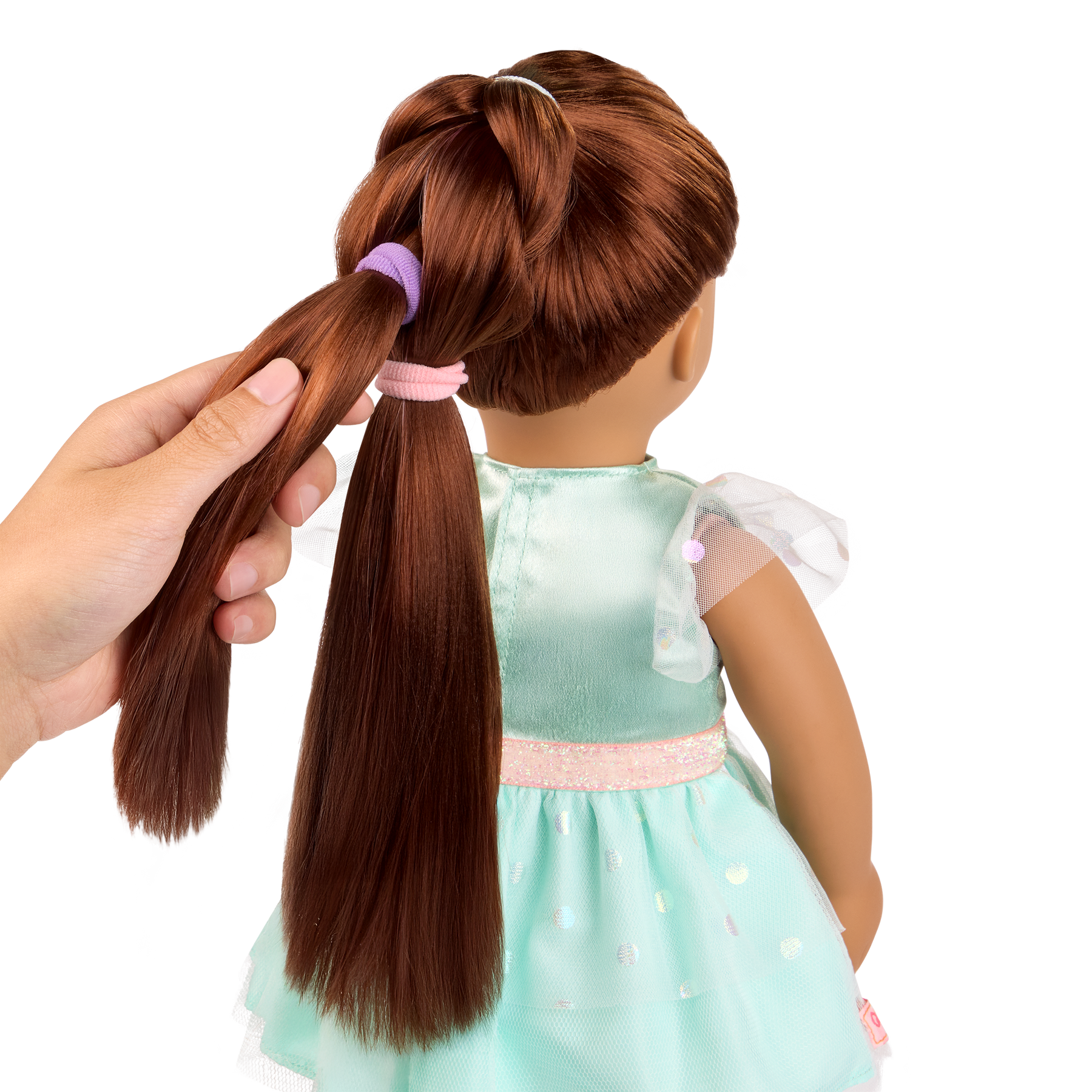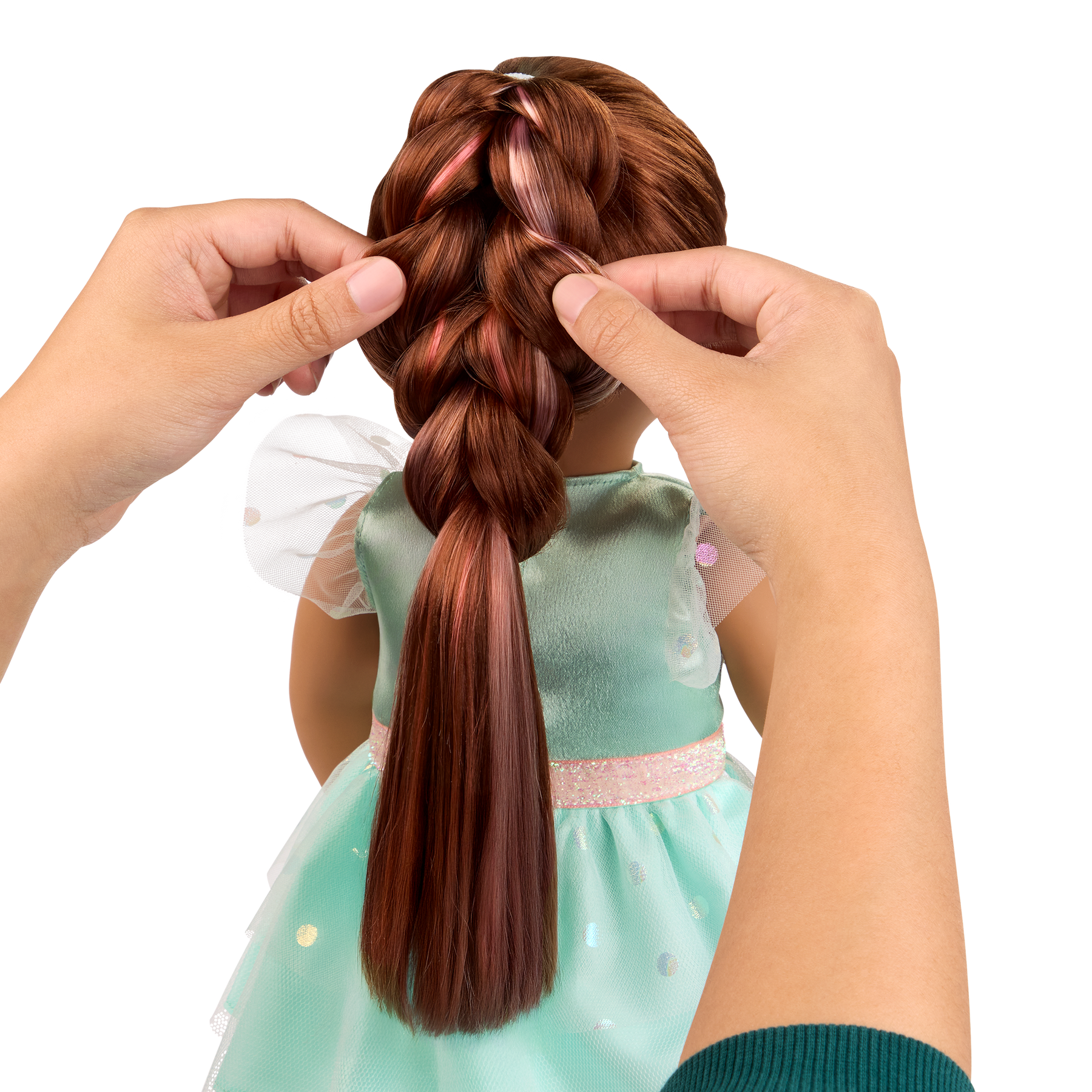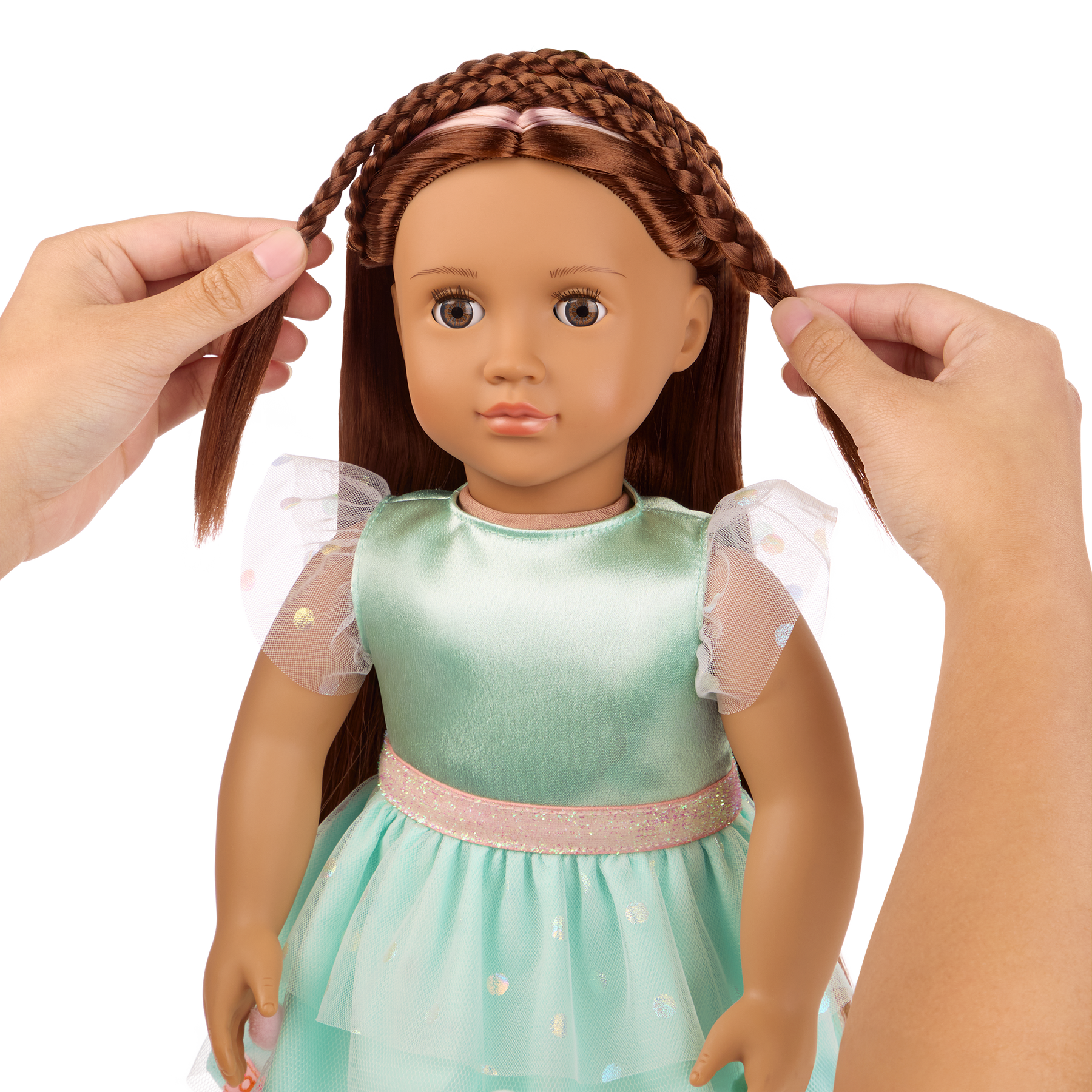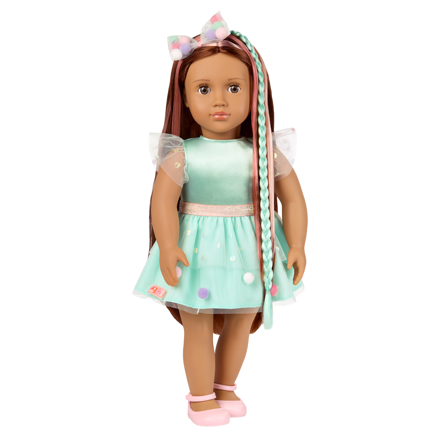Our Generation 46 cm doll Angelina shines with ultra-long brown hair for kids to style and accessorize, featuring radiant pops of color for extra dazzle! Need more volume? Kids can make Angelina's braids grow longer or shorter with the push of a button, bringing their creativity to new lengths! The styling guide includes 4 different hairstyles to get the fun started, with hair elastics and a hair bow to complete every look. Time for a refresh? Kids can use the brush to smooth out Angelina's hair and dream up all-new trends for hours of fun. Angelina wears an easy-change dress with colorful pom pom details. She has a huggable soft body and lifelike eyes that open and close. This Our Generation doll makes a wonderful gift for kids ages 3+ (small parts), encouraging them to create their own unique stories.