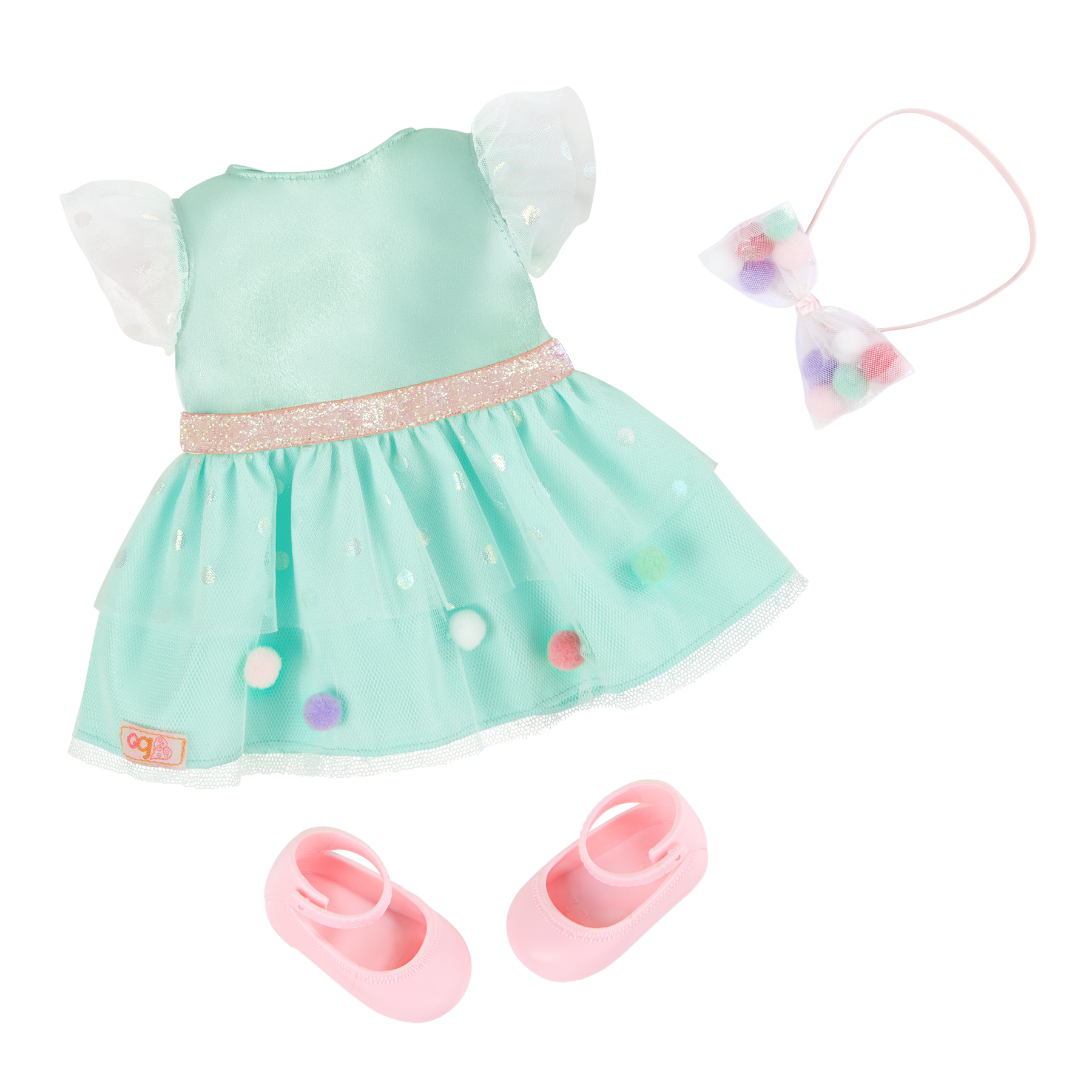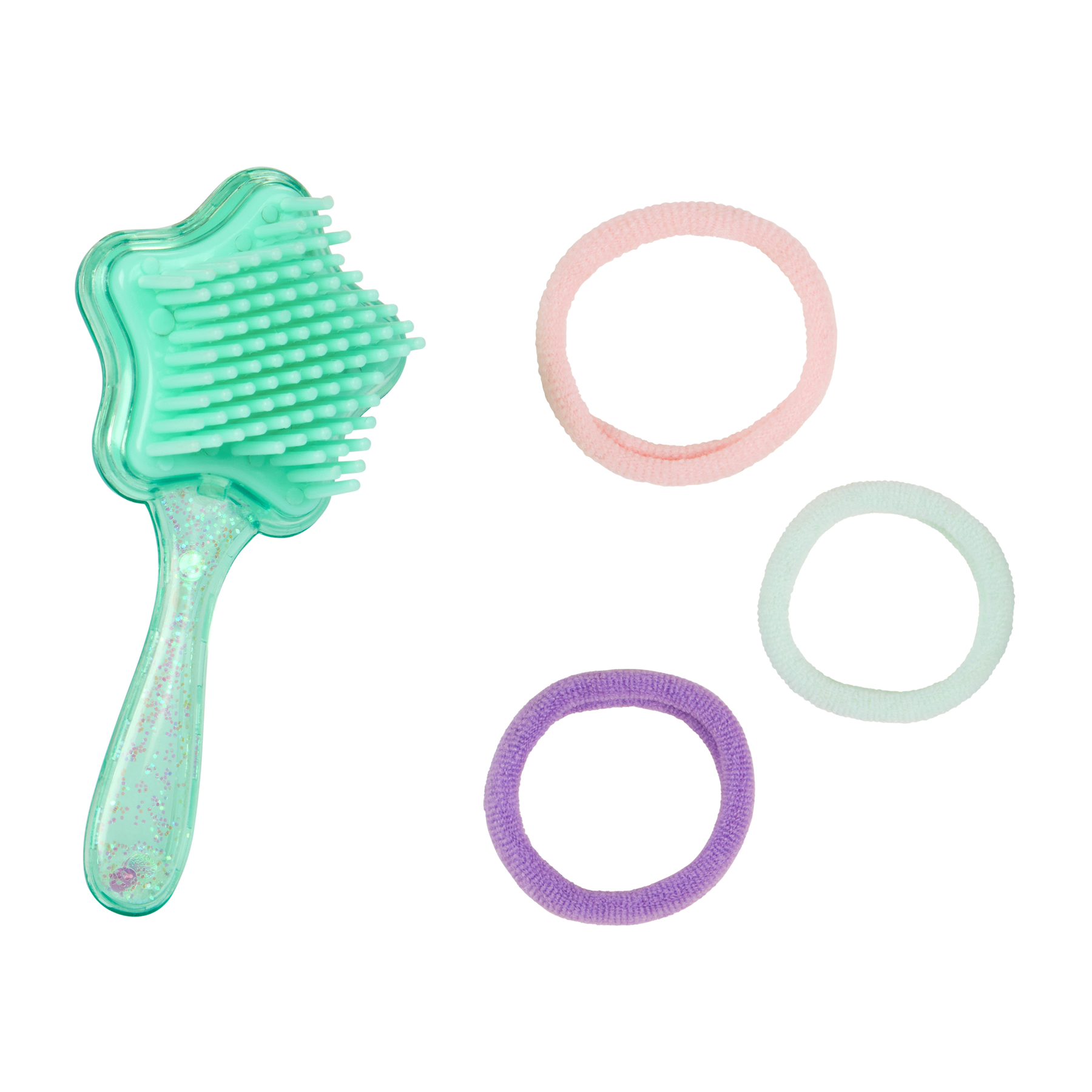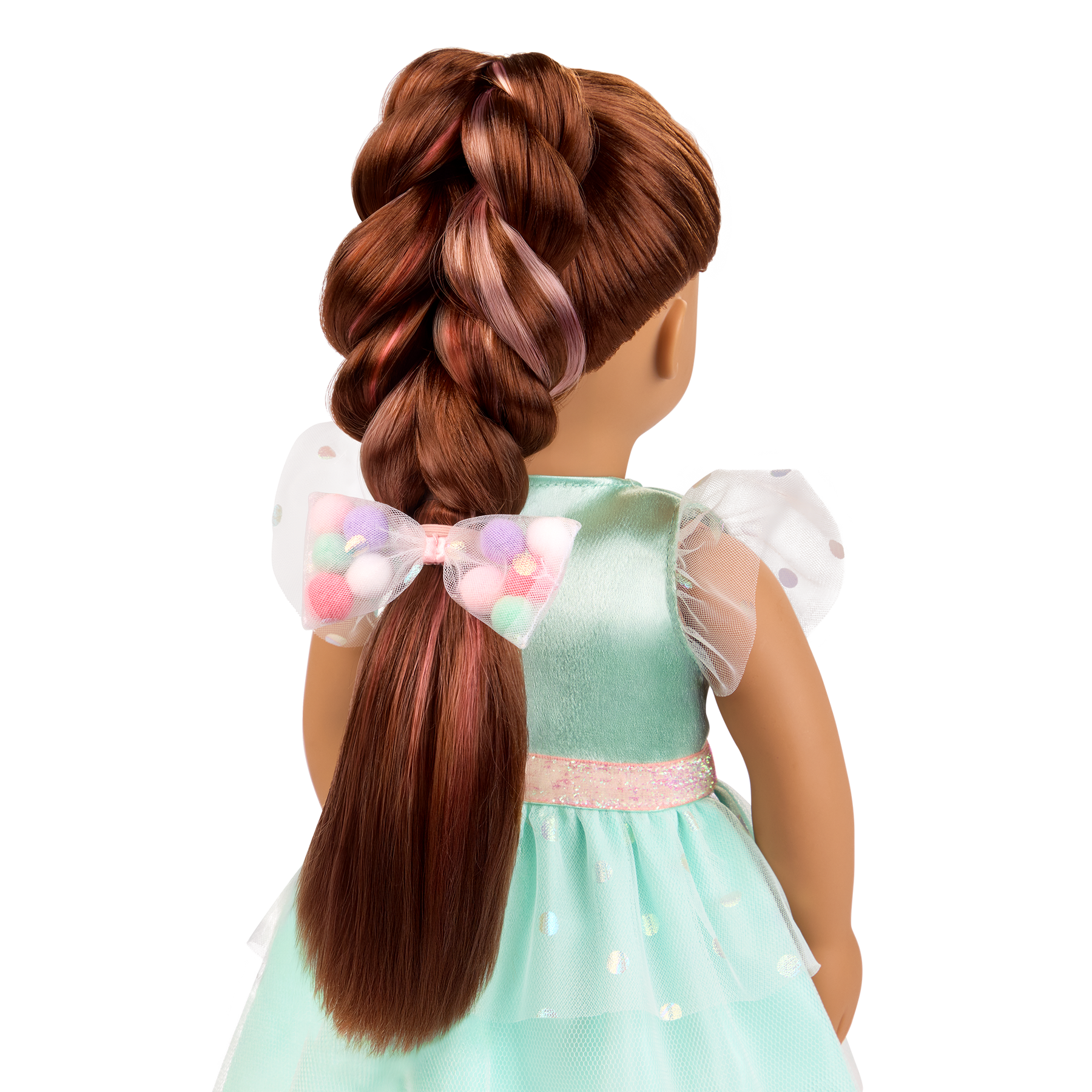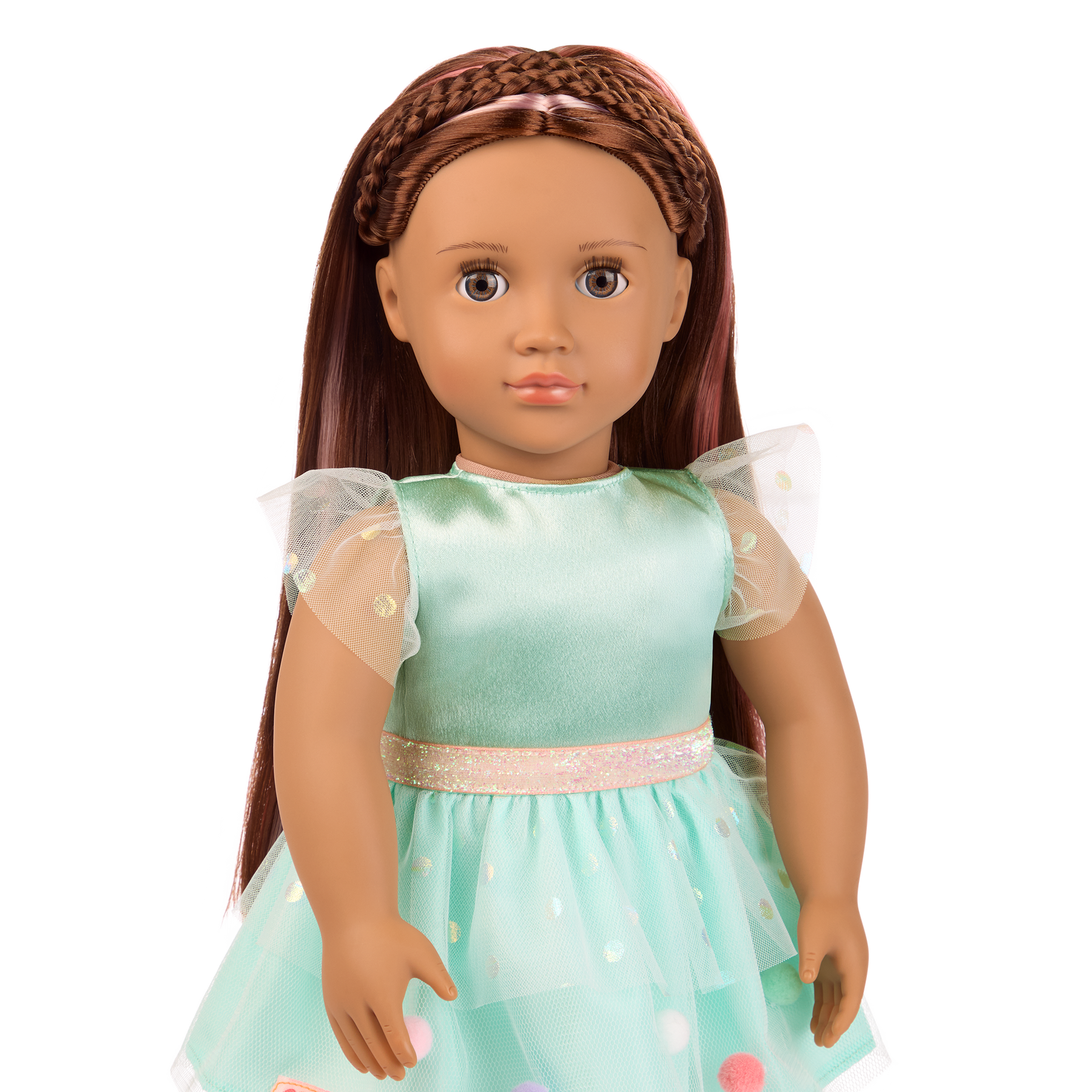 Our Generation 46 cm doll Angelina shines with ultra-long brown hair for kids to style and accessorize, featuring radiant pops of color for extra dazzle! Need more volume? Kids can make Angelina's braids grow longer or shorter with the push of a button, bringing their creativity to new lengths! The styling guide includes 4 different hairstyles to get the fun started, with hair elastics and a hair bow to complete every look. Time for a refresh? Kids can use the brush to smooth out Angelina's hair and dream up all-new trends for hours of fun. Angelina wears an easy-change dress with colorful pom pom details. She has a huggable soft body and lifelike eyes that open and close. This Our Generation doll makes a wonderful gift for kids ages 3+ (small parts), encouraging them to create their own unique stories.