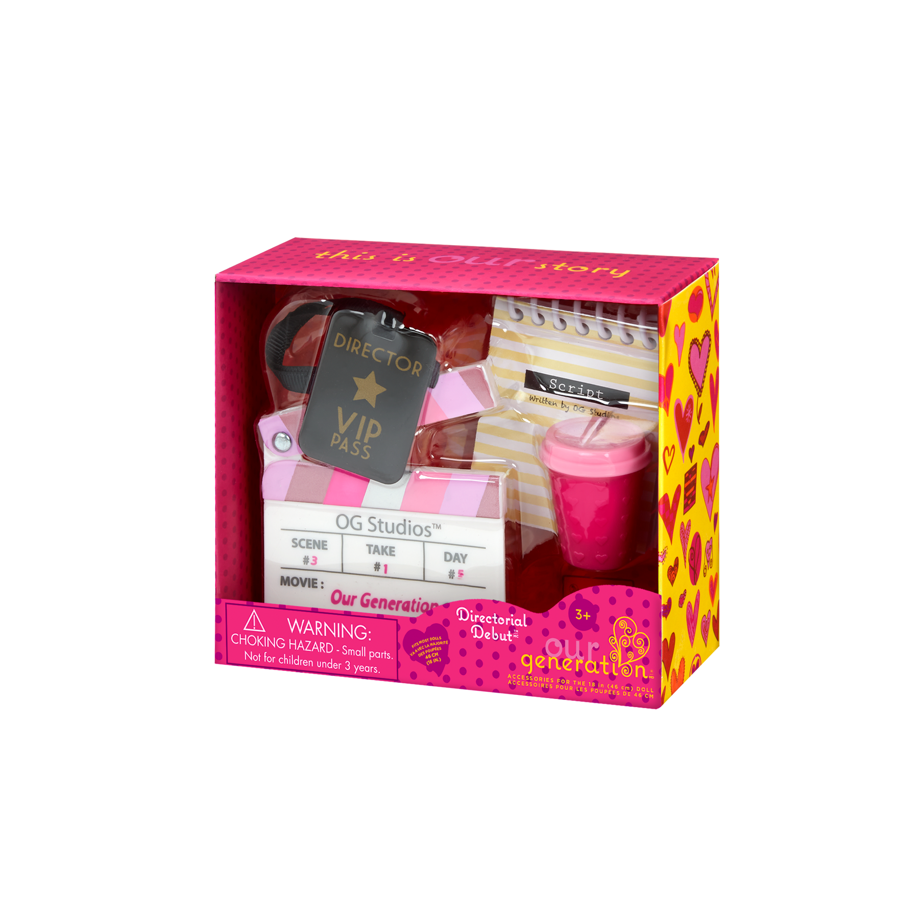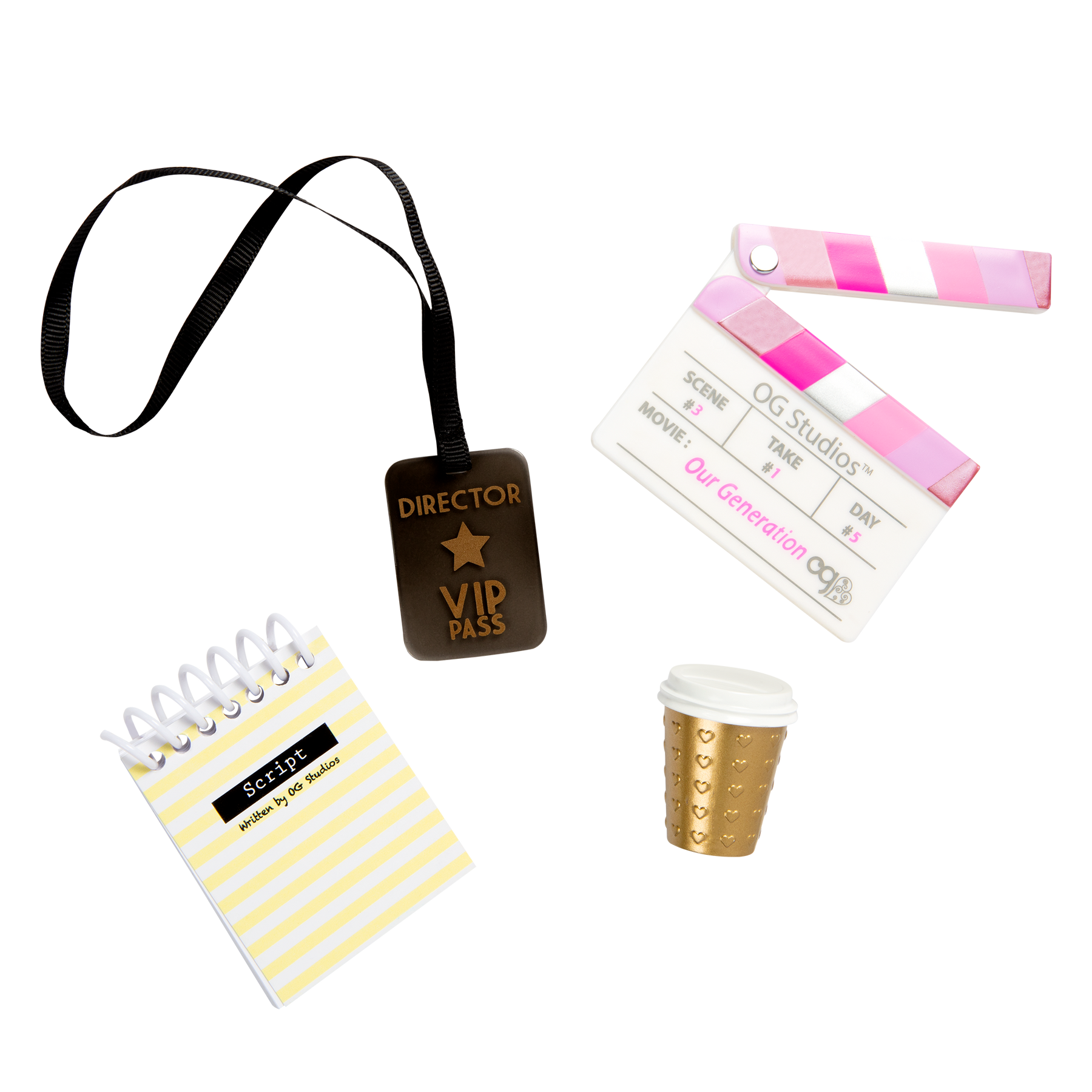 Bring playtime to the big screen with the Our Generation Directorial Debut set for 18-inch dolls! Set the scene for making dreams come true with realistic movie accessories, including a clapperboard that opens and closes, a VIP pass to be worn by your talented director doll, a coffee cup, and a script book to create wonderful stories! Each item is perfectly sized for most 18-inch dolls and is compatible with other accessory sets for more storytelling possibilities. (Dolls sold separately)