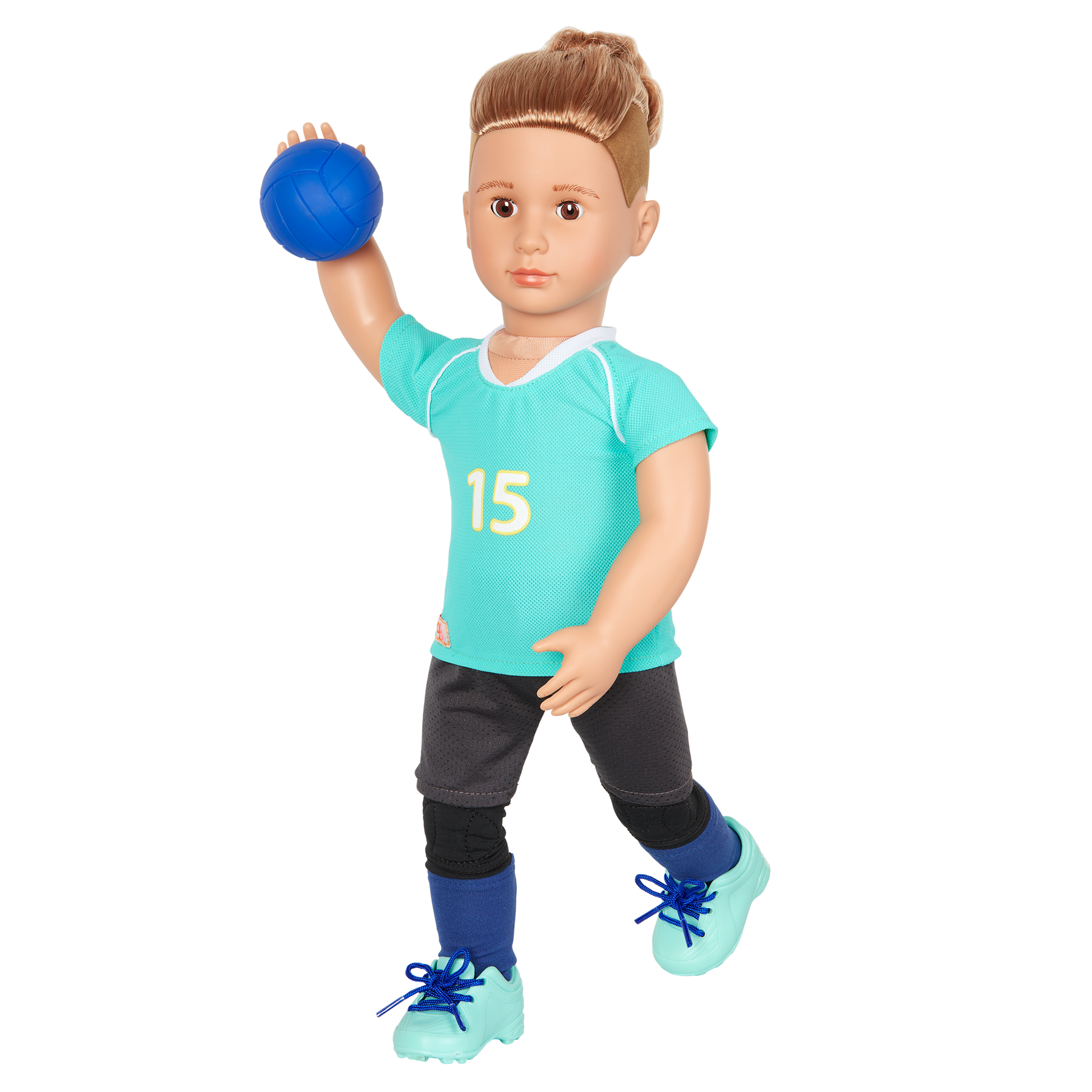 Ace your next sporting competition with the Our Generation 18-inch boy doll Johnny! This volleyball star has dark-brown eyes that open and close, and his short blonde hair is styled in a super cool boy bun! Johnny is ready to showcase his skills in the volleyball tournament and can't wait to compete for the trophy - he can rotate and bend his arms and legs to serve, set, and spike! His uniform features a jersey with his favorite number (15), black shorts, knee pads, and a pair of running shoes with real laces to tie! Cool down Johnny with the towel accessory and give him a drink of water to keep him refreshed as he serves for the win. Lift up the trophy in front of the crowd and celebrate with friends after the competition. His outfit has easy-open closures that make it quick to put on and remove, so Johnny can dress in many cool styles fit for any activity!