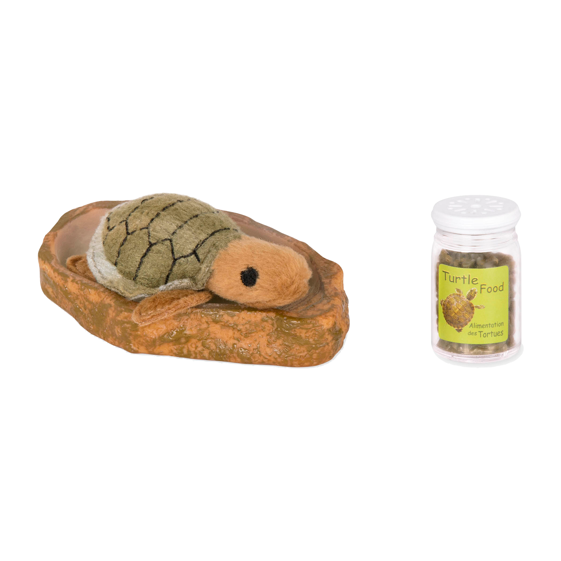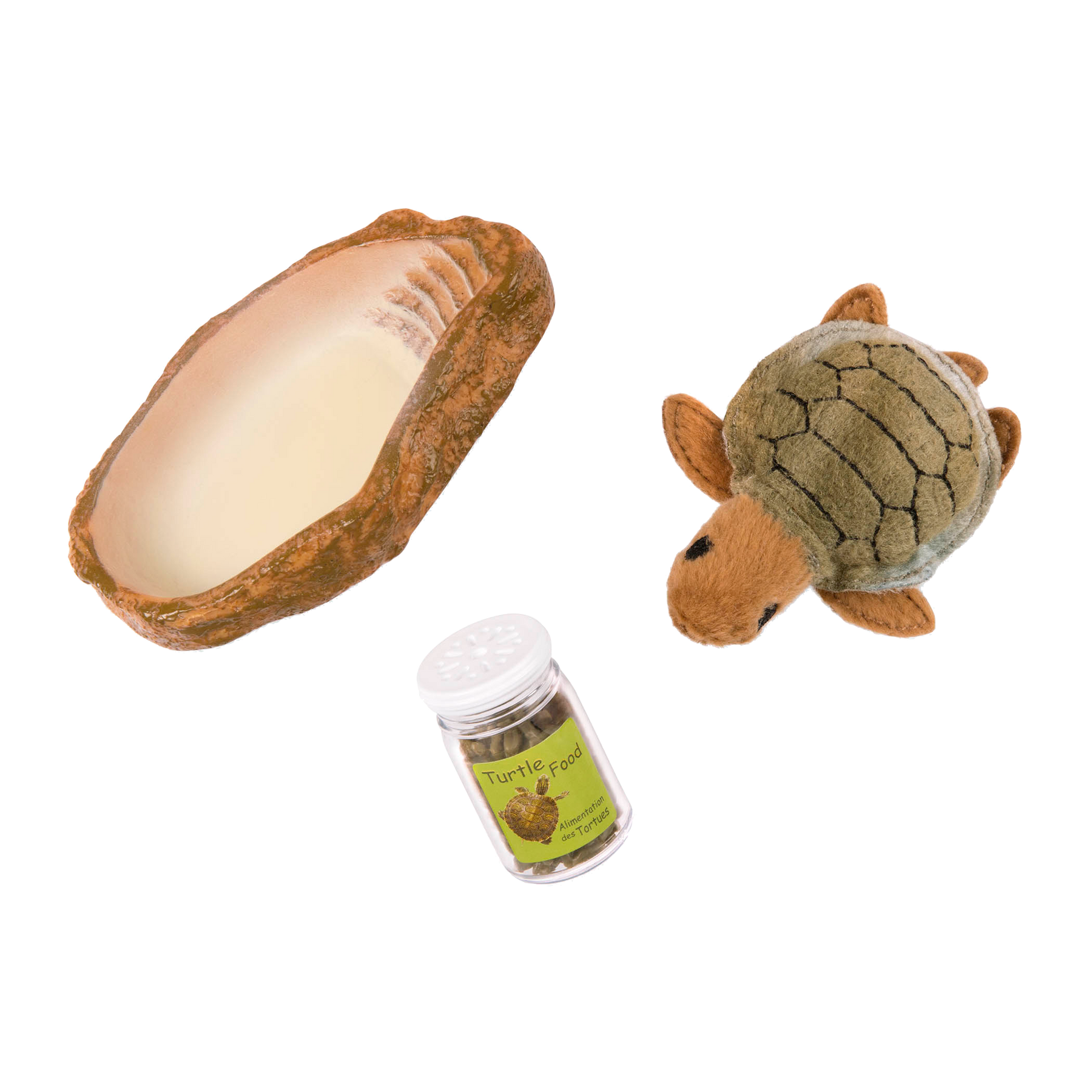 Bring home a turtle-y awesome pet to your 18-inch doll friends with the Our Generation Plush Turtle Set! This adorable mini plush turtle is the perfect pet for your besties who love reptiles! It's super soft and is approximately 3" long and 2" wide, just the right size for your 18-inch dolls to hold in their hands! Take great care of your turtle with the food jar when it's feeling hungry, and the faux-rock dish can be used as a little bed – it comfortably fits inside when it's time to rest! The cutest friends are sometimes the smallest of critters. (Dolls sold separately)