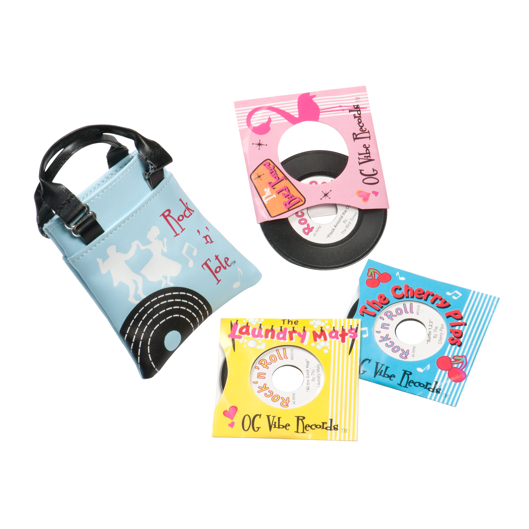 Bring vintage charm to your doll's next music party with the Our Generation Rock & Tote Records set! This retro accessory lets your doll music lovers take their favorite tunes on the go. Featuring 3 records from OG Vibe Records, use the 3 record sleeves to keep them in perfect condition while traveling. And add a little retro style to your doll's fashion collection with the Rock n' Tote bag! Compatible with most 18-inch dolls and accessories. (Dolls sold separately)