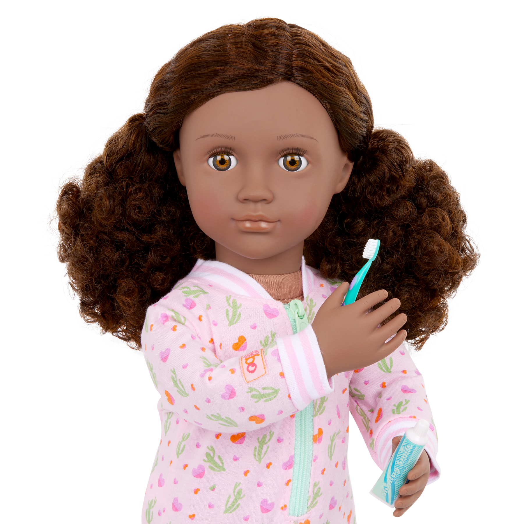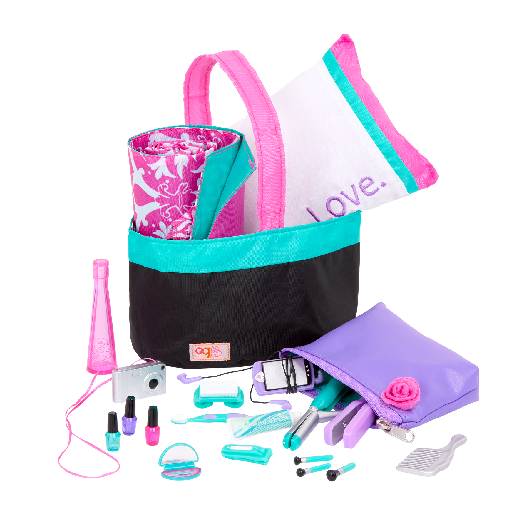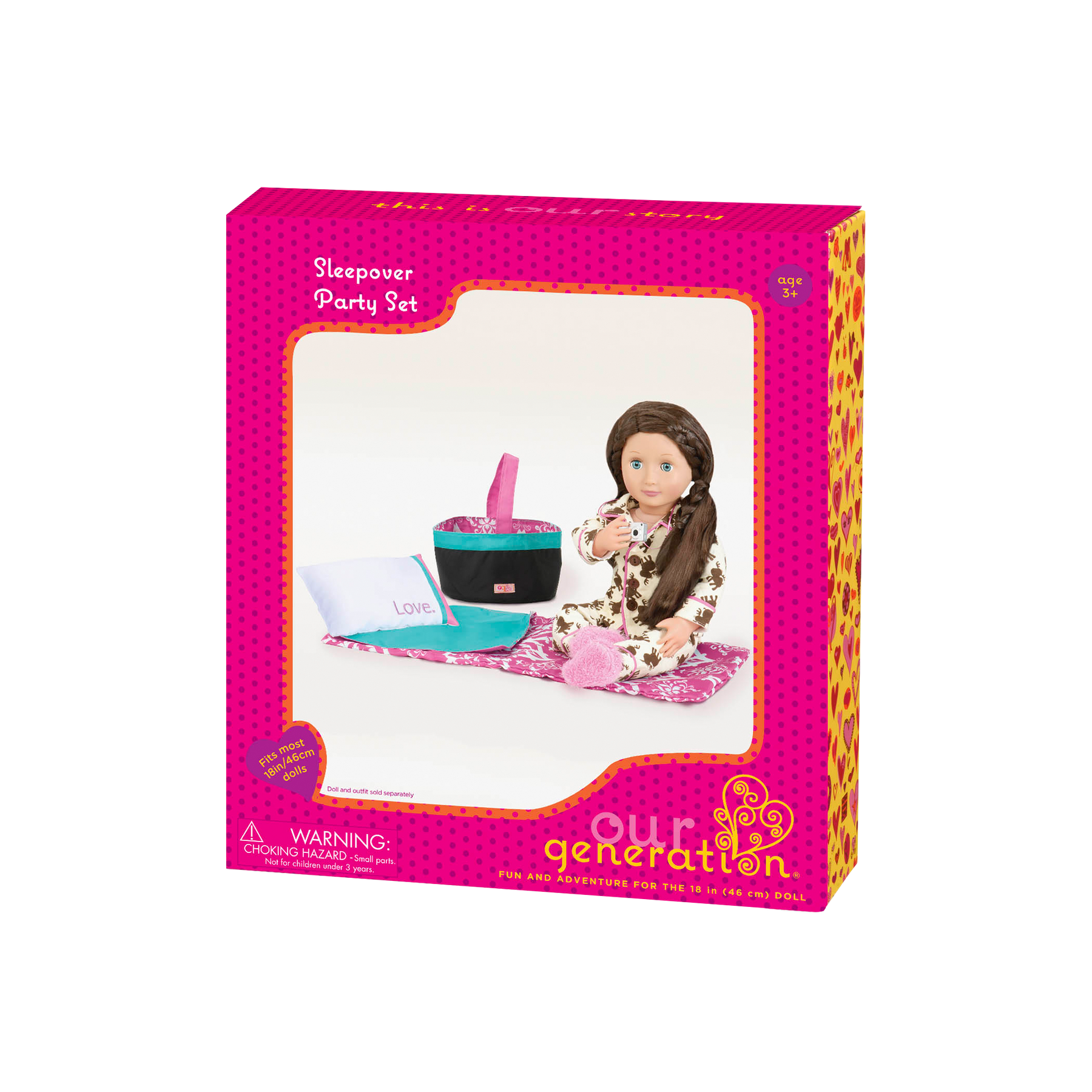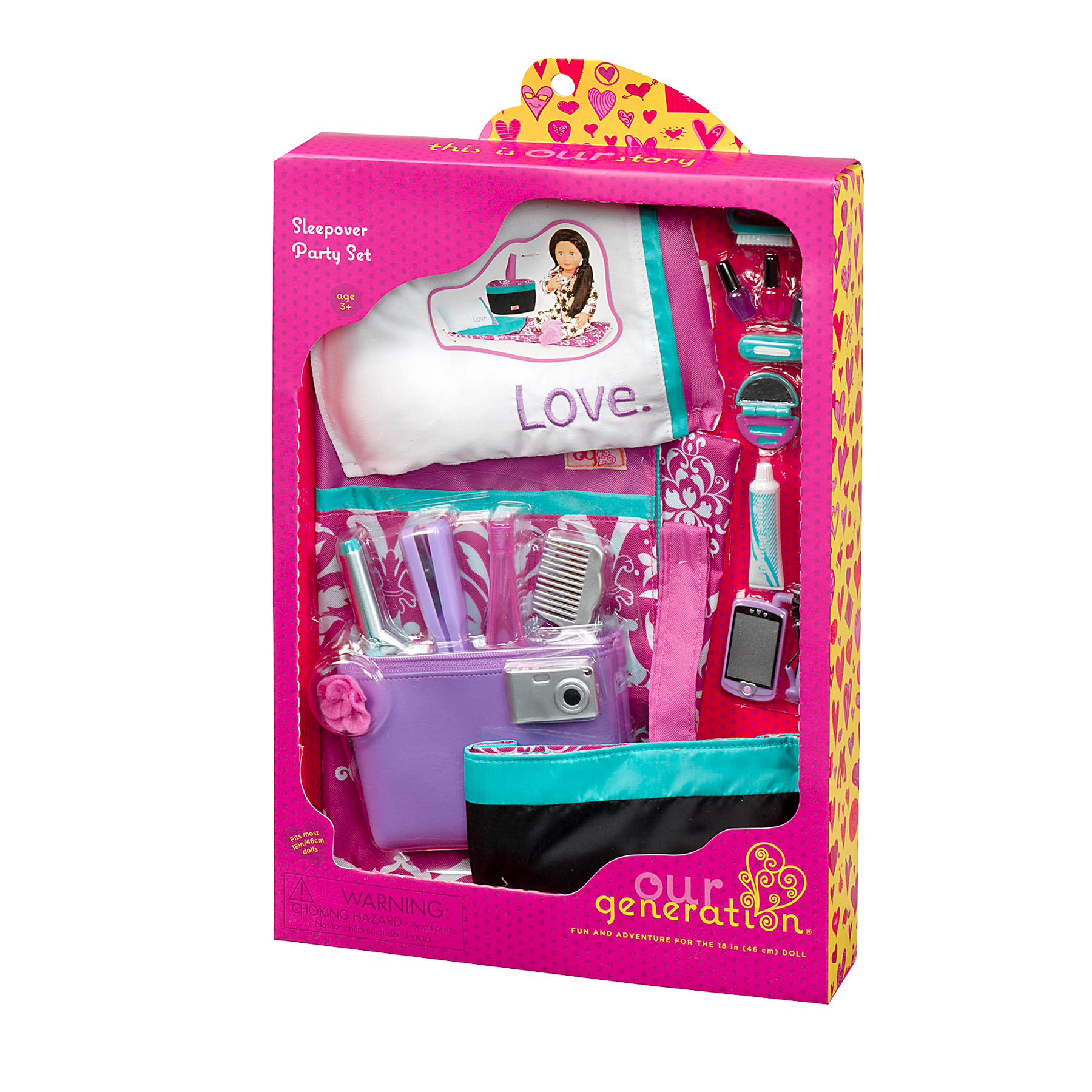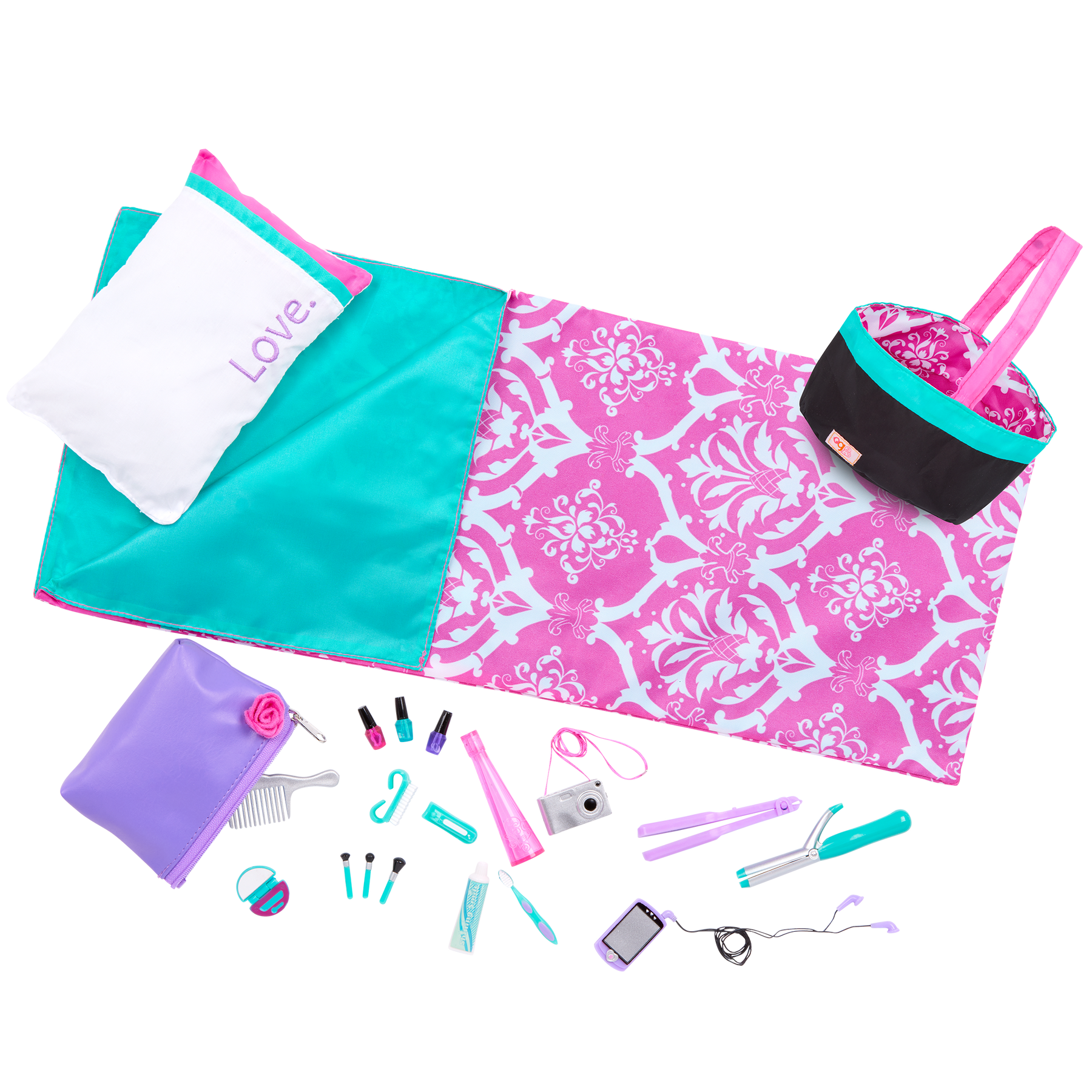The Our Generation Sleepover accessory set features a sleeping bag that comfortably fits 18-inch dolls, a pillow, and doll-sized accessories like a digital camera, makeup and hair products, a smartphone, and a tote bag to put it all in. Each piece is specially designed just for your little one's favorite Our Generation Doll. (Dolls sold separately)