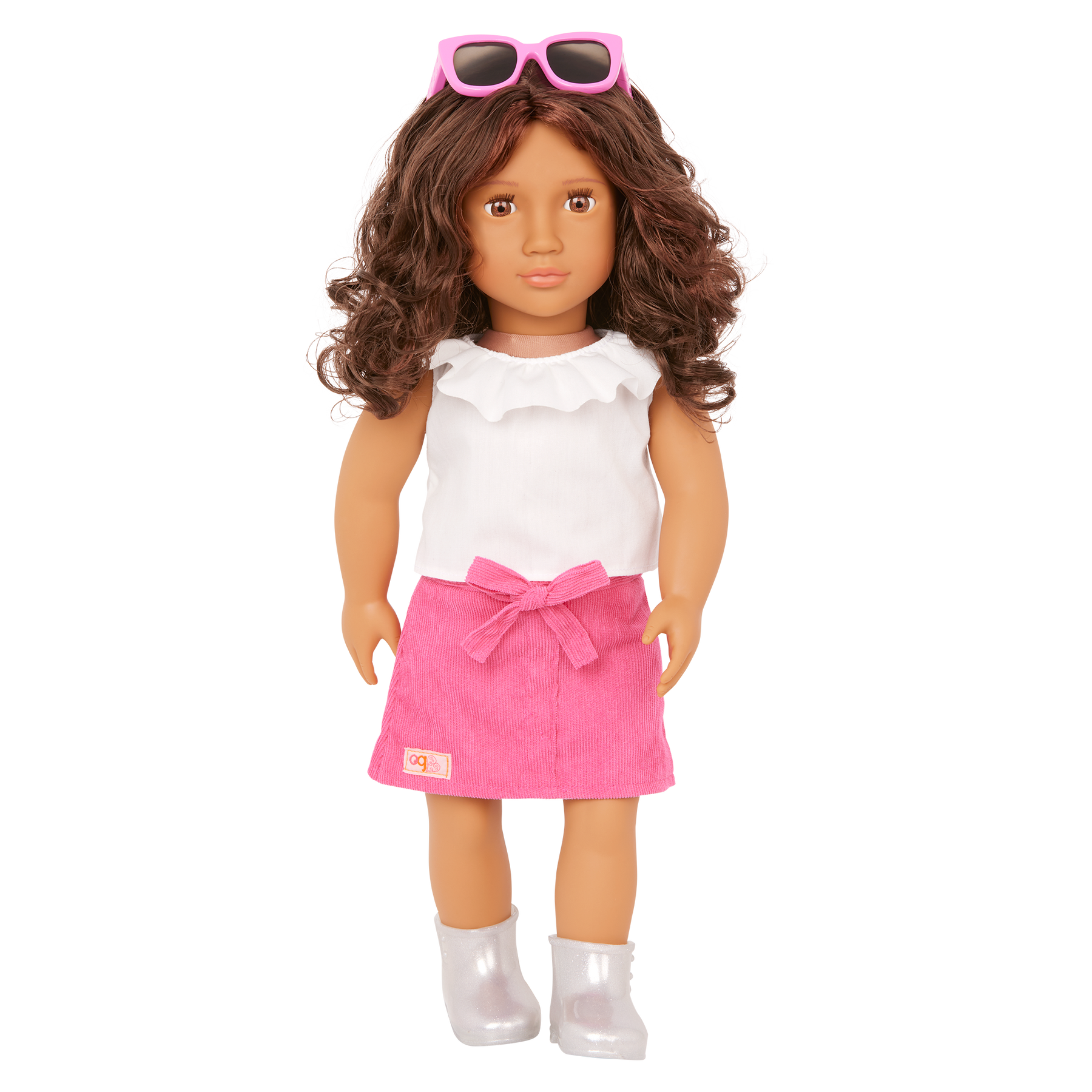 Explore sweet styles and fashion fun with Valentina! This Our Generation 18-inch doll has a huggable soft body and lifelike features to delight doll fans during playtime. Her beautiful brown eyes open and close, and her wavy, dark-brown hair is fun to style in many ways! Valentina wears a pink bowknot skirt, a top with a ruffle collar, a pair of booties, and bright pink sunglasses for extra pop. When it's time for dress-up, her outfit has easy-open closures to quickly put on and remove. So you can mix, match, and create more stylish looks on any adventure! Our Generation dolls make a great gift for kids ages 3+ (small parts), encouraging them to imagine their own unique stories.