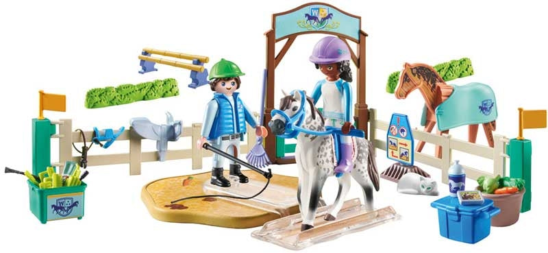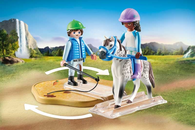 In the Waterfall riding arena, you learn everything you need to know about the correct handling of horses and various riding techniques! Riding instructor Owen is attached to the new lunging plate and the horse is put into the transparent rail to do real laps on the lunge line! Lunging, as riding pupil Zoe learns, promotes the horse's concentration and strengthens the bond between horse and rider. A wooden horse is available for exercises and the various riding techniques can be learnt thanks to the extensive equipment. Of course, Zoe's Knabstrupper also needs to be groomed and fed from time to time. Lessons in the Waterfall riding arena are never boring!