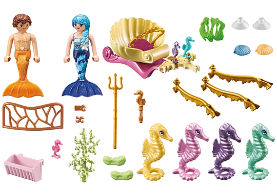 Dive in and play with the fantastic PLAYMOBIL playset, Mermaid with Seahorse Carriage. Alongside seahorses, mermaids explore the ocean in their shimmering underwater carriage. What adventures await them today? The Princess Magic Mermaid World by PLAYMOBIL invites children into a magical underwater realm. The lovingly crafted figures and animals inspire children aged 4 and above to embark on imaginative adventures. The set includes two PLAYMOBIL figures, four large seahorses, an underwater carriage, and many other accessories. Decorative shells can be easily attached to smooth surfaces with suction cups.