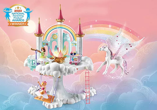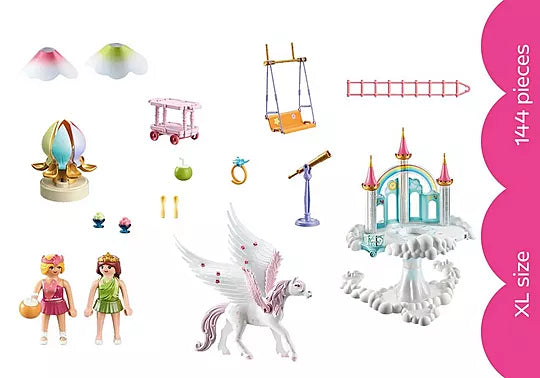 Enchanting princess toy with two PLAYMOBIL figures, a Pegasus with movable wings, a rainbow castle with sky swing, glowing rainbow flower, sticker sheet and many other enchanting extras for imaginative role playing adventures.