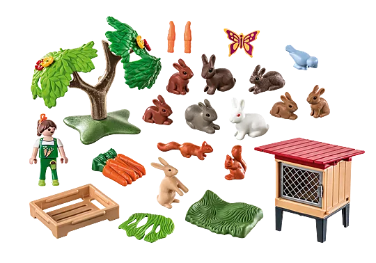 • The 41-piece toy set includes a PLAYMOBIL child figure, a rabbit hutch, nine rabbits, two squirrels, a pigeon, green fodder, carrots and other lovely extras.