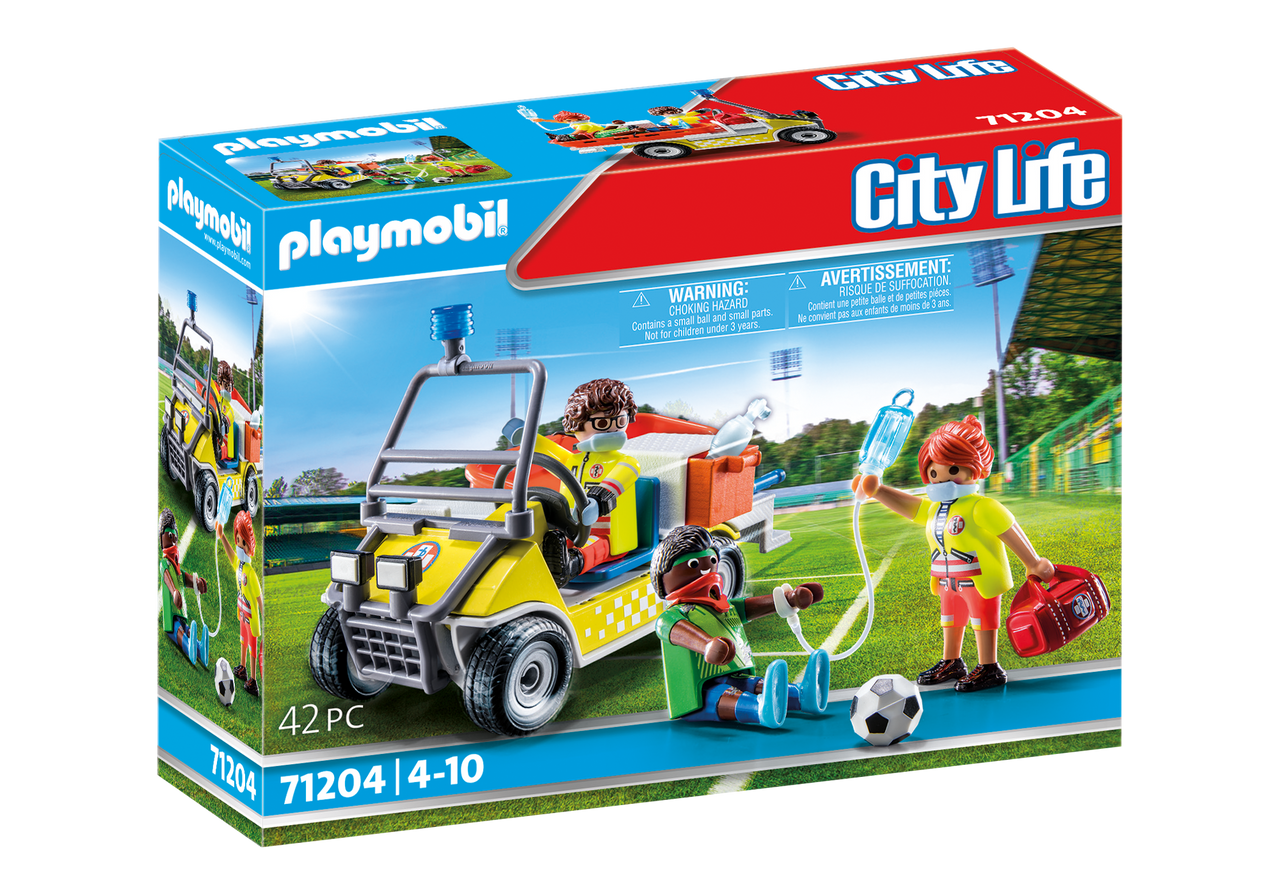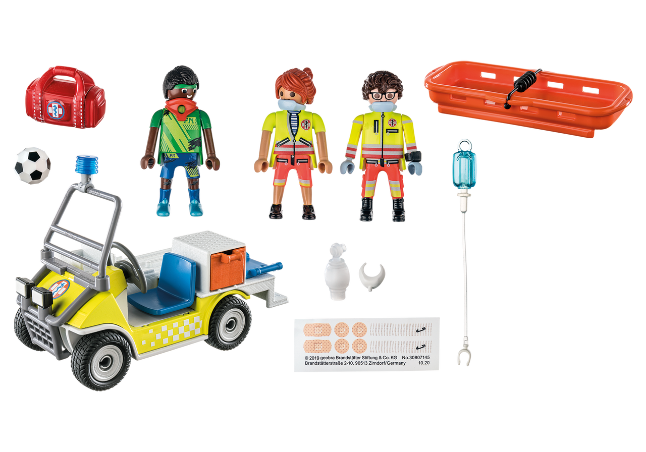 Hop into the Rescue Cart and off to the scene! The maneuverable cart can reach the scene of an accident in a flash, even in rough terrain. This time, an emergency has occurred on the soccer field. The rescue team quickly approaches the injured person. The soccer player has been badly fouled and a neck injury cannot be ruled out, so first a brace is applied to stabilize him. Then the paramedics carefully lift the player onto the transport stretcher and then onto the caddy. Quickly it goes to the hospital for further thorough examination.