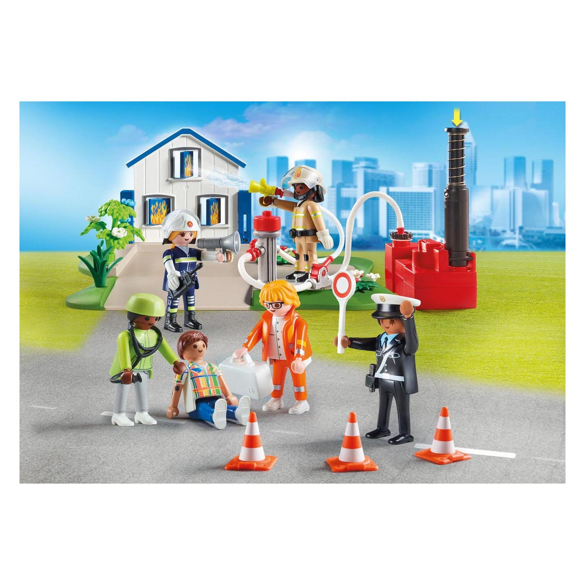 Contents: 2 police officers, 2 fire fighters, 1 injured person, 2 medical staff; Accessories: 1 house, 1 hydrant, 1 water pump, 1 water syringe, 1 fire hose, 3 pylons, 1 doctor's case, 1 radio, 1 police trowel, 2 helmets, 1 police hat