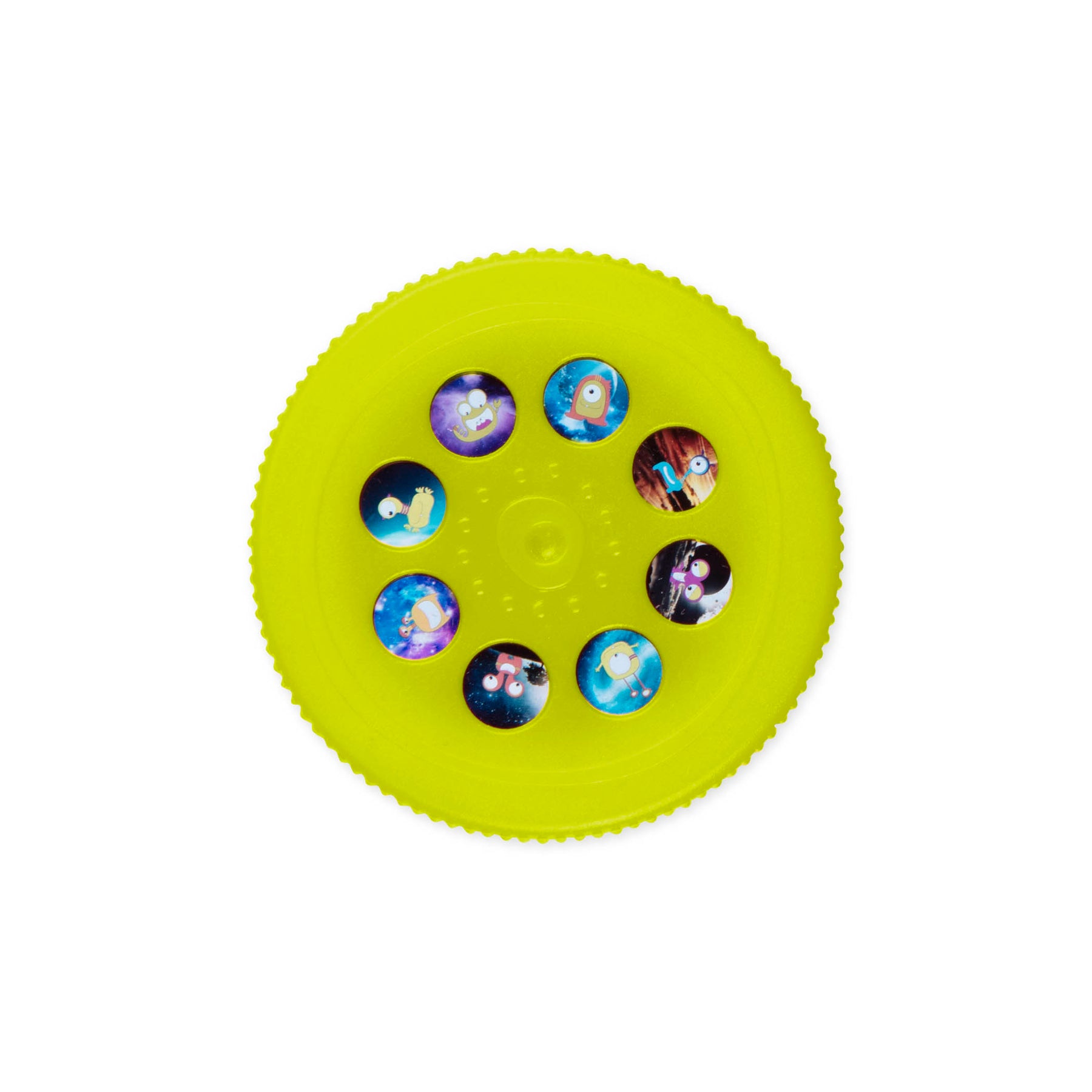 Bring the galaxy into your playroom with Light Me To the Moon from B. toys! Just take the reels out of the storage space at the bottom of the flashlight, pop 'em in at the top, and click through the images. With this educational toy, little ones can meet happy visitors from a different galaxy or learn more about the planets from our solar system. Each planet has clear name tags that make it easy for kids to read and remember! Use this easy-to-grip flashlight to project images on the bedroom wall or in a play tent. 2 AAA batteries are required and included.