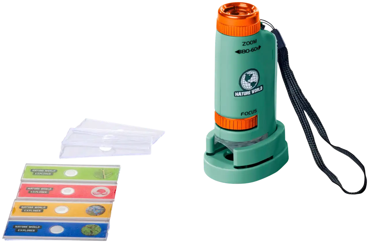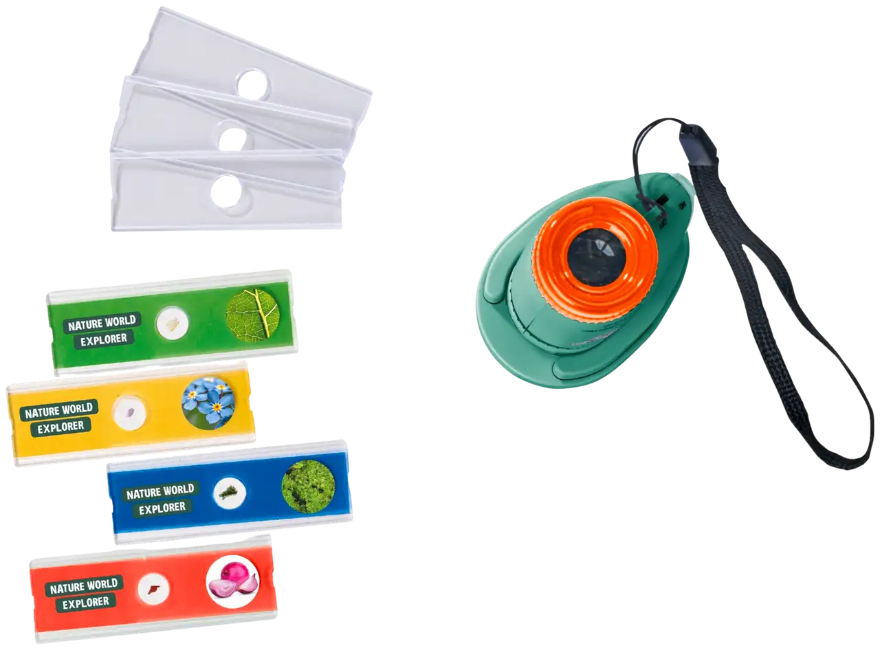 Contents: Pocket Microscope, 3 empty sample glasses and 4 with the finished sample, 2 x 1.5V-LR44 batteries included.
