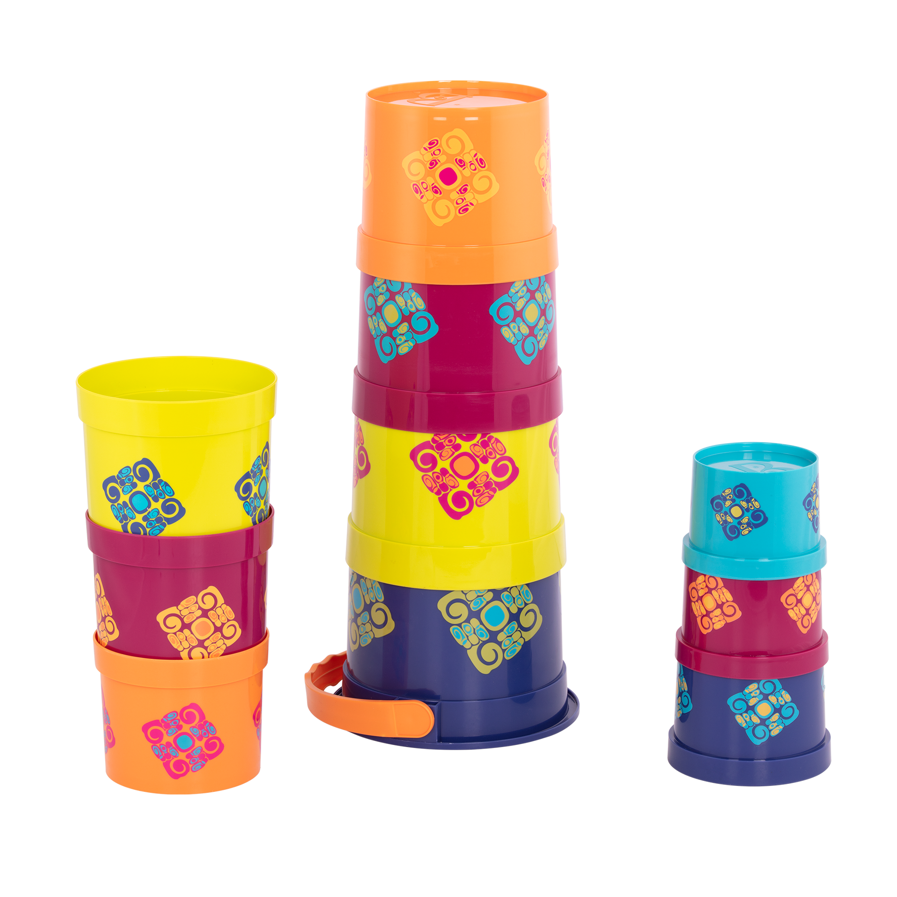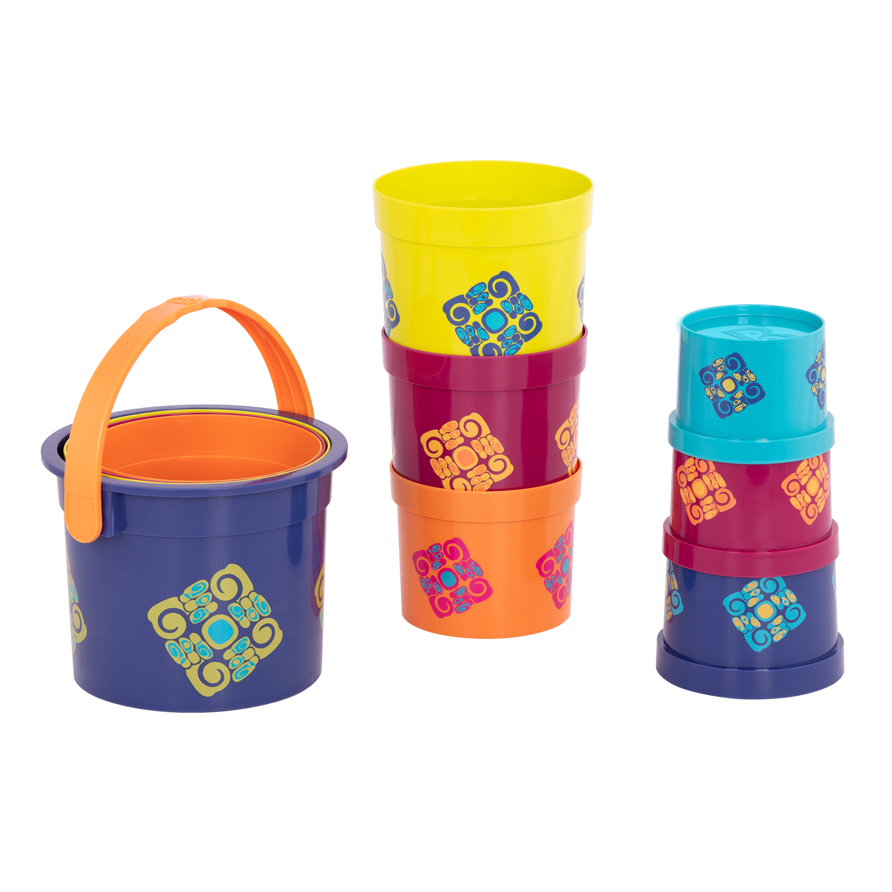 Stack and play the days away with the Bazillion Buckets from B. toys! This playset features 10 numbered nesting cups, including a handy bucket that easily holds them all. Little ones will love stacking them up and knocking them back down! After creating and re-creating colorful towers, toddlers can splash around in the bath or take these stackable cups to the beach for some building fun in the sun. Not only does this set come with a ton of play ideas, but it also has many educational benefits for kids. As children play with these nesting cups, they can practice counting from 1 to 10, discover different sea animals, improve their fine motor skills, and develop their hand-eye coordination! Recommended for toddlers 18 months and over.