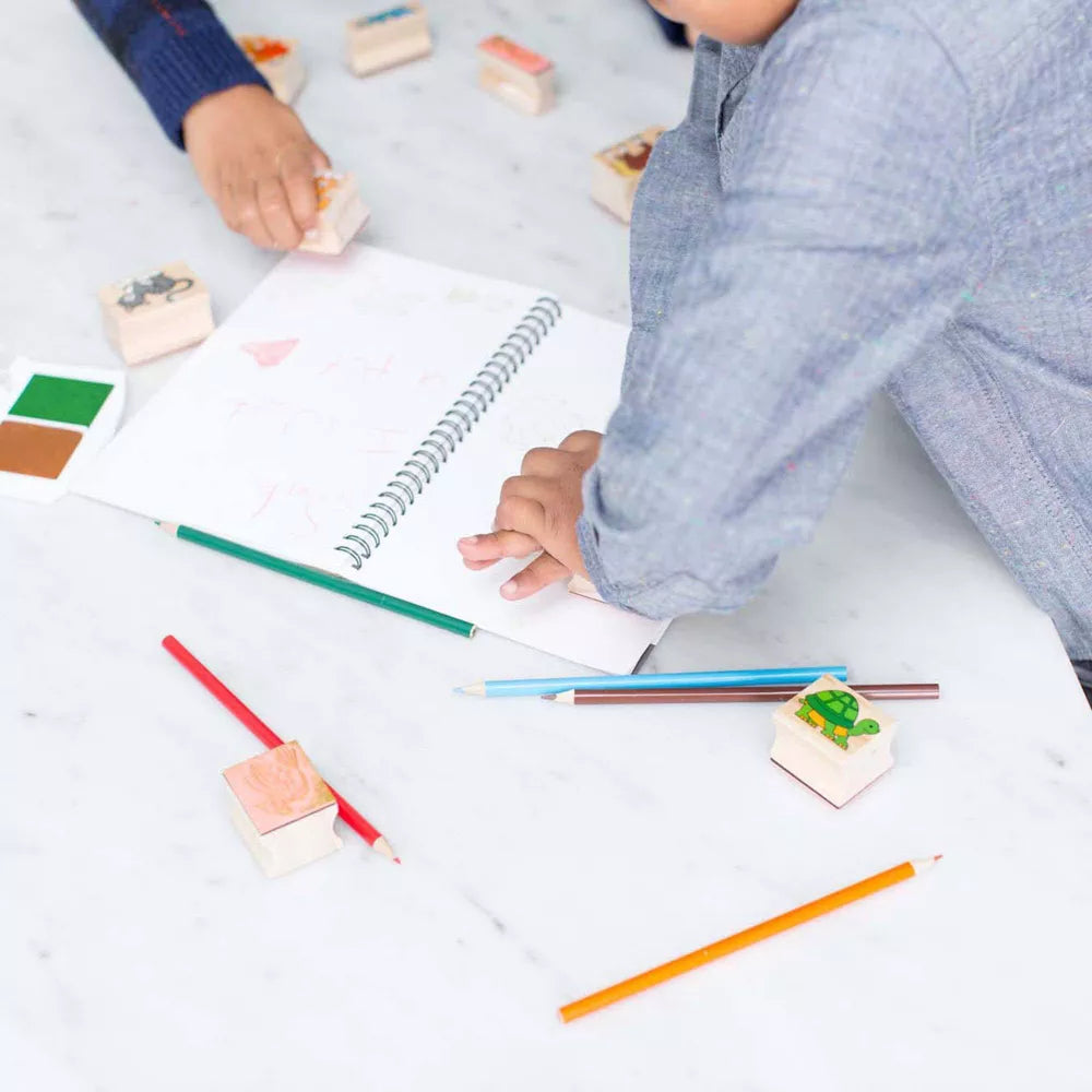 Create colorful scenes filled with adorable and exciting animal adventures with this 38-piece deluxe wooden animal stamp set! Choose from four colors of washable ink (red/blue and green/brown) to stamp animals, then color in and add details with six vibrant markers. Stamps include farm animals, ocean creatures, safari animals, and pets. With an abundance of animals to choose from, this set is perfect for creating art projects, cards, decorating notebooks, and more. All materials store neatly in a wooden crate. Wooden stamps help kids four and older develop hand-eye coordination and encourage storytelling and imaginative play.