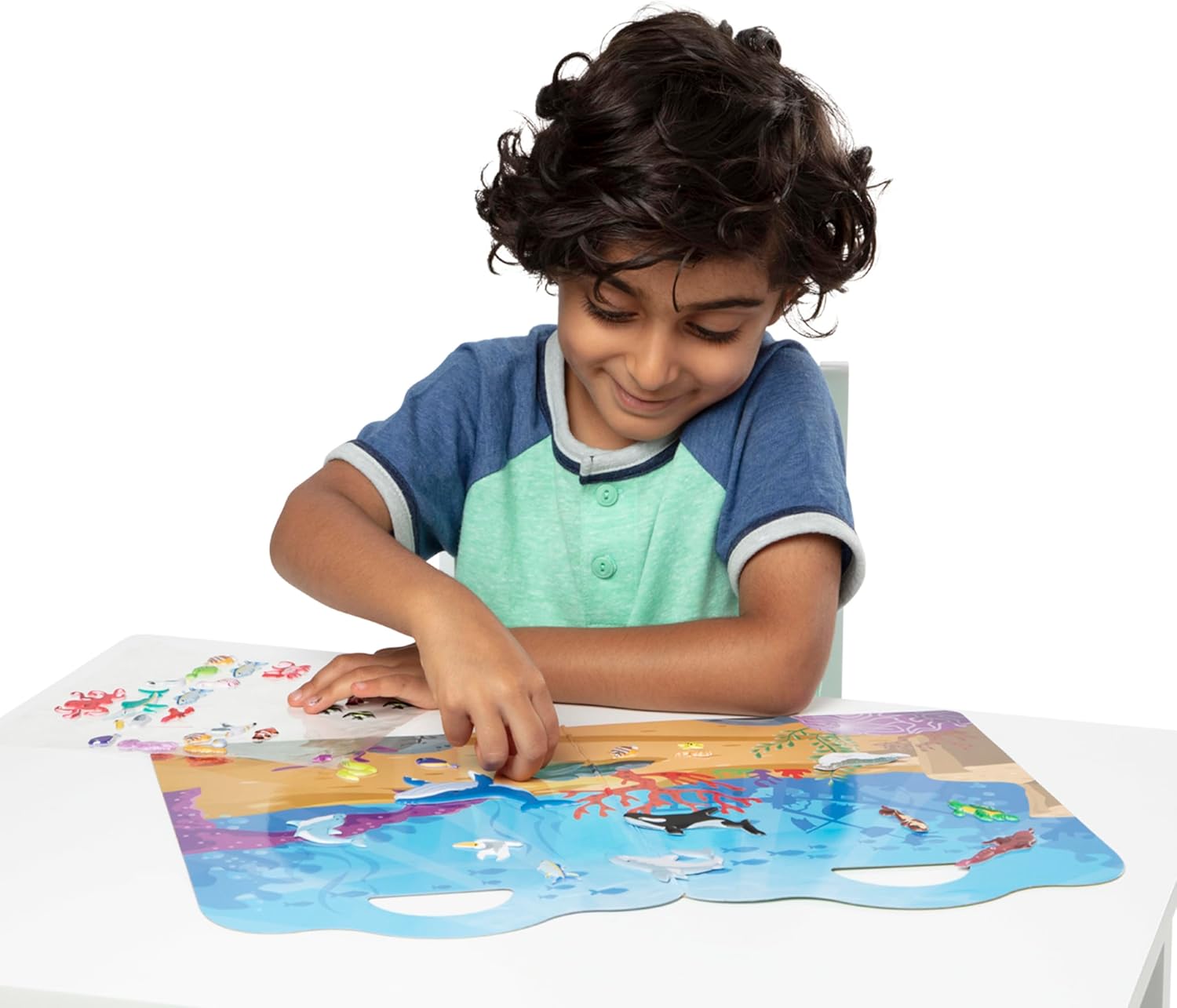 These reusable puffy stickers let kids create underwater adventures again and again! Tell countless stories with these fun dimensional stickers and scenes. Just place and layer the sea creature puffy stickers onto the double-sided background board of the coral reef or island cove scenes. Ready for a story change? It's easy to lift, switch, layer, and rearrange it all to depict whatever ocean tale a child can imagine! The built-in sticker collection--40 reusable puffy stickers in all--offers endless opportunities for kids to express their creativity and have lots of pretend-play fun, all while improving fine motor skills and communication. It's great for travel, too: The sturdy background board (with built-in handle!) folds to neatly store it all away.