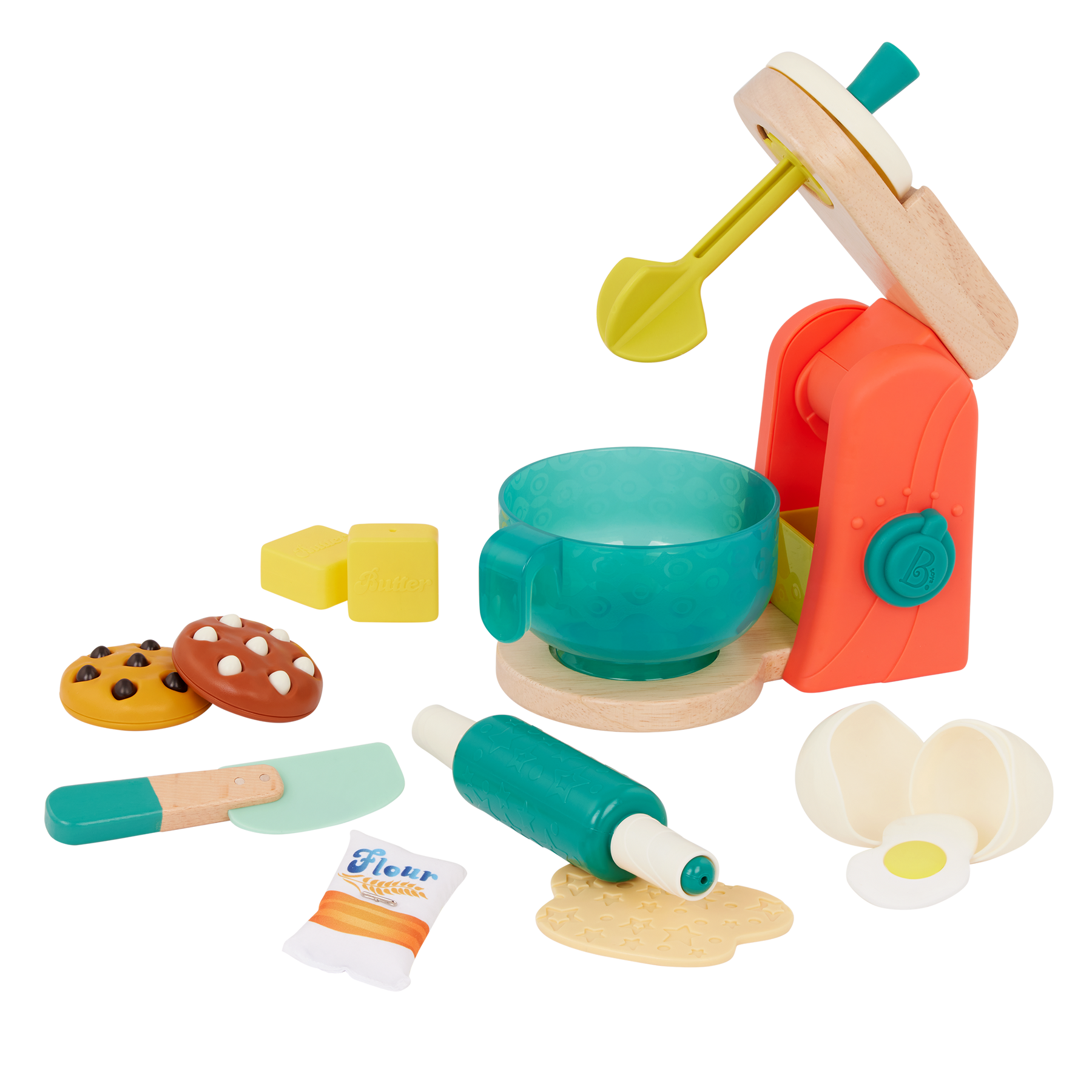 Cookies or cake – what will you bake? The Mini Chef - Mix & Bake Playset from B. toys has everything little bakers need to whip up sweet pretend treats. Kids can crack an egg into the sturdy stand mixer, add flour and butter, then turn the handle to watch the whisk spin. The mixer is entirely kid-powered – no batteries required! When the dough is ready to go, children can also grab the spatula to scrape it out of the bowl and use the rolling pin to flatten it. Not to mention, this pretend play set comes with a couple o’ chocolate chip cookies! But that’s only the beginning. With these colorful and tiny hands-friendly toys, kids can transform their play space into a make-believe bakery and cook up countless treats. Discover the full Mini Chef collection from B. toys to find more role-play sets for the little chef in your life! Recommended for children 3 years and older.