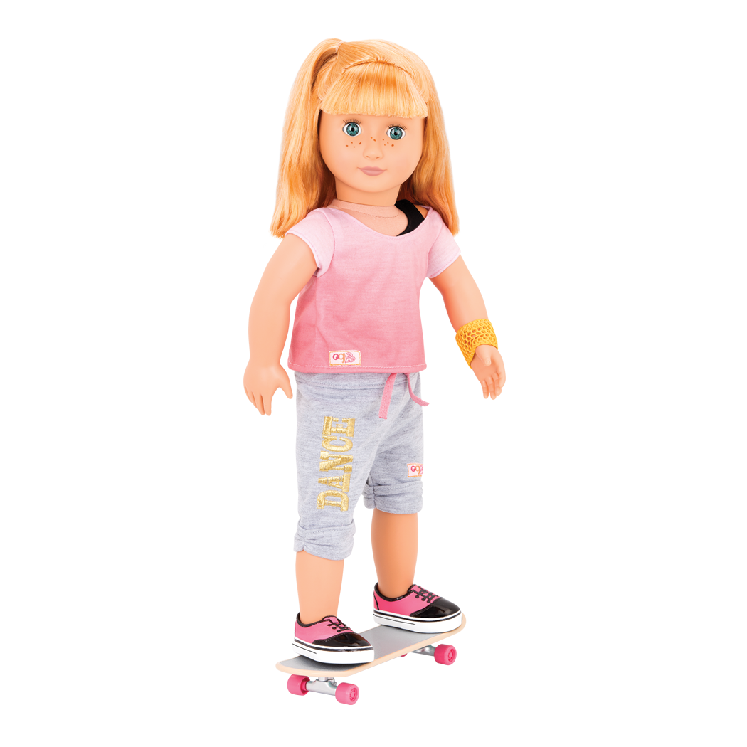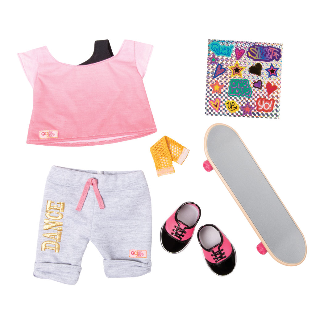 Cruise around downtown in style with the Our Generation OG Fly skateboard outfit for 18-inch dolls! This great look for days in the city will have your dolls practicing their moves in no time! Dress your dolls in the comfy outfit with casual style, starting with a cute off-the-shoulder pink ombre-dyed top. The cozy gray sweatpants with an embroidered "DANCE" logo will give your dolls room to move, whether they're skateboarding on the miniature doll skateboard or showing their moves as they groove to a great song. The cool skateboarder-style pink and black sneakers are great for skateboarding and walking around the neighborhood with friends. And your dolls can add a personal touch to their skateboard and other gear with the sheet of fun and sparkly stickers! This clothing set is compatible with most 18-inch dolls, doll clothes, and accessories. Dolls sold separately.
