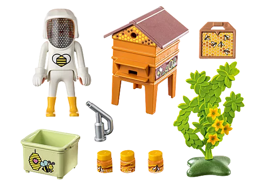 Bees are among the most important pollinators and are of ernomerous importance for our ecosystem. Honey bees feed mainly on sweet plant juices such as nectar and live together in colonies. Beekeepers deal with the keeping, breeding and reproduction of honey bees and with honey production. With the PLAYMOBIL playset Beekeeper, children can immerse themselves in the exciting world of beekeeping and honey production.