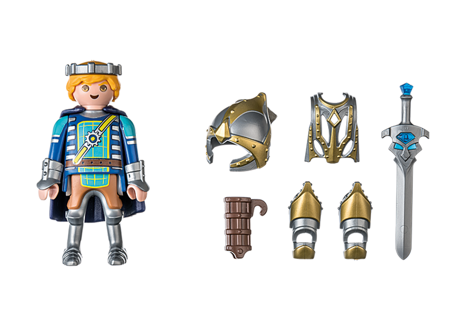 This 11-piece knight toy includes Novelmore character Prince Arwynn with crown, cape, quiver, helmet, breastplate and other extras for exciting knightly adventures. Arm cuffs, cape and weapon holder can be removed and replaced with Invincibus armor helmet and harness. Also included in the set are great stickers and an Arwynn trading card. Play with this set on its own or combine with the other knight toys of the Novelmore world.
