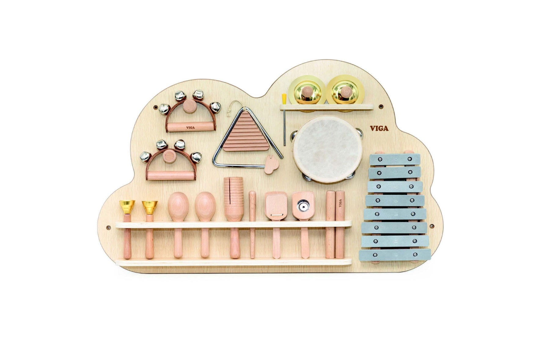 This music wall activity panel features 12 percussion instruments that allow children to explore different sounds and rhythm of the percussion world.