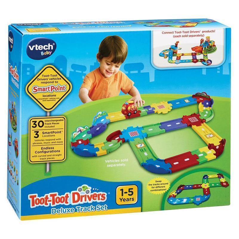 The possibilities are endless with the Toot-Toot Drivers® Deluxe Track Set by VTech®! With 30 interchangeable track pieces and multiple track configurations children can build an exciting circular track, or connect to other Toot-Toot Drivers play sets to expand their Toot-Toot Drivers world. The tracks feature 3 SmartPoint locations that trigger fun phrases, sounds and music when a Toot-Toot Drivers vehicle is driven over. Help your child to explore their creativity and imagination as they design their own Toot-Toot Drivers® world! (SmartPoints work only with SmartPoint vehicles) Encourages independent play and discovery & exploration.