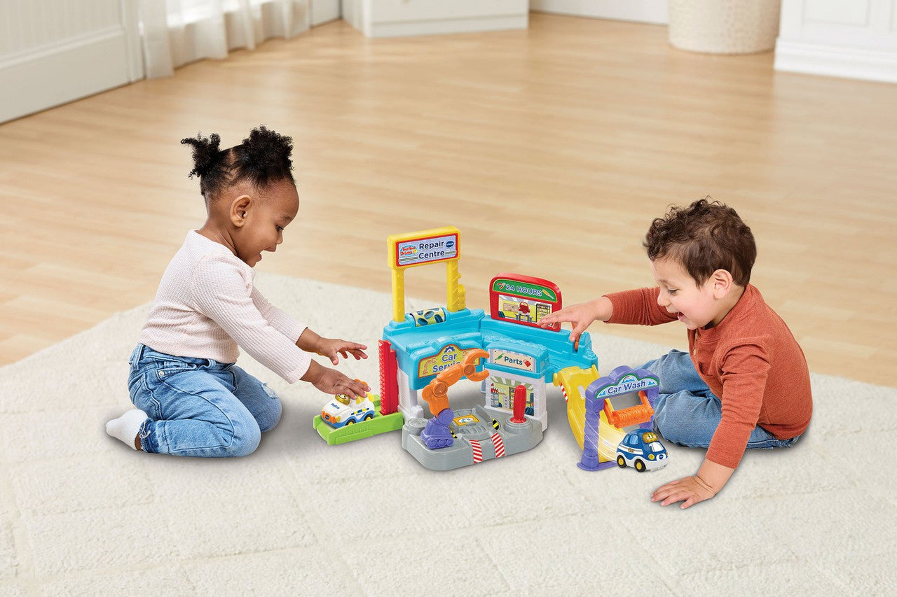 Zoom into the play zone with the Toot-Toot Drivers Repair Centre by VTech! Lift, fix and learn with this fun play set! Includes a repair base with cool moveable claw so you can move the included SmartPoint car around to ‘fix’ it. Car lift lets you move the car from floor to floor to reach the interactive tyre roller or to the role-play carwash. 3 SmartPoint locations add to the fun by triggering fun phrases, sounds and songs when driven over! You can also connect to other Toot-Toot Drivers play sets! (Each sold separately). Encourages language development, imaginative play and helps develop essential motor skills.