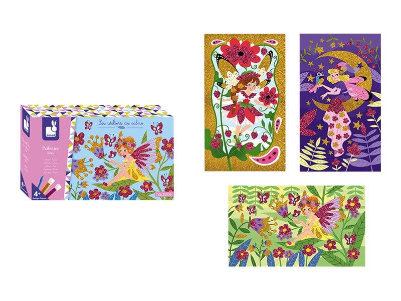 With this wonderful creative set from Janod, little artists can create three glitter boards featuring enchanting fairy motifs! Using the tool, the self-adhesive areas on the boards are exposed and sprinkled with glitter. This results in sparkling pictures of lovely fairies! Details: - Creative set glitter boards "Fairy" from Janod - Material for 3 beautiful cards - simply expose the adhesive areas and sprinkle with glitter Package contents: - 3 x sticker pictures - 2 x glitter - 1 x spatula - 1 x instructions Material: cardboard, plastic