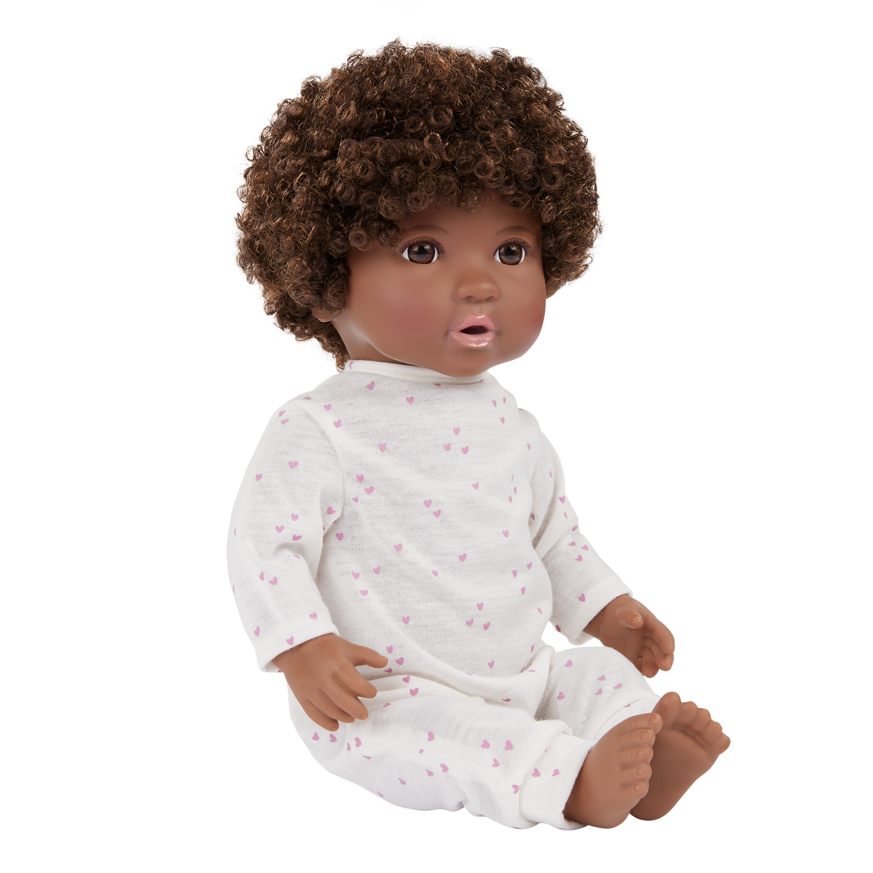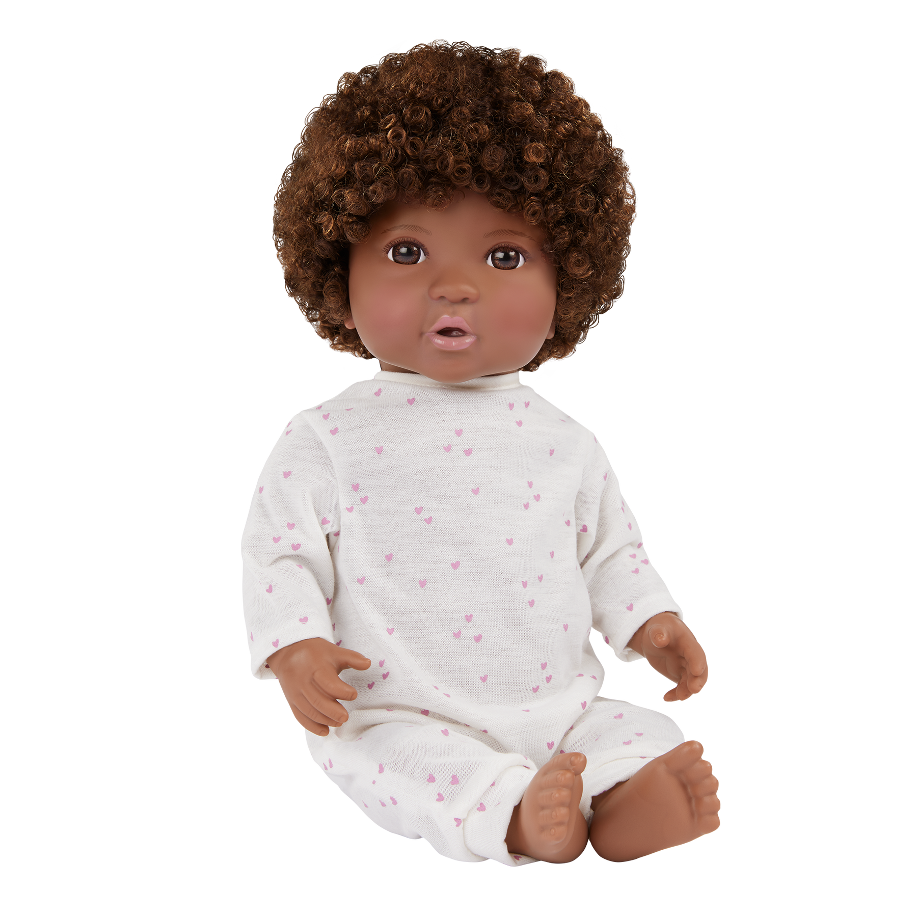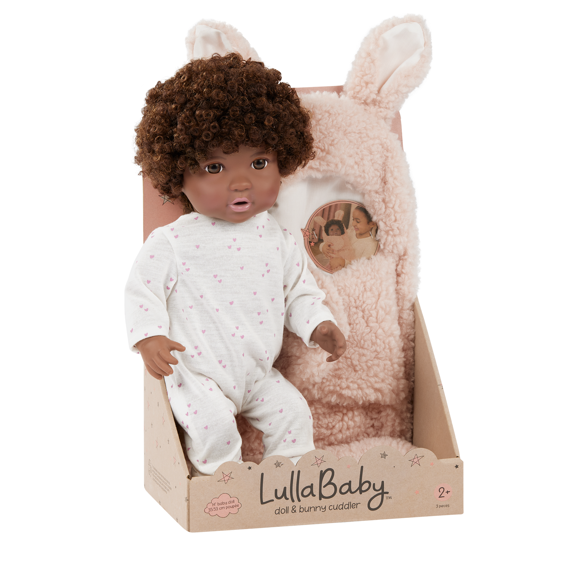 Discover precious playtime moments with LullaBaby. Made with lovable details and realistic features, this 14" baby doll has smooth brown hair to style, beautiful brown eyes with soft-to-touch eyelashes, and a cuddly soft body for little hugs. Plus, kids can explore sweet storytelling with baby's cozy pajamas and bear-themed cuddler for extra special snuggles. Both outfits feature easy-open closures to quickly put on and remove during changing and play time. LullaBaby dolls are a must-have for parents looking to nurture young hearts and minds at an early age, encouraging imagination, empathy, and kindness as kids play and grow with their baby dolls. Makes a wonderful gift for kids ages 2 years old and up and is the perfect first baby doll for toddlers. Safety tested to meet all regulatory phthalates and BPA requirements.