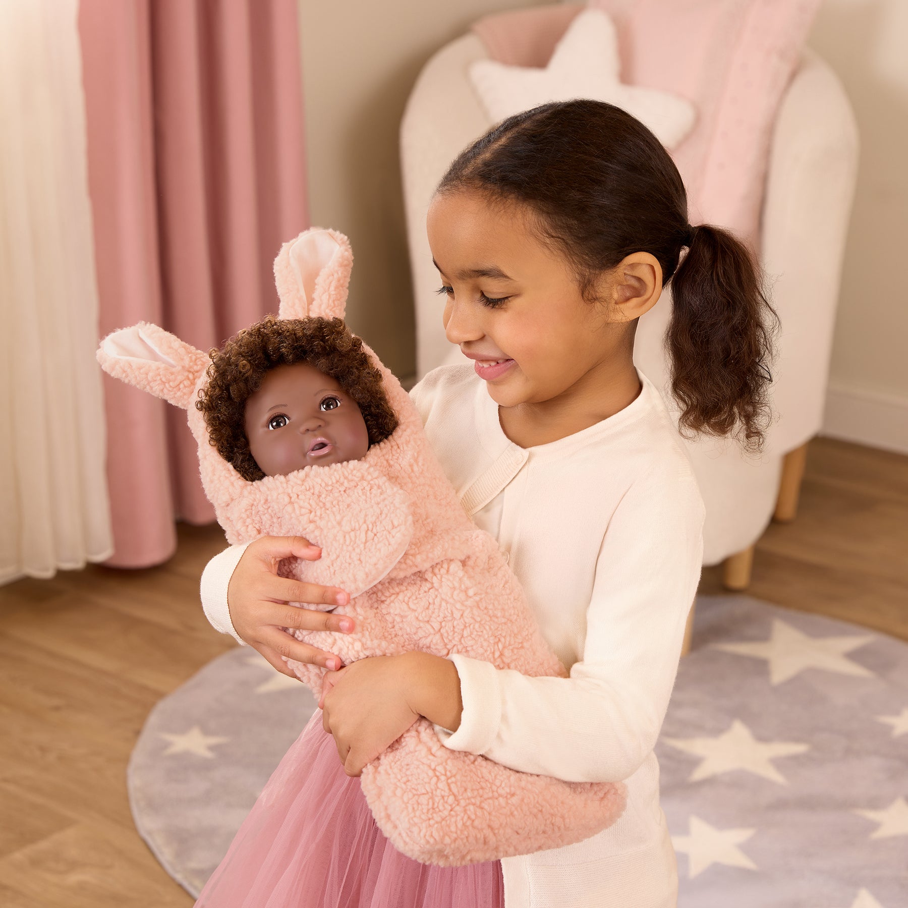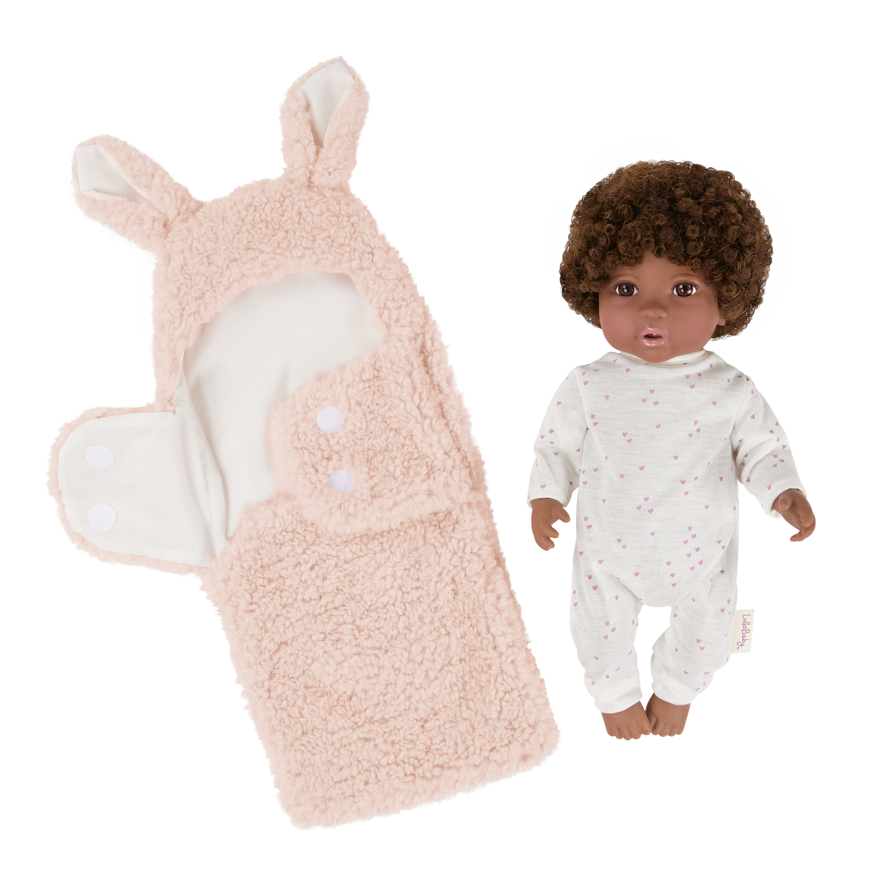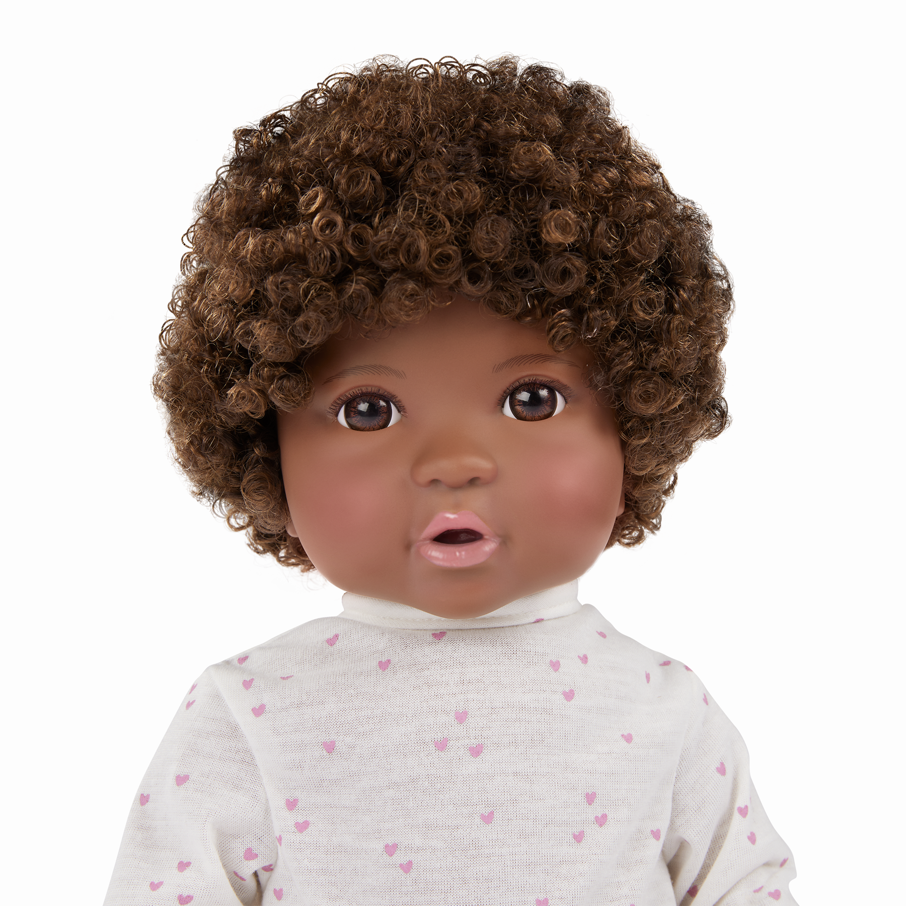 Discover precious playtime moments with LullaBaby. Made with lovable details and realistic features, this 14" baby doll has smooth brown hair to style, beautiful brown eyes with soft-to-touch eyelashes, and a cuddly soft body for little hugs. Plus, kids can explore sweet storytelling with baby's cozy pajamas and bear-themed cuddler for extra special snuggles. Both outfits feature easy-open closures to quickly put on and remove during changing and play time. LullaBaby dolls are a must-have for parents looking to nurture young hearts and minds at an early age, encouraging imagination, empathy, and kindness as kids play and grow with their baby dolls. Makes a wonderful gift for kids ages 2 years old and up and is the perfect first baby doll for toddlers. Safety tested to meet all regulatory phthalates and BPA requirements.