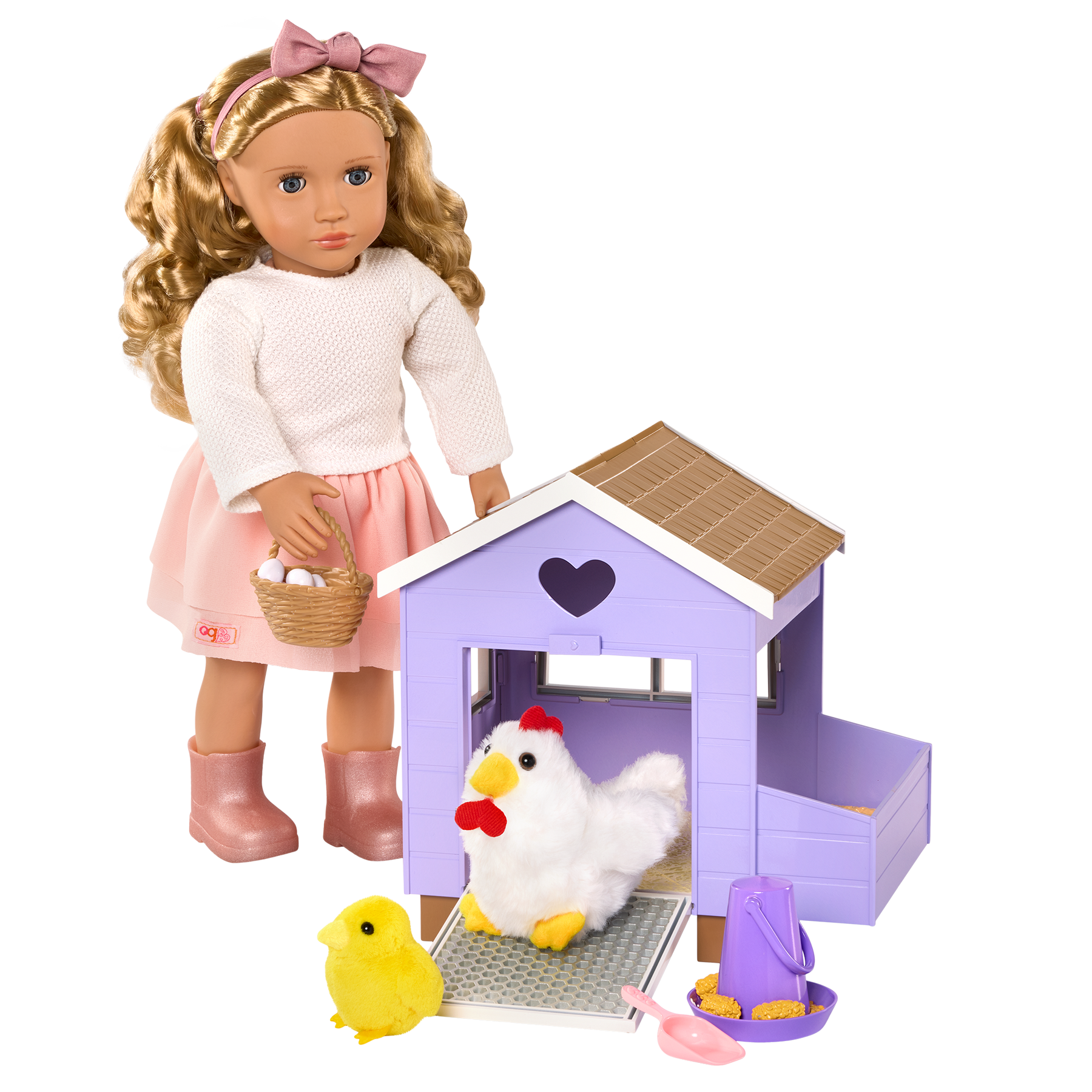 Rise and shine, it's farming time with the Our Generation Chicken Coop Playset for 46 cm dolls! This charming henhouse features functional details like an opening gable roof and a flip-down ramp for the animals to waddle in and out. Inside, kids will find a cozy hay-like design with nesting spots for each plushie. Plus, kids can help the chicken "lay" eggs by placing them inside the plushie as they play out the exciting role of a farmer! A feeder and scooper let young ones care for their feathery friends every day, while the carrying basket adds even more fun for collecting eggs and chicken feed clusters. Perfect for enhancing their doll collection, the Our Generation Chicken Coop Playset makes a great gift for kids ages 3 years old and up (small parts), encouraging imagination and nurturing a love for animals. Our Generation dolls sold separately.