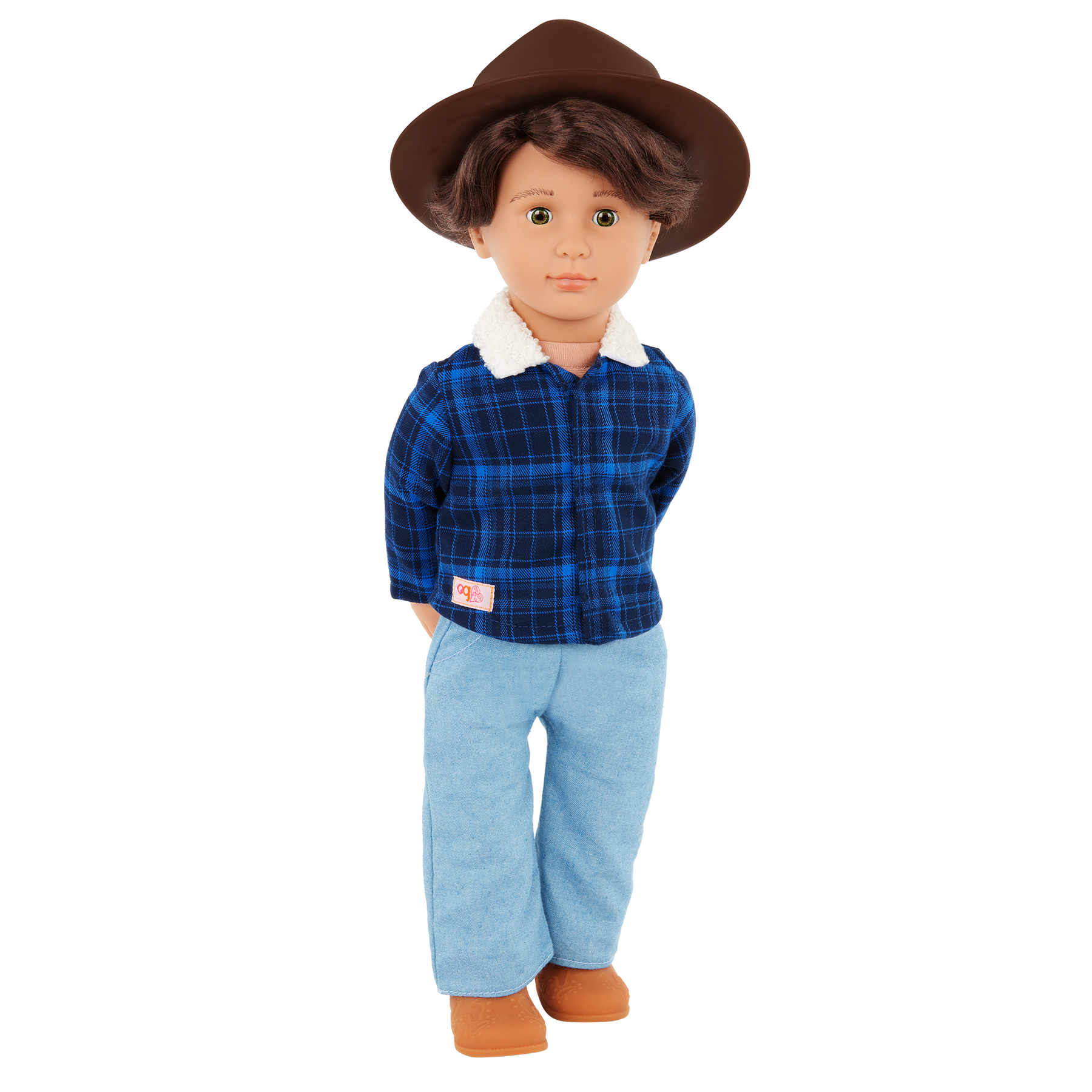 Giddy up with Our Generation 18-inch boy doll Dustin and discover fun adventures together! He has a huggable soft body and lifelike features that will delight doll fans during playtime. His hazel eyes open and close, and his wavy dark-brown hair is fun to style! Dustin is ready to hit the trails in his country-inspired outfit. He wears a blue plaid flannel-style top with a faux shearling collar, denim-style pants, a wide-brim hat, and boots for a complete western look. When it's time for dress-up, his outfit has easy-open closures to quickly put on and remove. So kids can mix, match, and create even more cool looks as they explore storytelling and self-expression. Our Generation dolls make a great gift for kids ages 3 years old and up (small parts), encouraging them to create their own unique stories.