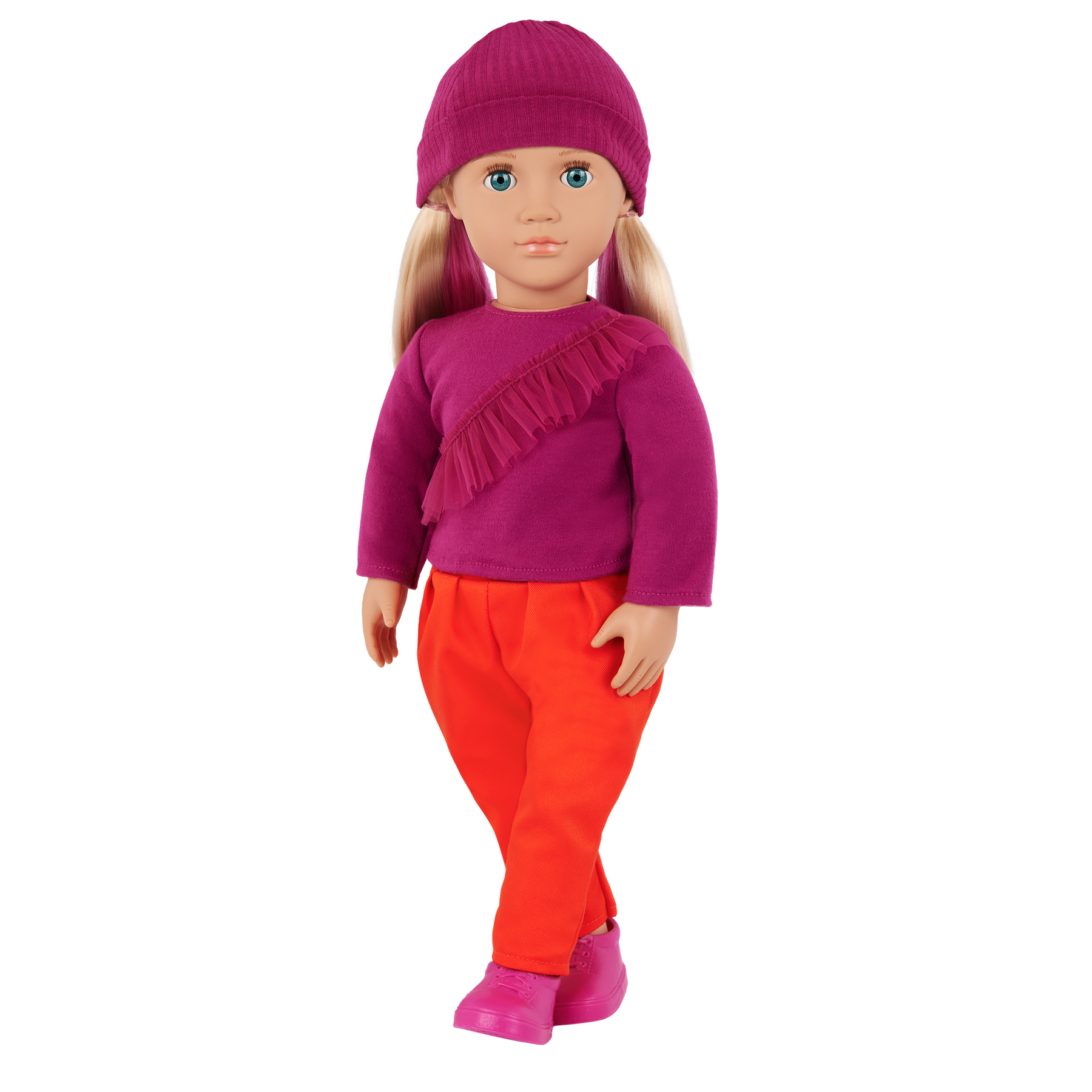 Friendship and fashion shine bright with Our Generation 18-inch doll Shay! Dressed in vibrant colors, she wears a fuchsia top with a ruffle tulle, a matching beanie hat, orange pants, and fuchsia shoes that complete this cute "color blocking" effect. Color-blocking outfits let creative fashion fans add cheery colors to their doll's wardrobe as they explore storytelling and self-expression. Shay has a huggable soft body and lifelike features that will delight doll fans during playtime. Her beautiful blue eyes open and close, and her blonde hair has fuchsia peekaboo highlights for extra bright styles! When it's time for dress-up, her outfit has easy-open closures to quickly put on and remove. So you can mix, match, and create even more stylish looks on any adventure. Our Generation dolls make a great gift for kids ages 3+ (small parts), encouraging them to imagine their own unique stories.