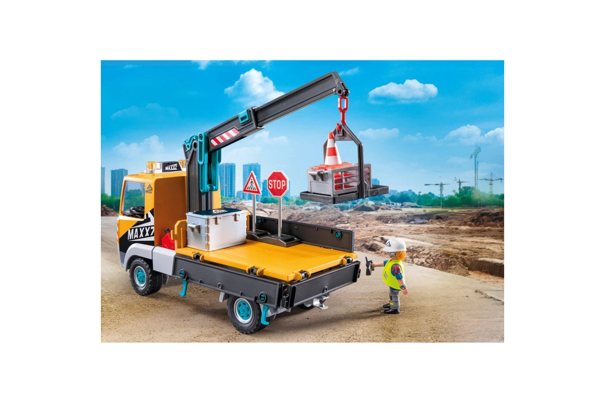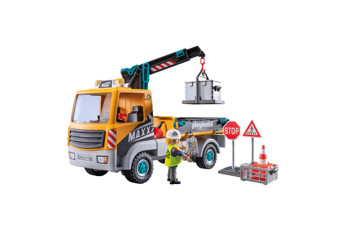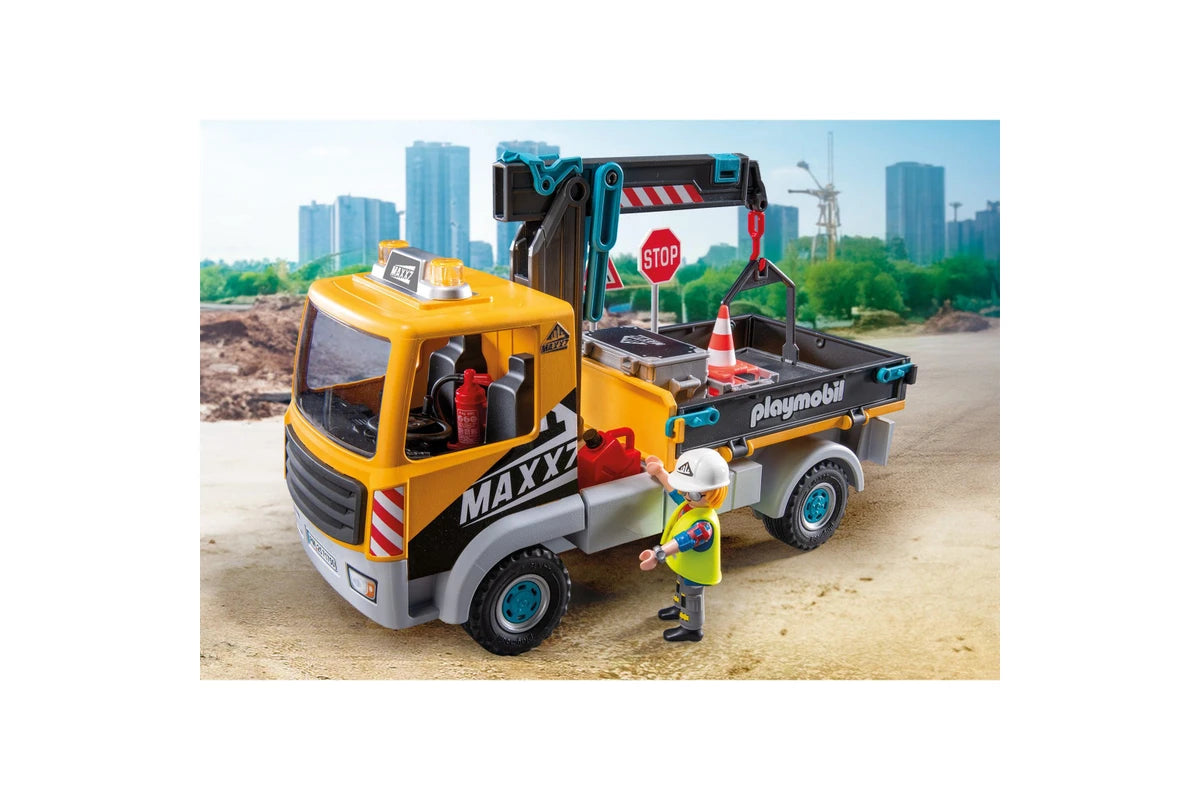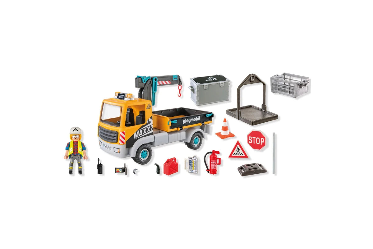 Figures: 1 man with construction helmet, Accessories: 1 construction site truck with removable roof and extendable and swiveling transport crane, 1 transport box for crane, 1 construction site equipment, 1 oil canister, 1 traffic cone, 1 safety vest, 1 notepad, 1 camera.